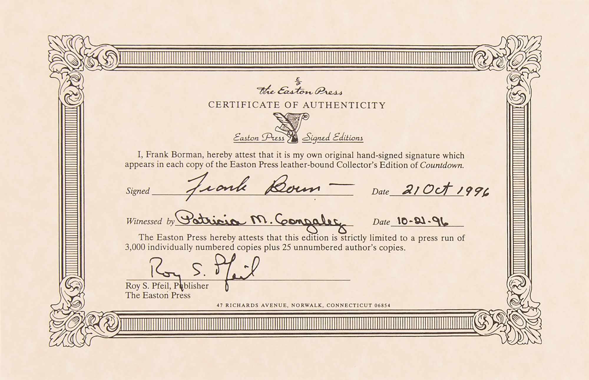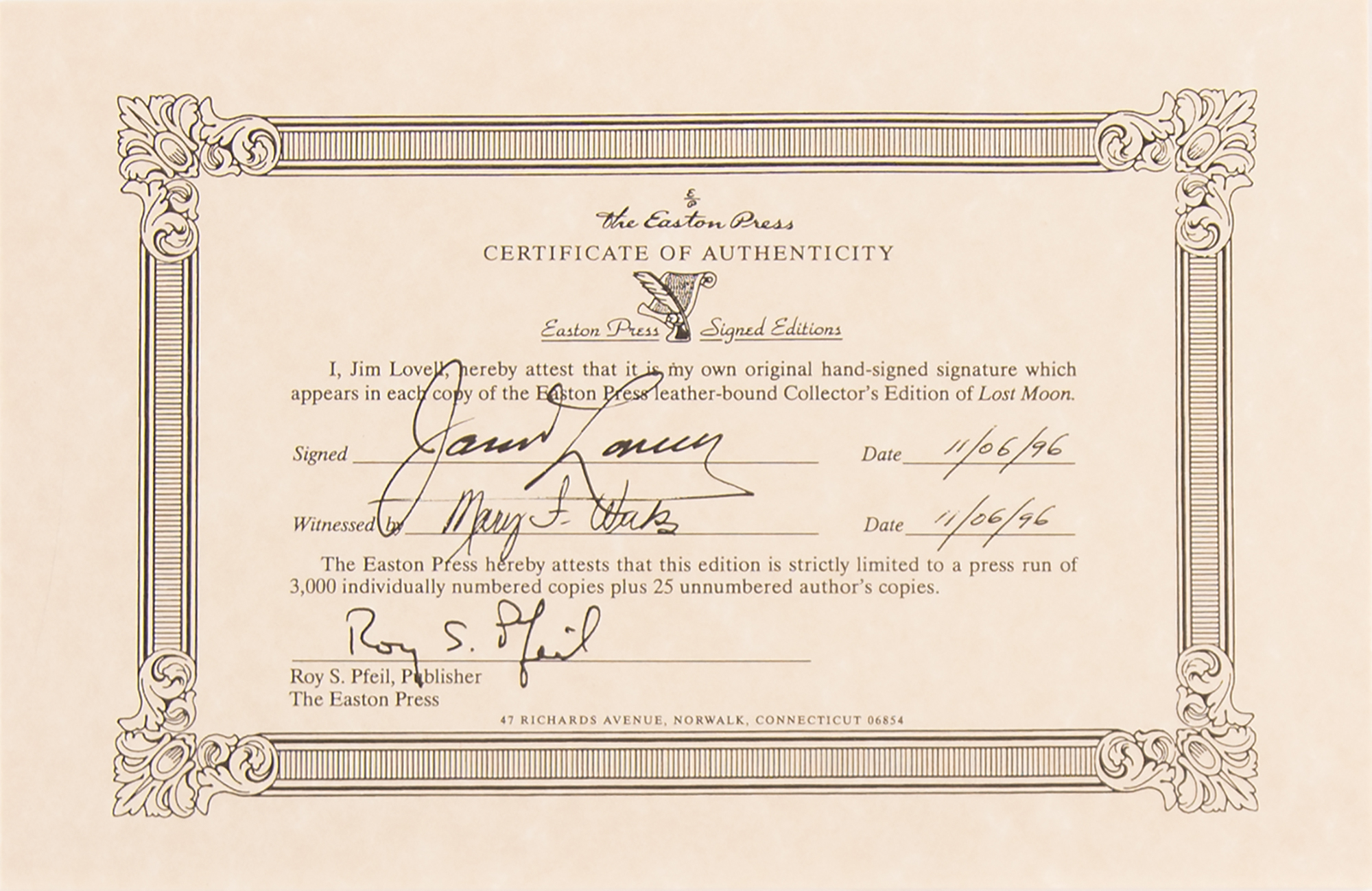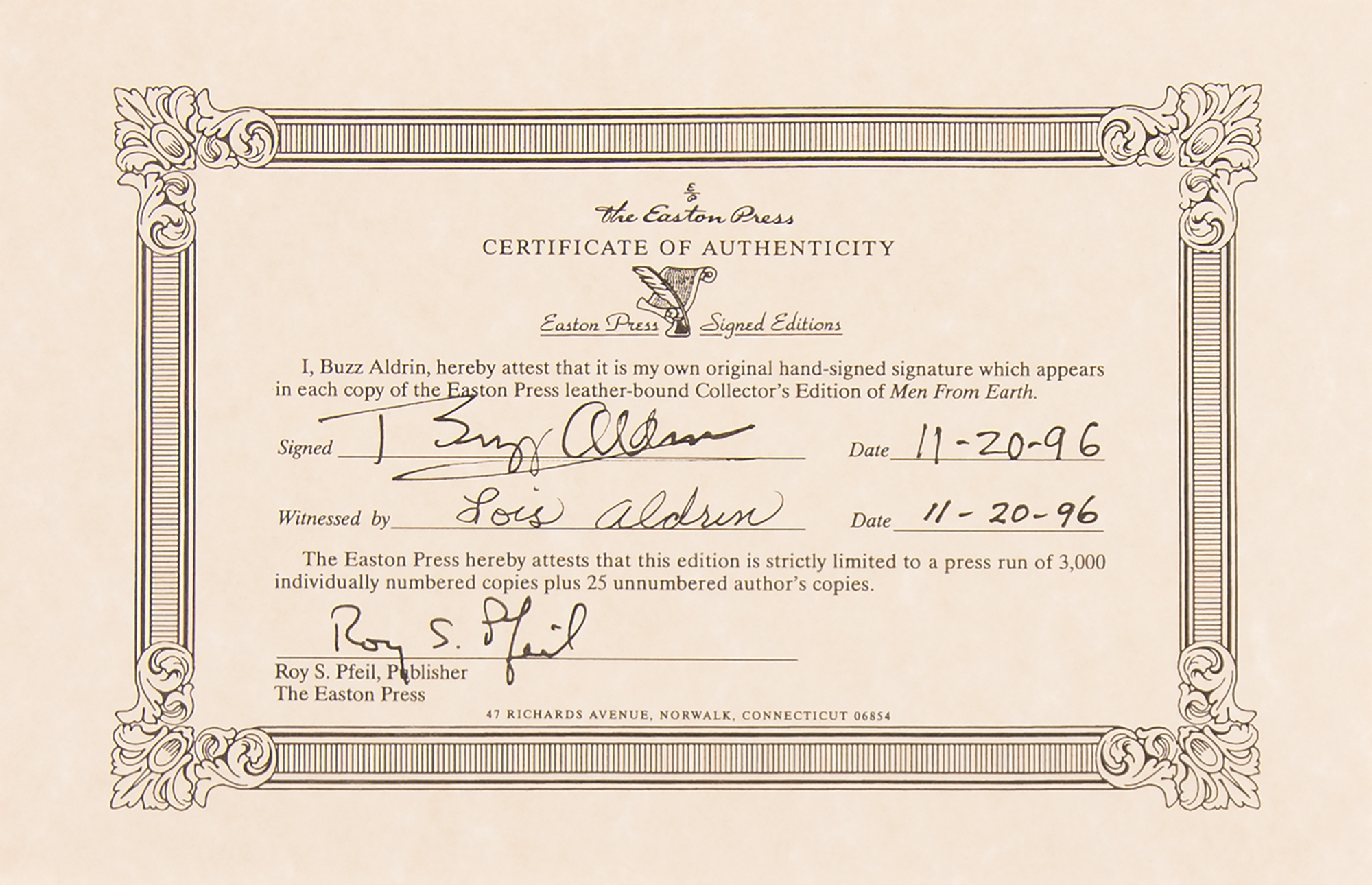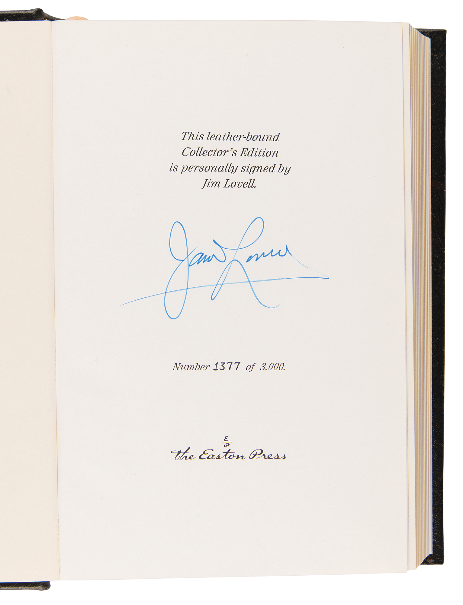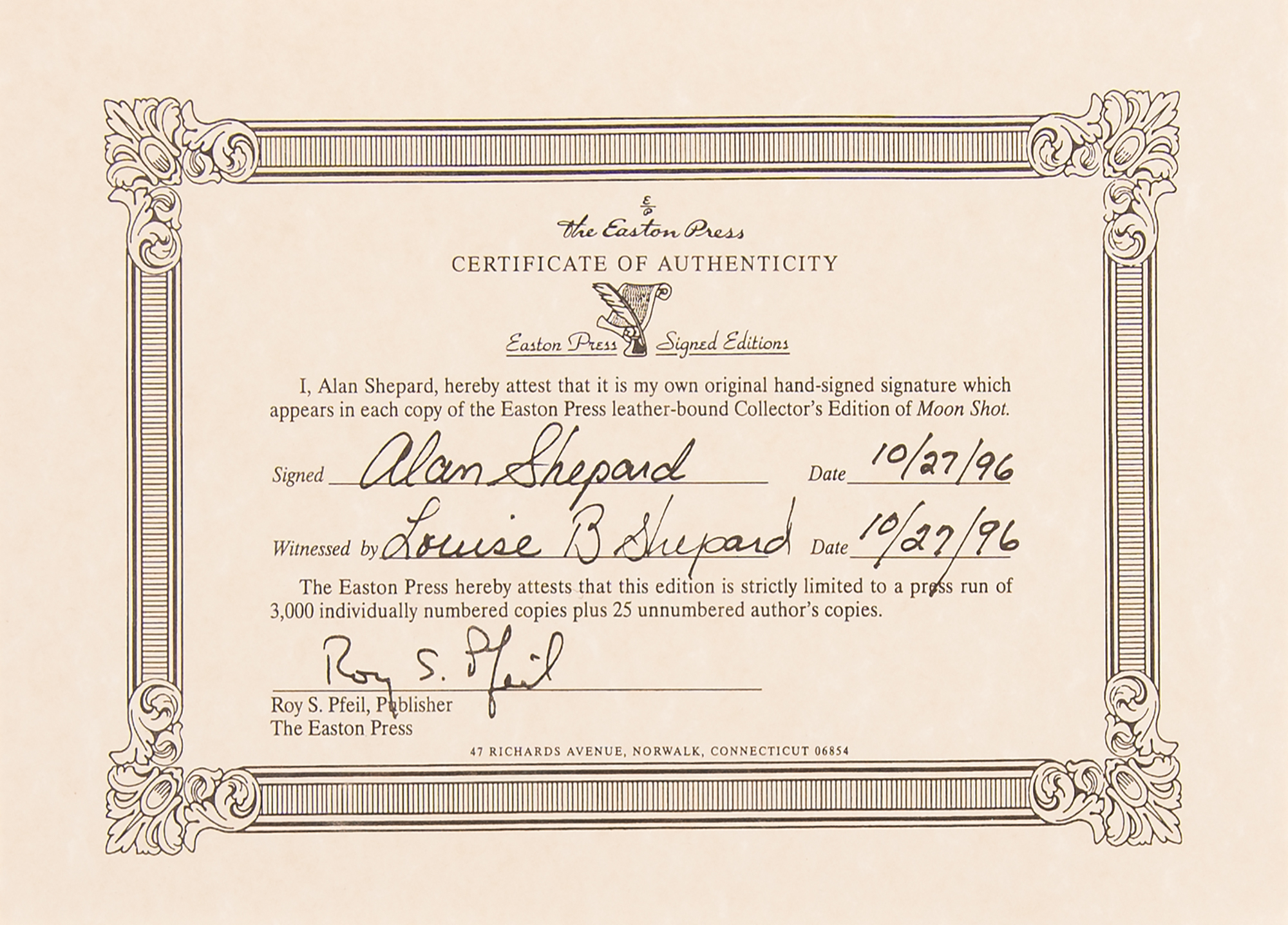 Signed books: a six-volume set of The Astronaut’s Library. Each a limited collector’s edition, numbered 1377/3000. Leatherbound hardcovers, 6.25 x 9.25. Each book is signed on the colophon in ink by one or more astronauts, including: We Seven (Scott Carpenter, Gordon Cooper, and John Glenn), Men from Earth (Buzz Aldrin), Lost Moon (Jim Lovell), Countdown (Frank Borman), Schirra’s Space (Wally Schirra), and Moon Shot (Alan Shepard). In overall fine to very fine condition. Each accompanied by the publisher’s certificate of authenticity.