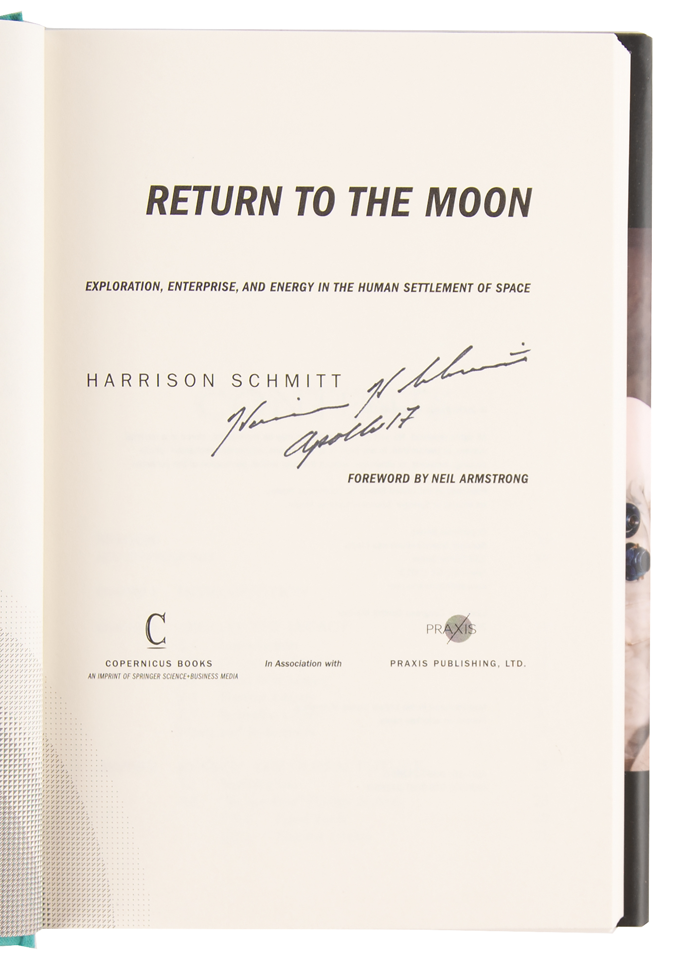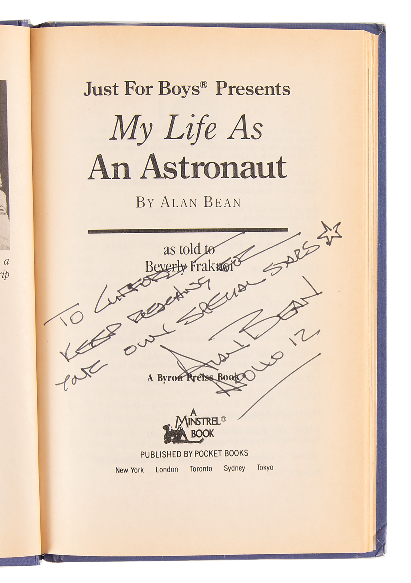 Group lot of six books, all hardcovers with dust jackets, each signed on the title page in ink by an Apollo moonwalker, with most inscribed. Includes: Buzz Aldrin (Men from Earth), Alan Bean (My Life as an Astronaut, ins), Alan Shepard (Moon Shot), Edgar Mitchell (The Way of the Explorer, ins), Jim Irwin (More than an Ark on Ararat, ins), and Harrison Schmitt (Return to the Moon). In overall fine condition.