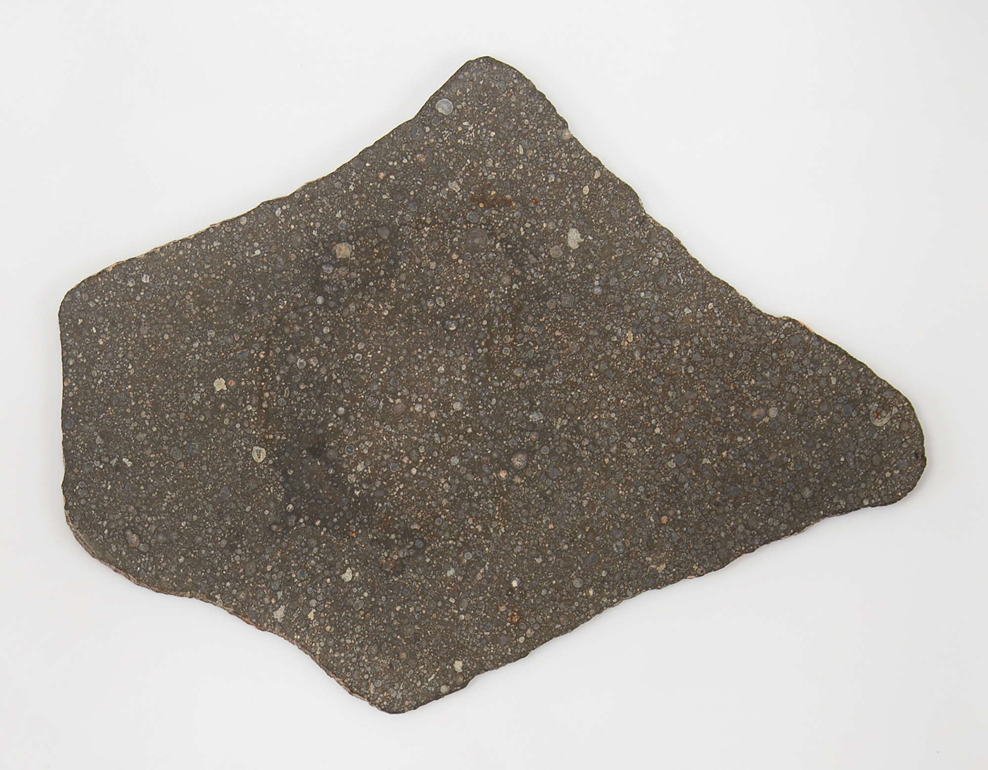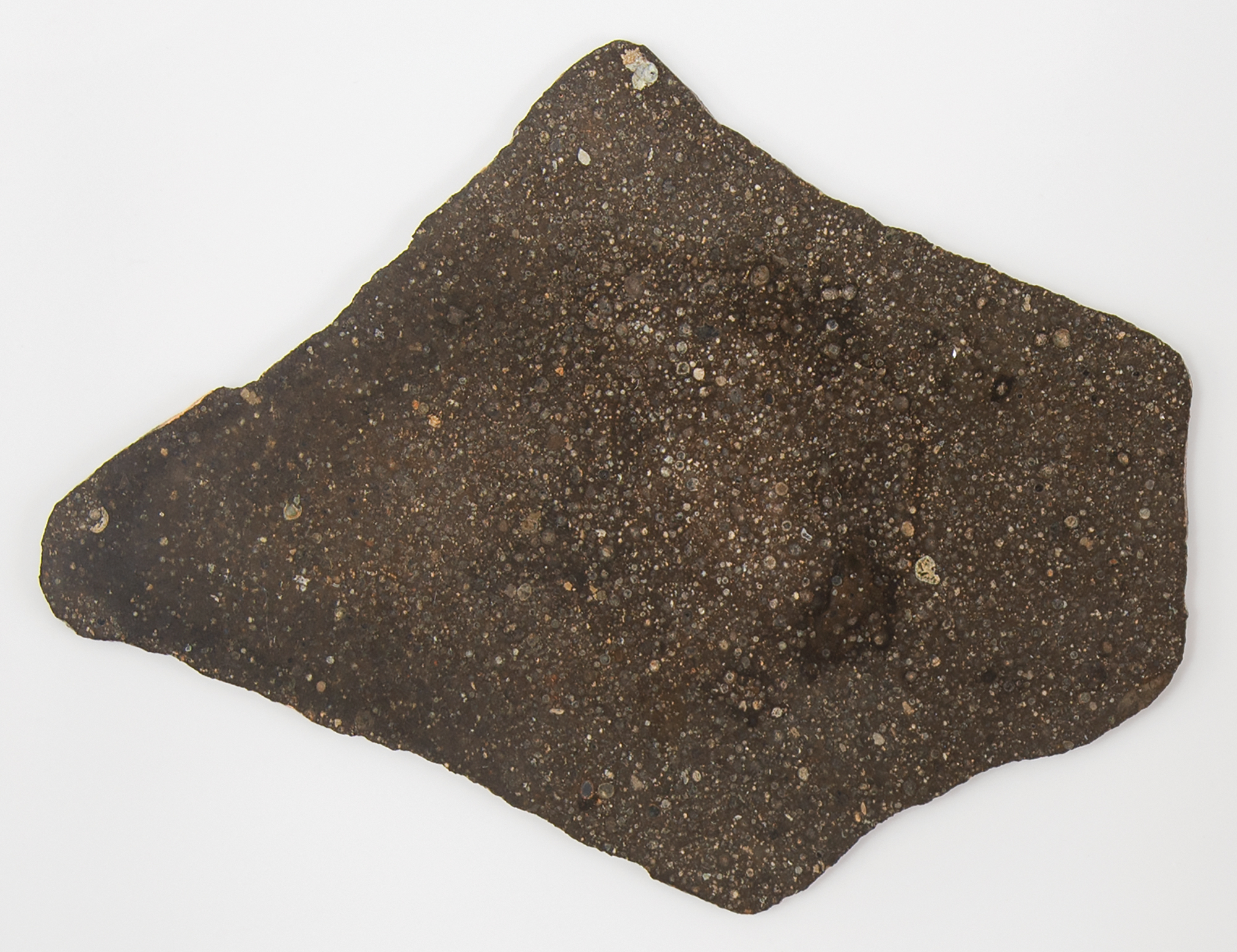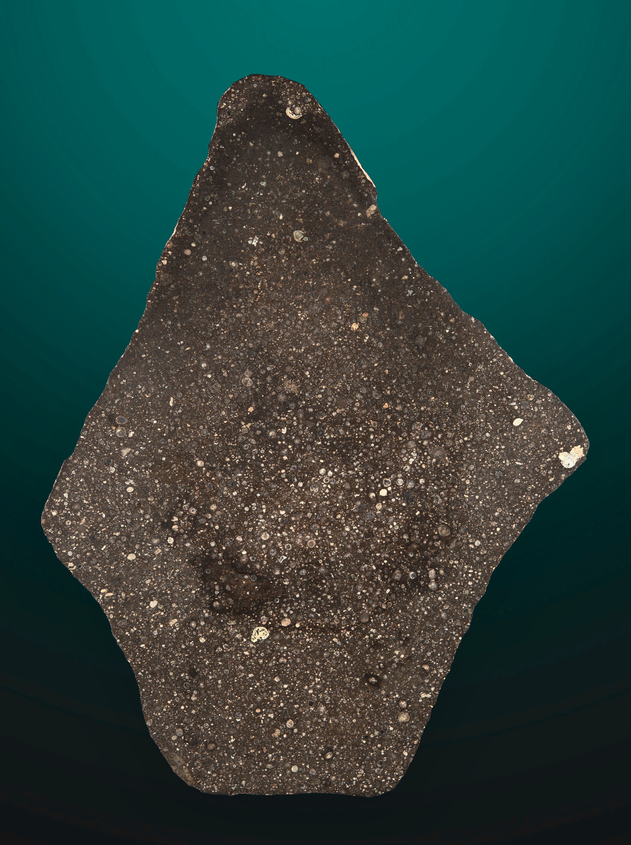 The NWA 16811 meteorite was discovered in 2024 in the Sahara Desert. It was subsequently classified as a CVox3 meteorite with a weight of 11.2 kg in a single stone. Chondrules together with calcium aluminum-rich inclusions (CAIs) can be seen in its matrix . CAIs are the oldest-known solid materials in the Solar System, formed by the condensation of elements from the hot, turbulent nebular gas disk surrounding the young Sun. They also provide the oldest radiometric ages for solids, establishing the age of the Solar System at approximately 4.568 billion years. In this slice, both chondrules and CAIs are featured, making it a true time-capsule of the beginning of the Solar System.