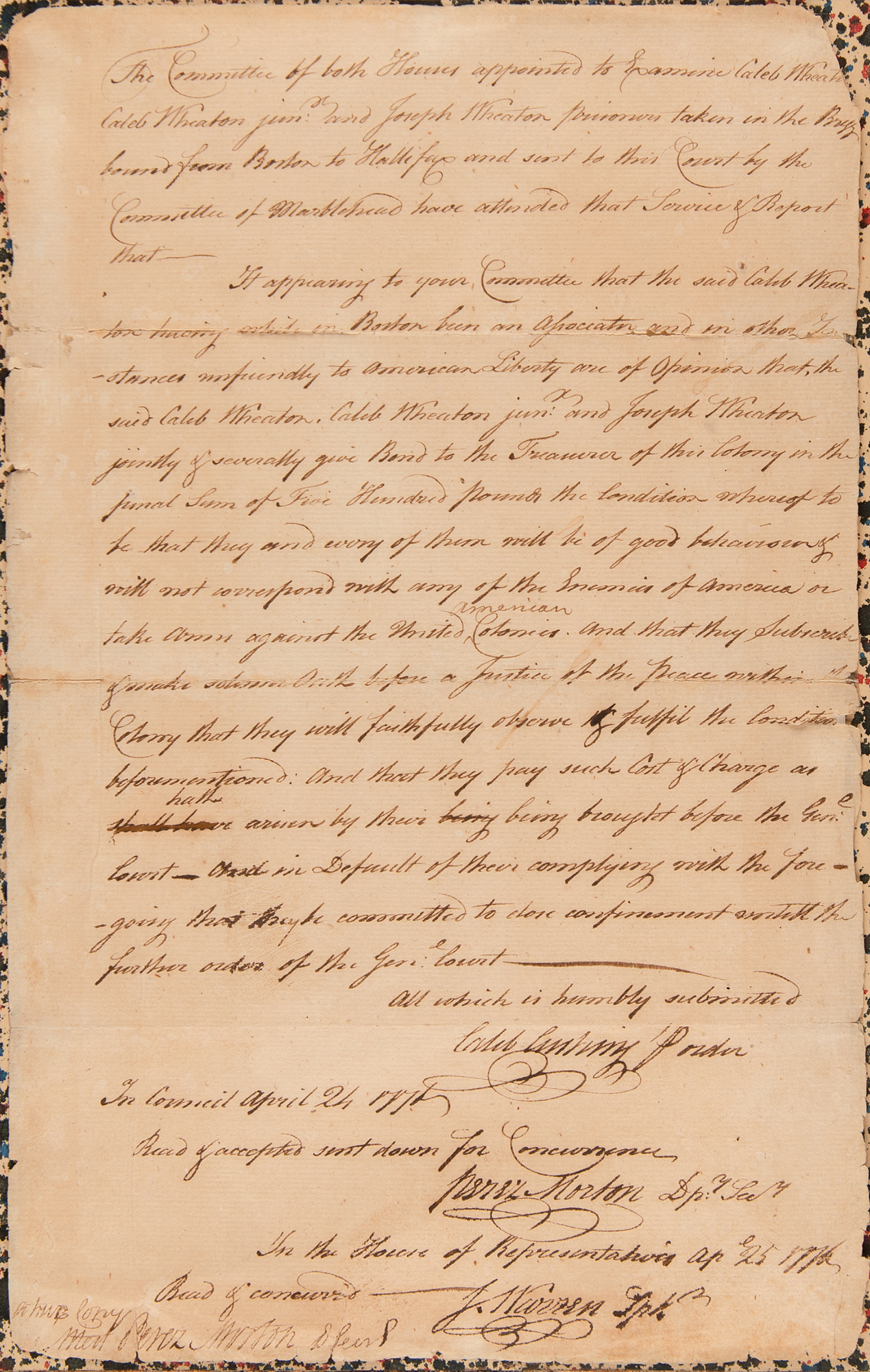 Revolutionary War-dated manuscript DS, one page, 8.25 x 13.25, April 24, 1776. Committee report from the Massachusetts General Court, in part: "The Committee of both Houses appointed to Examine Caleb Wheaton, Caleb Wheaton jun’r and Joseph Wheaton prisoners taken in the Brigg bound for Boston to Hallifax and sent to this Court by the Committee of Marblehead have attended that Service & Reports that…if [they] jointly & severally give Bond to the Treasurer of this Colony in the penal sum of Five Hundred pounds the condition whereof to be that they and every of them will be of good behavior & will not correspond with any of the Enemies of America or take arms against the United American Colonies…that they be committed to close confinement until the further order of the Gen. Court.” Signed at the conclusion by Caleb Cushing, Perez Morton, and Joseph Warren. Impressively mounted and framed with a modern print of Paul Revere’s engraving of the Boston Massacre to an overall size of 28.5 x 23.25. In very good to fine condition, with soiling, light creasing, and short edge tears.