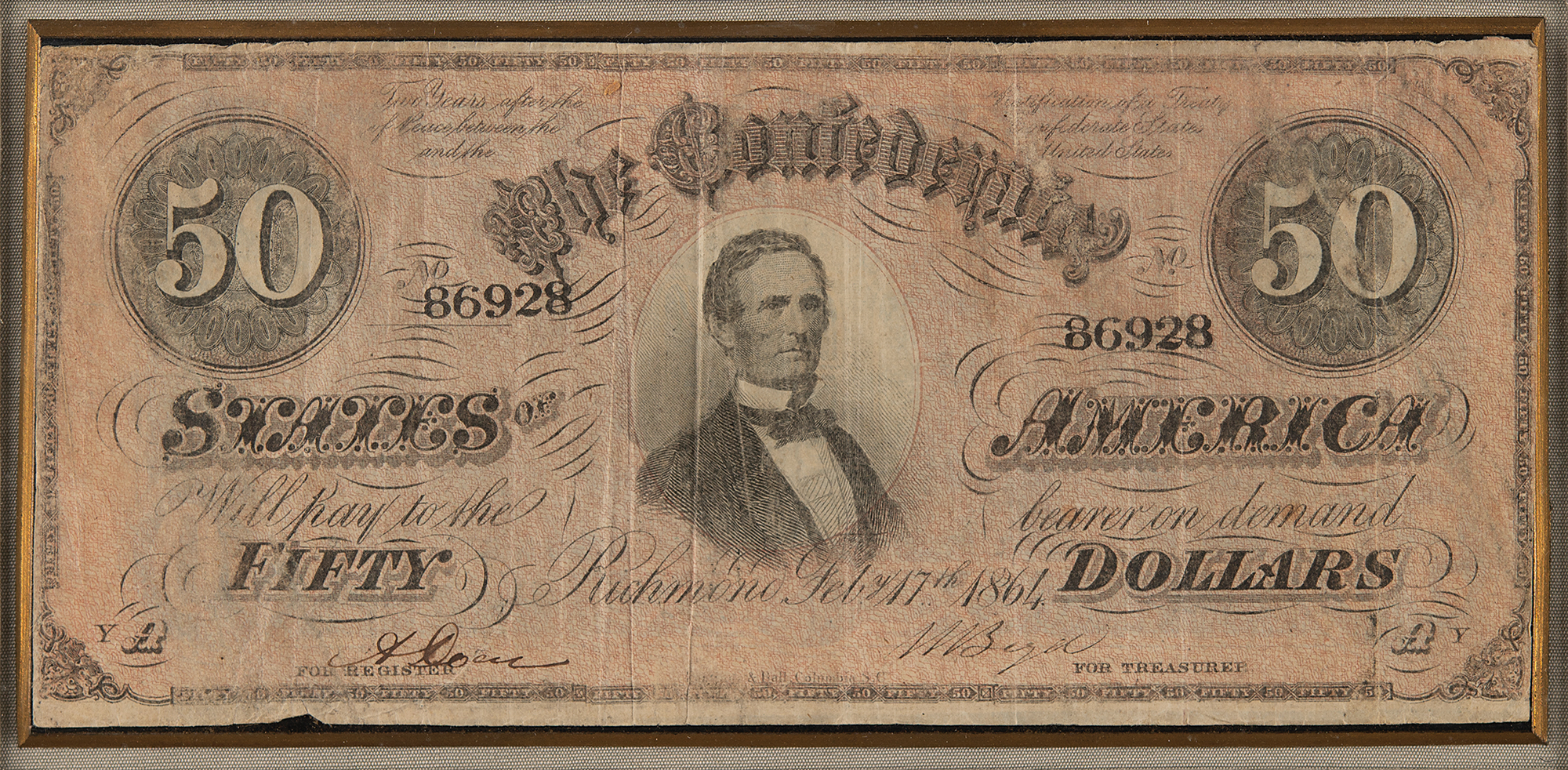 Confederate States of America 50-dollar banknote, 7.25 x 3.25, with the front featuring a central portrait of Confederate President Jefferson Davis, with plate letter ‘Y,’ serial number ‘86928,’ and date of February 17, 1864. Mounted and framed to an overall size of 12 x 9. In very good to fine condition, with light folds and creases, and expected wear.
