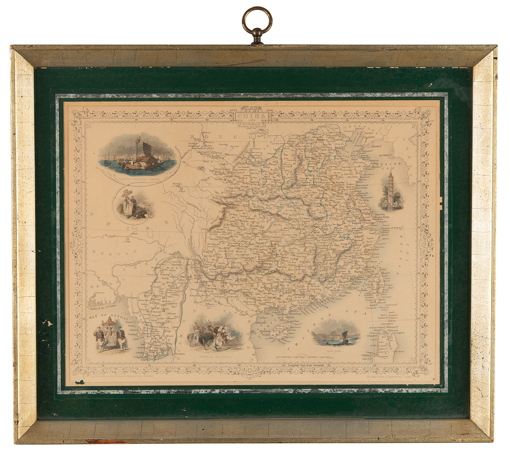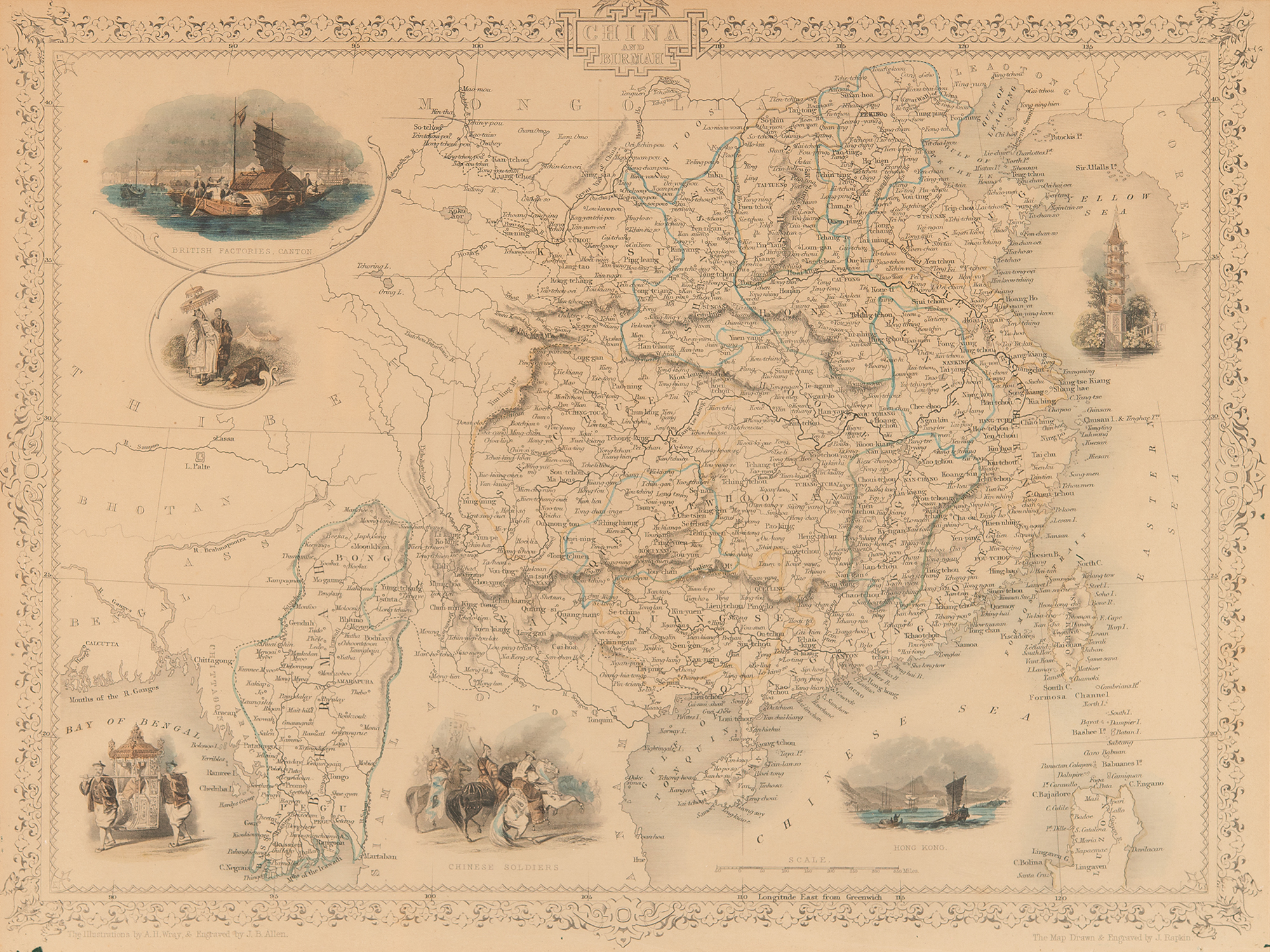 Antique mid-19th-century color map of “China and Birmah,” 13.5 x 10.25, which was drawn and engraved by J. Rapkin (vignettes by A. H. Wray & J. B. Allen) and published in John Tallis’s Illustrated Atlas (London & New York: John Tallis & Co., c.1851). The Illustrated Atlas, published from 1849 onwards, was the last decorative world atlas. The course of the Great Wall of China is marked on the map, and the borders feature illustrated views of Hong Kong, British factories in Canton, a pagoda, Chinese soldiers, and Chinese noblemen. Matted and framed to an overall size of 17 x 14.25. In fine condition.