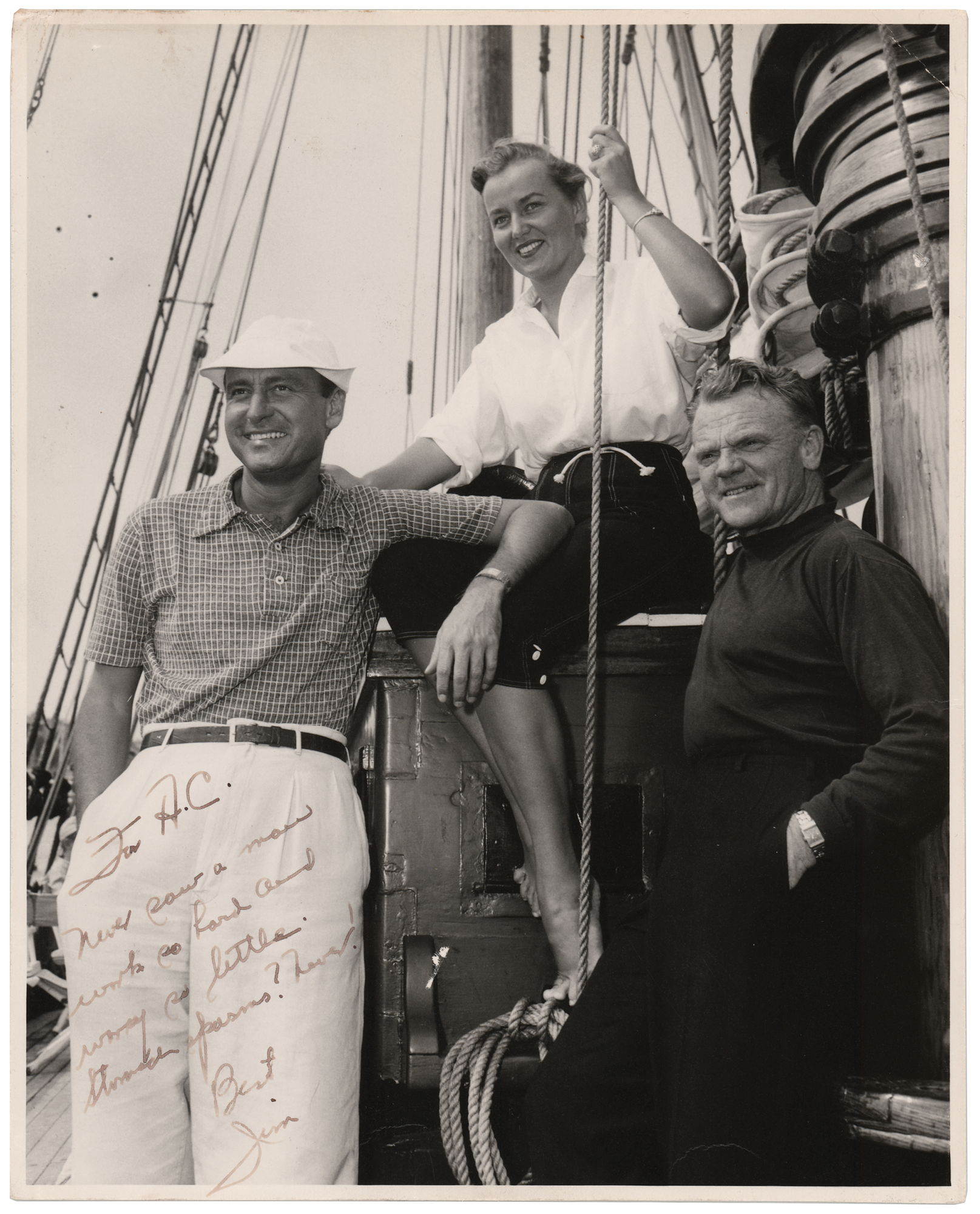 Vintage matte-finish 7.75 x 9.75 photo of James Cagney on the deck of a ship with film producer A. C. Lyles and the latter’s wife, Martha French, signed and inscribed in fountain pen to Lyles, “For A. C., Never saw a man work so hard and worry so little. Stomach pains? Never! Best, Jim.” In fine condition. Lyle’s first role as full-time producer was on Cagney's sole directorial effort, the 1957 Short Cut to Hell (a remake of the 1941 noir classic This Gun for Hire).
