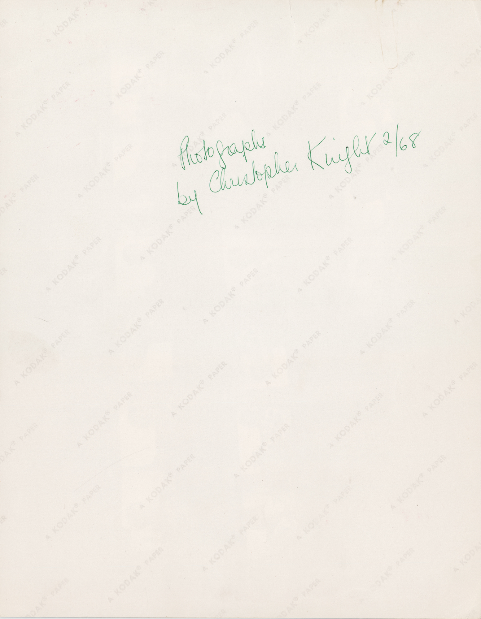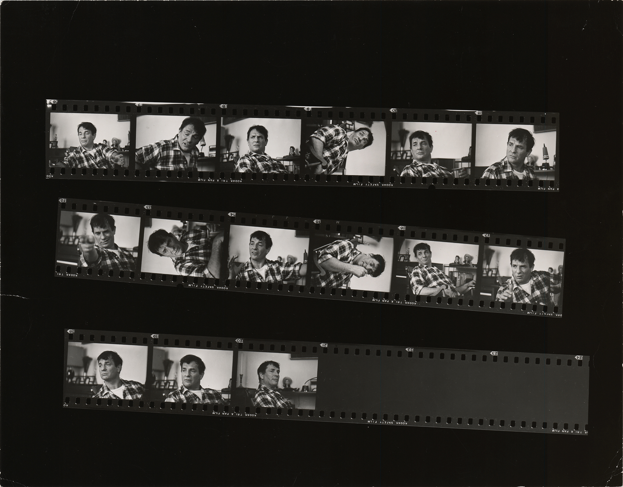 Jack Kerouac's original vintage circa 1968 glossy 11 x 8.5 silver gelatin contact sheet photograph by Chrisopher Knight, featuring 15 images of Kerouac in an animated storytelling mode, dressed in a flannel shirt and seated in a relaxed manner. Reverse bears "A Kodak Paper" watermarks and is annotated in green ink, "Photographs by Christopher Knight, 2/68." In fine condition, with a few light creases and one tiny edge tear.