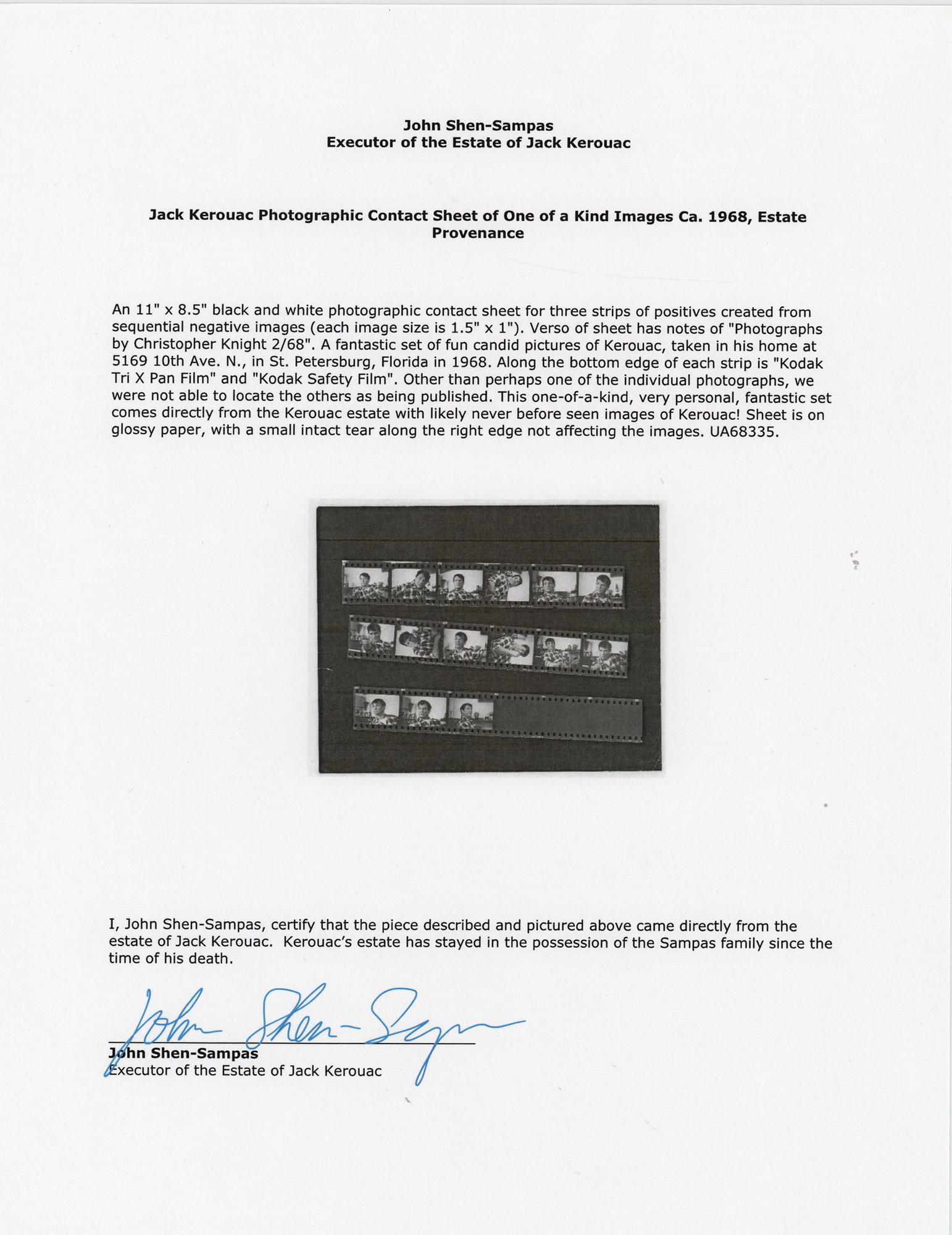 Accompanied by a letter of provenance signed by John Shen-Sampas, the executor of the estate of Jack Kerouac; Shen-Sampas is the son of John Sampas, who was Kerouac’s brother-in-law and literary executor. Shen-Sampas notes that "aside from perhaps one of the individual photographs, we were not able to locate the others as being published."