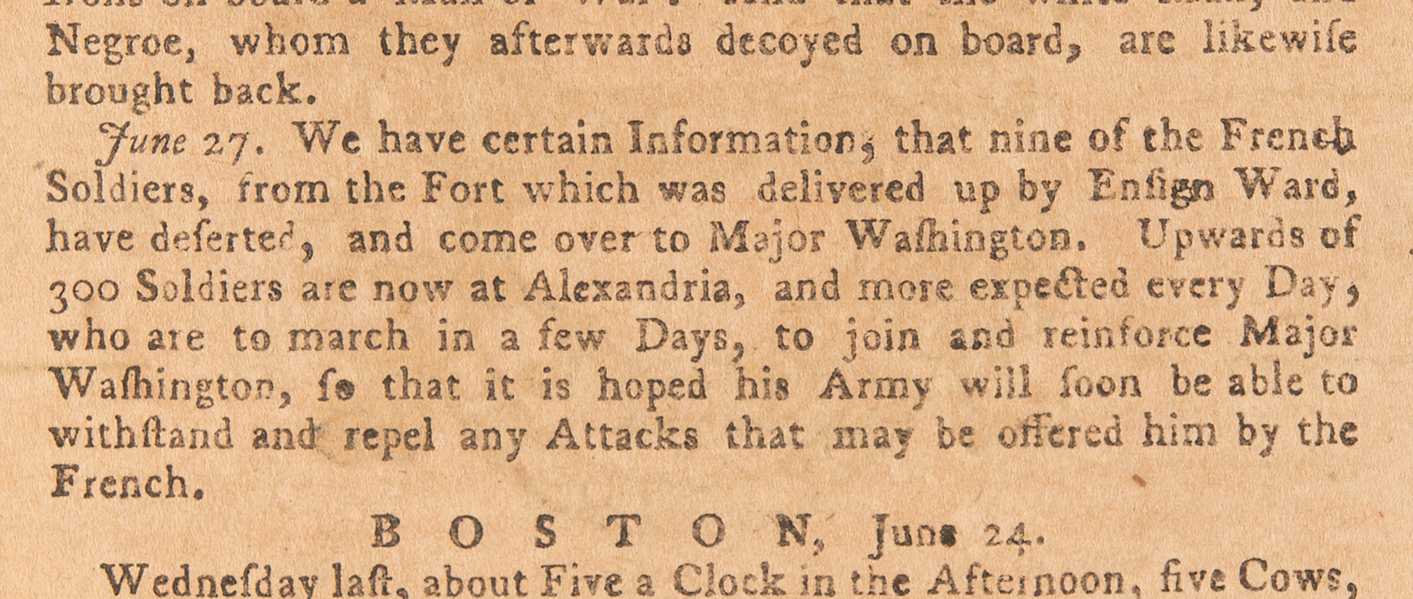 The text: “June 27. We have certain information, that nine of the French Soldiers, from the Fort which was delivered up by Ensign Ward, have deserted, and come over to Major Washington. Upwards of 300 Soldiers are now at Alexandria, and more expected every Day, who are to march in a few Days, to join and reinforce Major Washington, so that it is hoped his Army will soon be able to withstand and repel any Attacks that may be offered him by the French.”