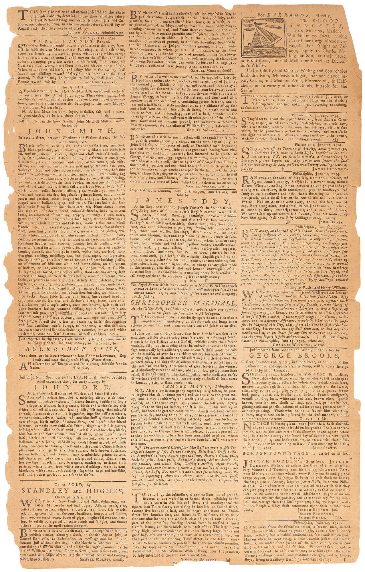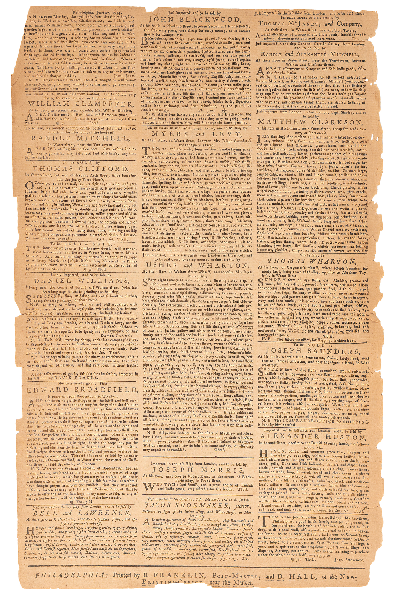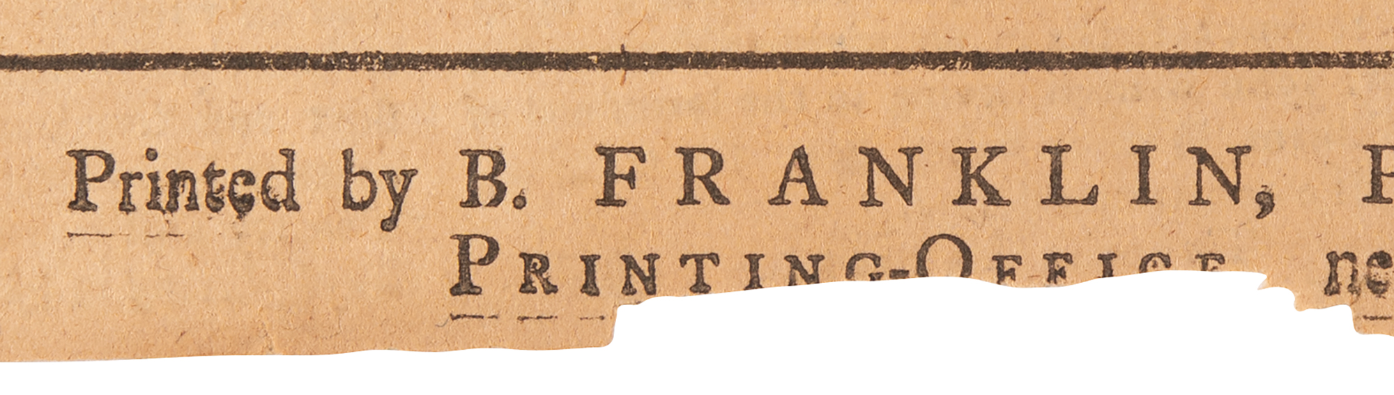 Although Benjamin Franklin was, since 1748, no longer actively managing the Pennsylvania Gazette, the legend “Printed by B. Franklin” is prominently marked in the usual byline location in the footer of the last page. The rest of this 6-page issue of the Pennsylvania Gazette, published in its heyday as a national paper of record, is packed with many additional interesting articles and ads.