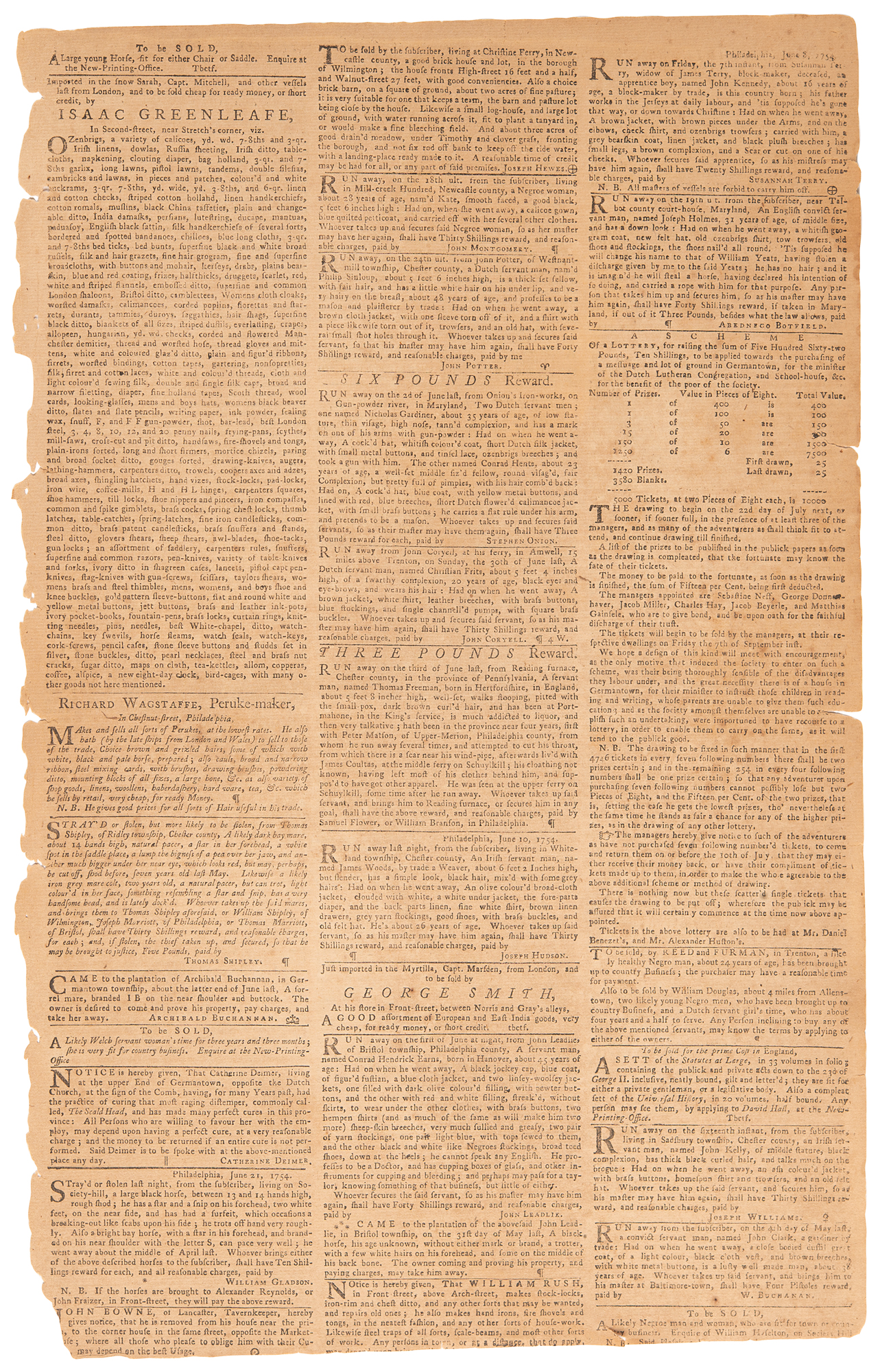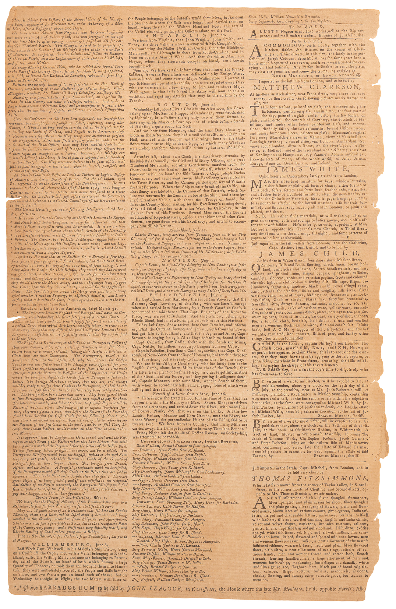 Complete issue of The Pennsylvania Gazette from July 4, 1754, 9.5 x 15, six total pages, containing considerably early and seldom-seen contemporary press about 22-year-old Corporal George Washington (erroneously listed here as a major), in the year his name first appeared in print. From a report the Gazette had garnered a week before publication, this blurb relays on the second page two status items on the conflict that Washington was leading for the British at the northwest French-English border, in and around modern-day Pittsburgh. He was navigating the English-French-Indian conflicts that would escalate into the French and Indian War.