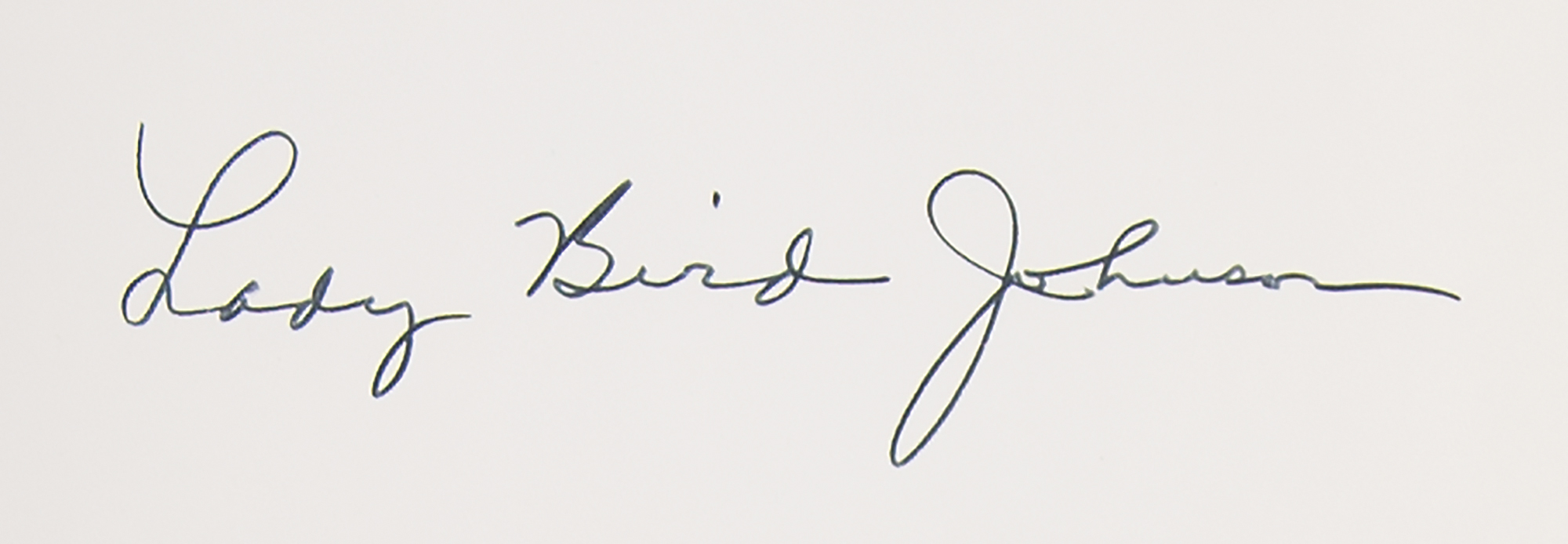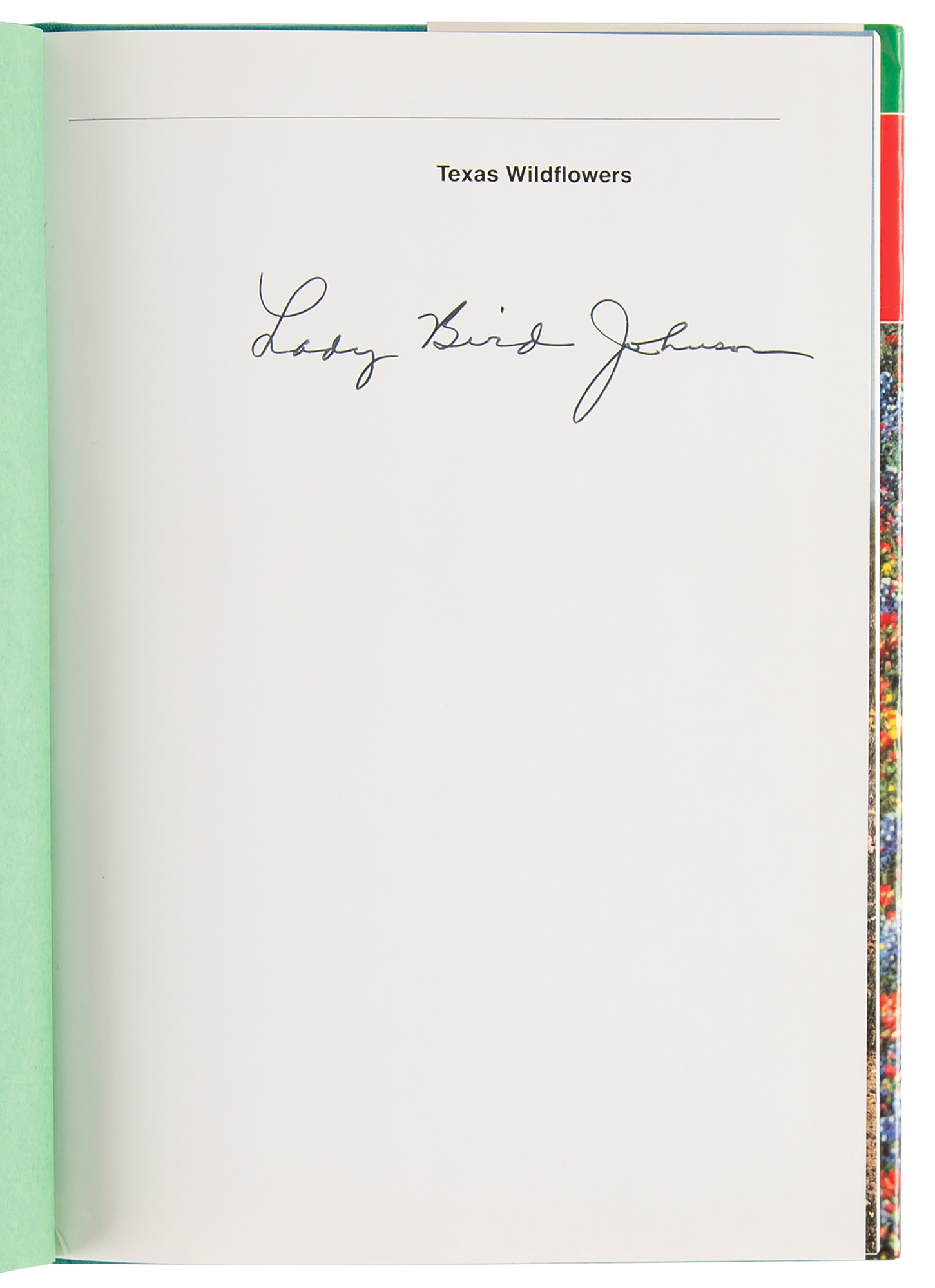 Signed book: Texas Wildflowers: A Field Guide. First edition. Austin: University of Texas Press, 1984. Hardcover with dust jacket, 6 x 8.5, 271 pages. Signed on the half-title page in black felt tip, "Lady Bird Johnson." In fine condition.