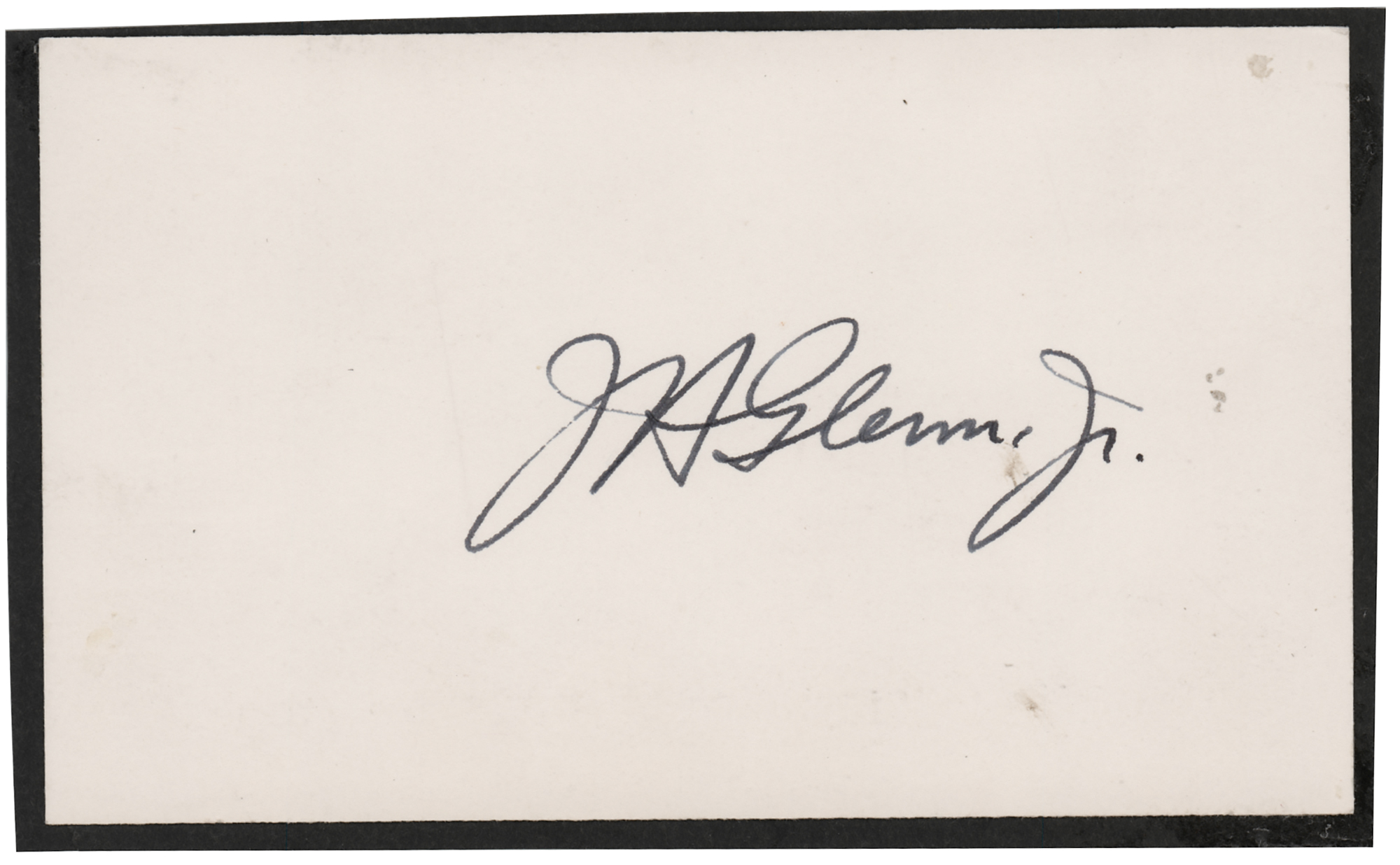 Bold fountain pen signature, "J. H. Glenn Jr.,” on an off-white 5 x 3 card mounted to black cardboard. In fine condition.