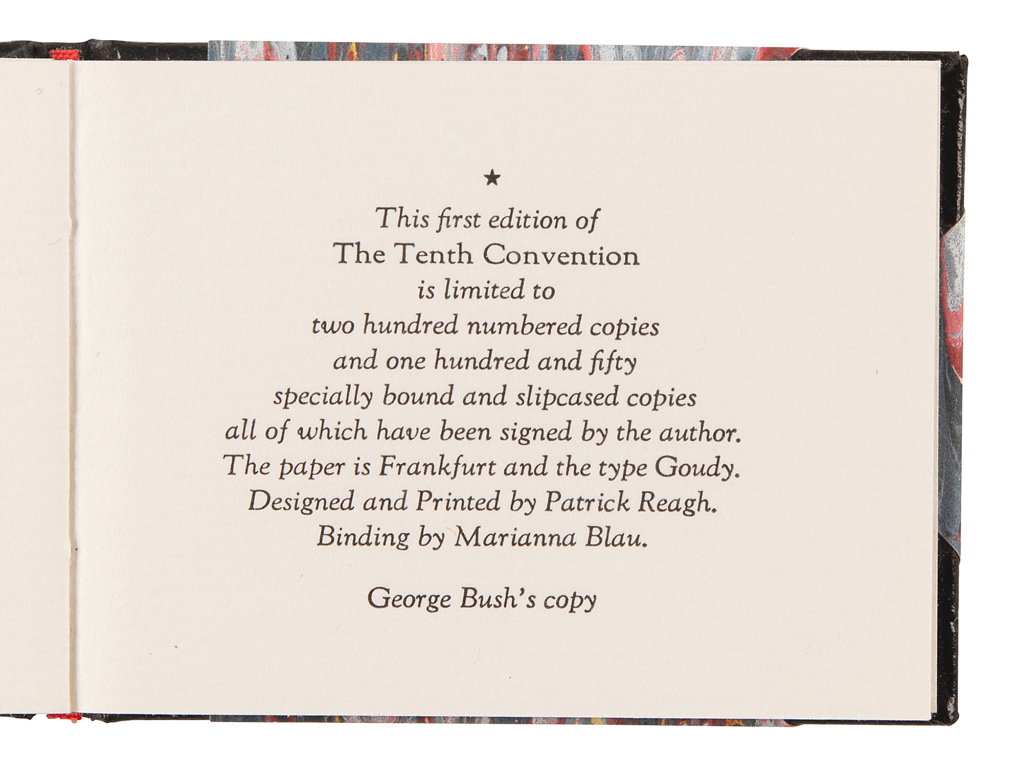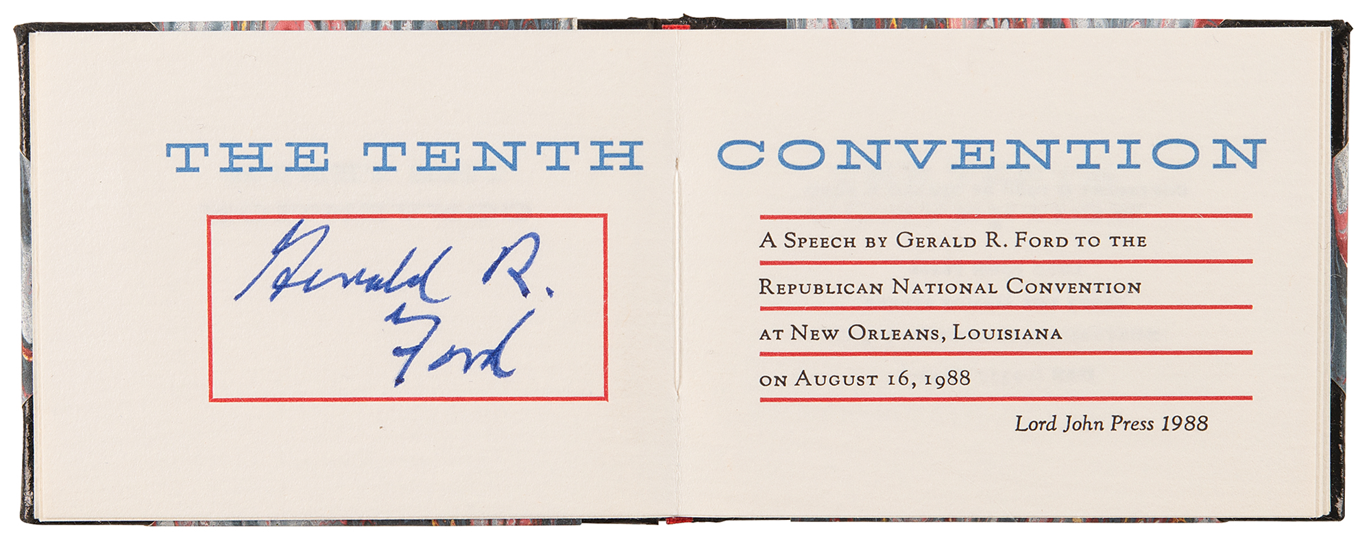 Miniature signed book: The Tenth Convention. Limited first edition, denoted "George Bush's copy." Northridge, CA: Lord John Press, 1988. Hardcover, 2.75 x 2, 26 pages. Signed on the title page in blue ink, "Gerald R. Ford." In very fine condition.
