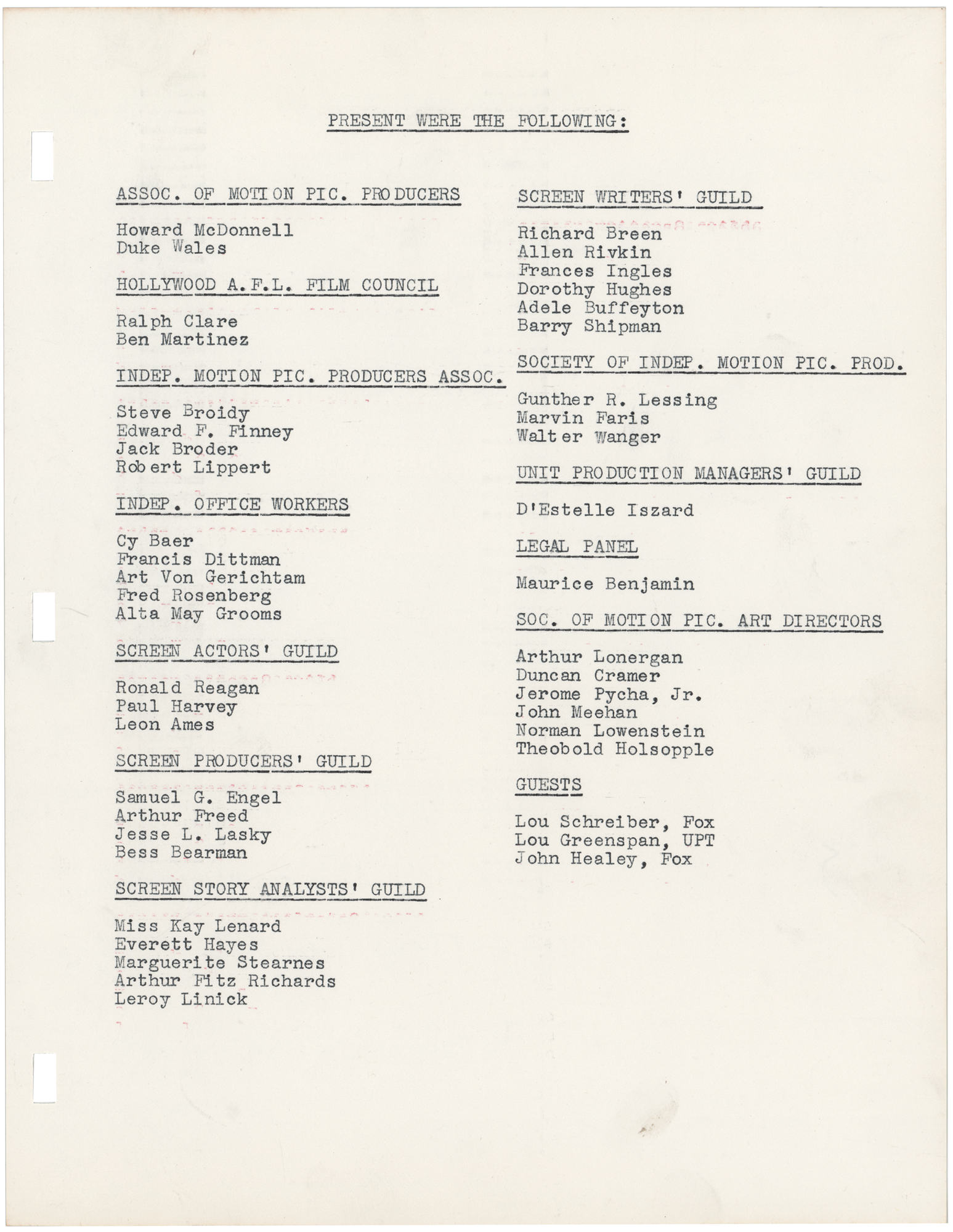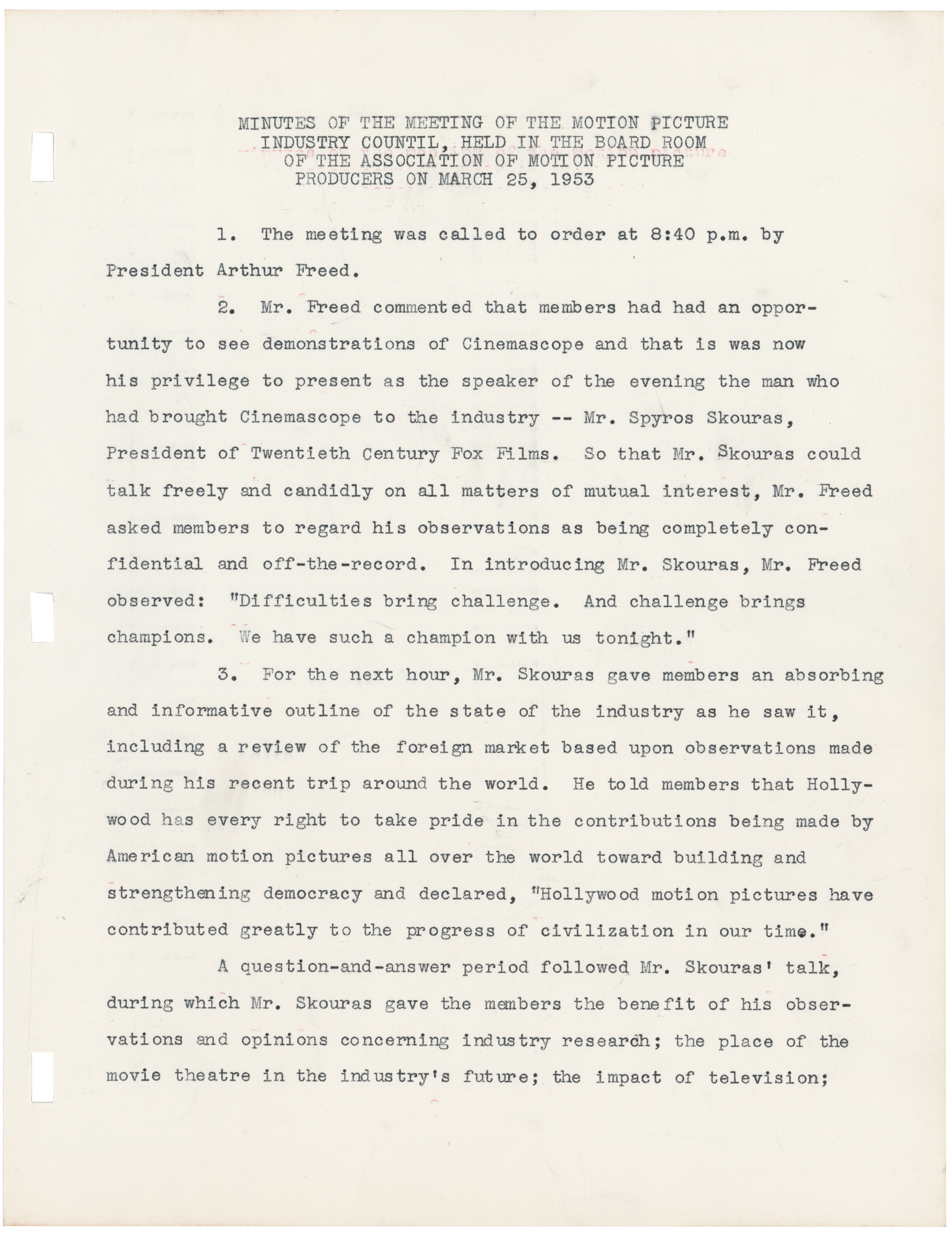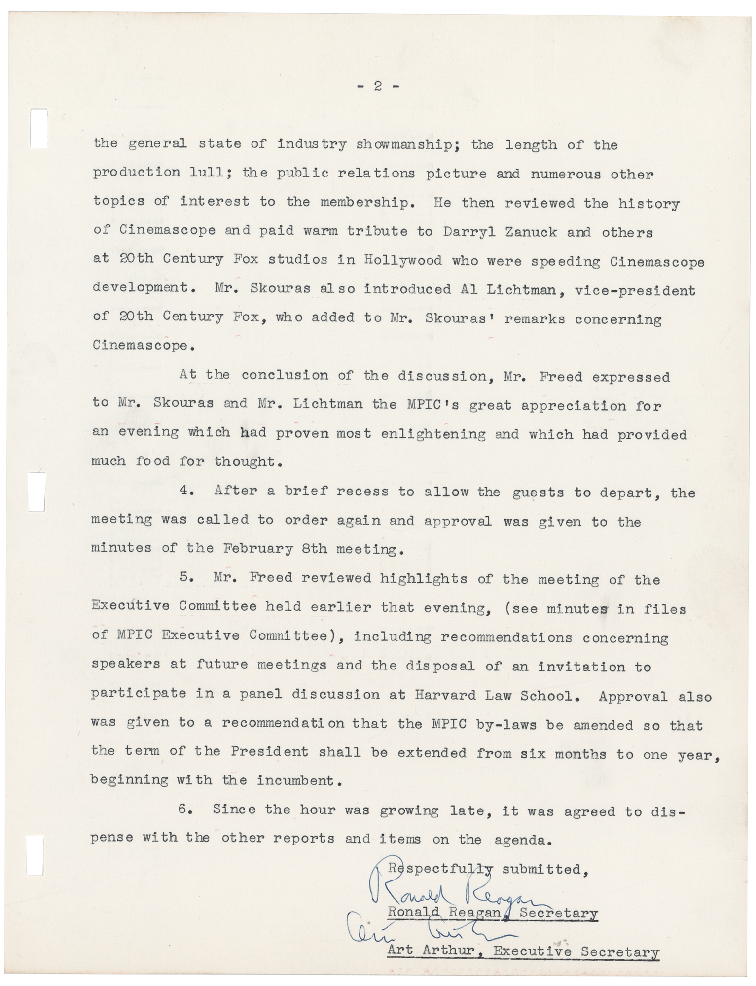 DS, three pages, 8.5 x 11, March 25, 1953. Document headed "Minutes of the meeting of the Motion Picture Industry Council, held in the board room of the Association of Motion Picture Producers on March 25, 1953," in part: "Mr. Skouras gave members an absorbing and informative outline of the state of the industry as he saw it, including a review of the foreign market based upon observations made during his recent trip around the world. He declared 'Hollywood Motion Pictures have contributed greatly to the progress of civilization in our time.' At the conclusion of the discussion, Mr. Freed expressed great appreciation for the evening which had proven most enlightening." Signed at the conclusion in blue ballpoint by Ronald Reagan as secretary of the Motion Picture Industry Council, and countersigned by Art Arthur as executive secretary. In fine condition.