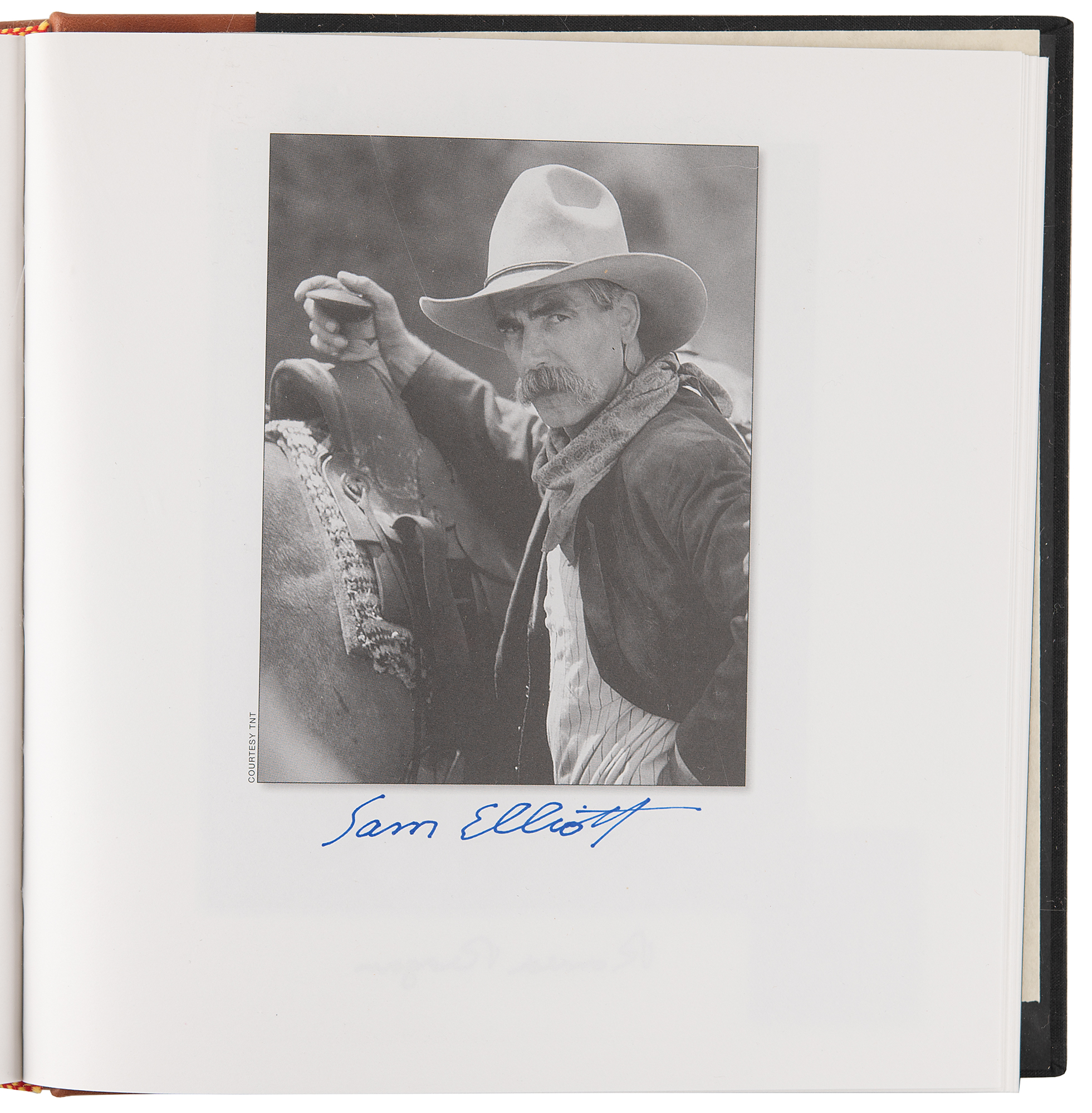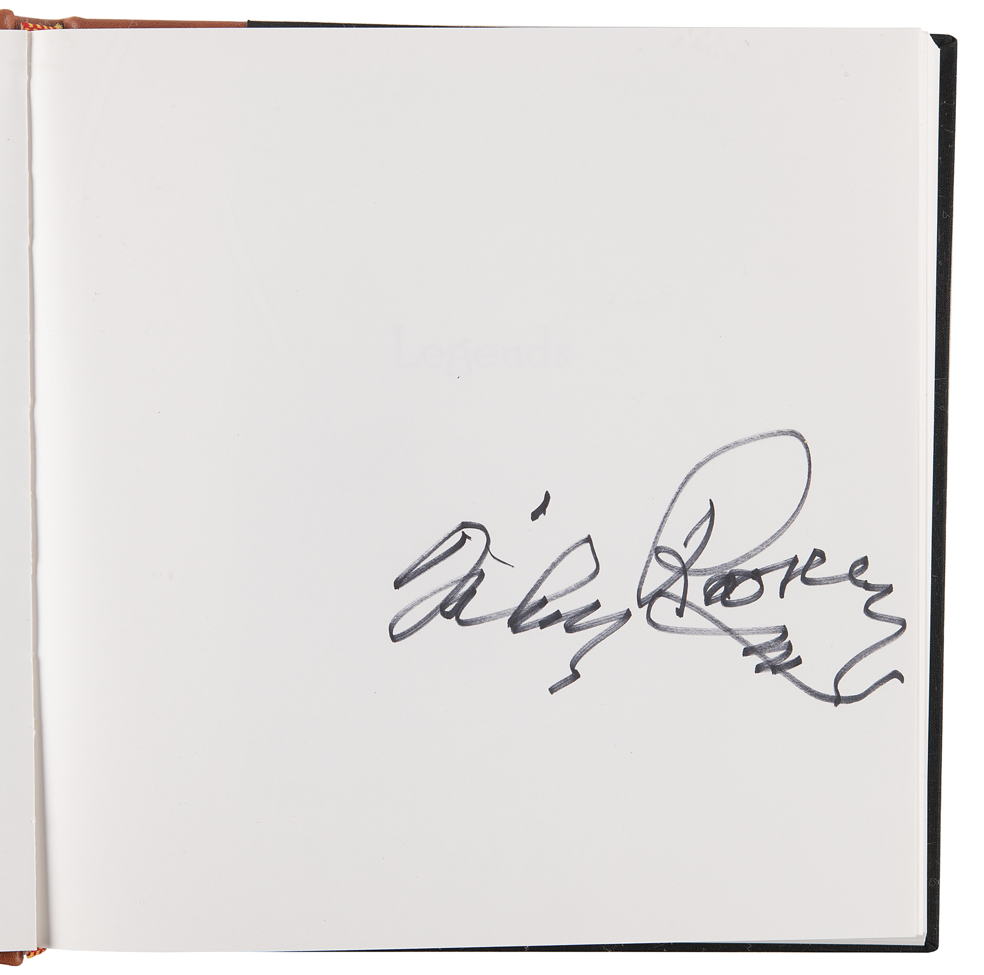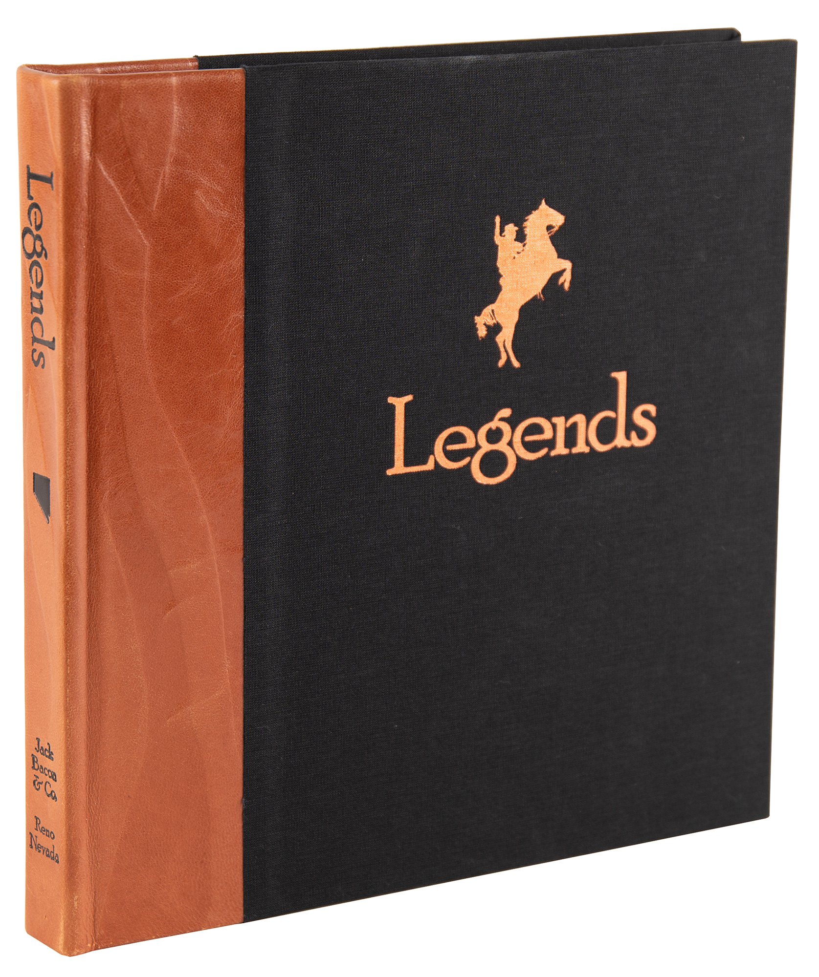 Signed book: Legends. Limited edition, numbered 250/250. Reno, Nevada: Jack Bacon and Company, 2006. Hardcover with slipcase, 9.25 x 9.75. Signed on their respective pages in blue felt tip by over 40 Western stars, including: James Arness, Eddy Arnold, Irene Bedard, Powers Boothe, Brooks and Dunn, Red Buttons, Harry Carey, Jr., Roy Clark, Lacy J. Dalton, Charlie Daniels, Jack Elam, Sam Elliott, Rhonda Fleming, Lou Glanzman, Lee Greenwood, Monte Hale, Emmylou Harris, Harry Jackson, Adam Jahiel, Stuart Kaminski, Frankie Laine, Trini Lopez, Barbara Mandrell, Kevin McCarthy, The Oak Ridge Boys, Hugh O'Brian, Riders in the Sky, Julie Ritter, Dale Robertson, Mickey Rooney, The Statler Brothers, Mel Tillis, Randy Travis, Eli Wallach, Dennis Weaver, and Adam West. In very fine condition. Accompanied by a certificate of authenticity from the publisher.