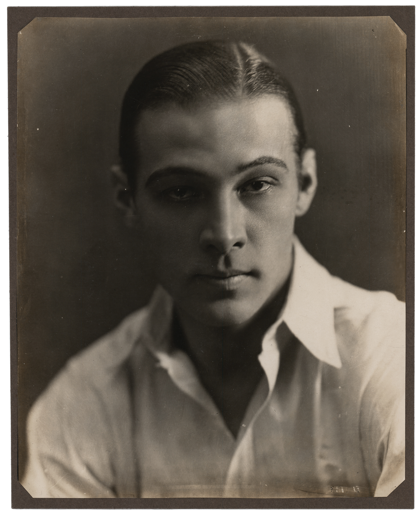 Vintage fountain pen signature, "Sincerely, Rudolph Valentino, Nov. 21, 1923,” on an off-white 6 x 4 album page. Reverse bears the signature of Douglas Fairbanks, Sr., dated June 1920. In fine condition. Accompanied by an 8 x 10 portrait photo of Valentino.