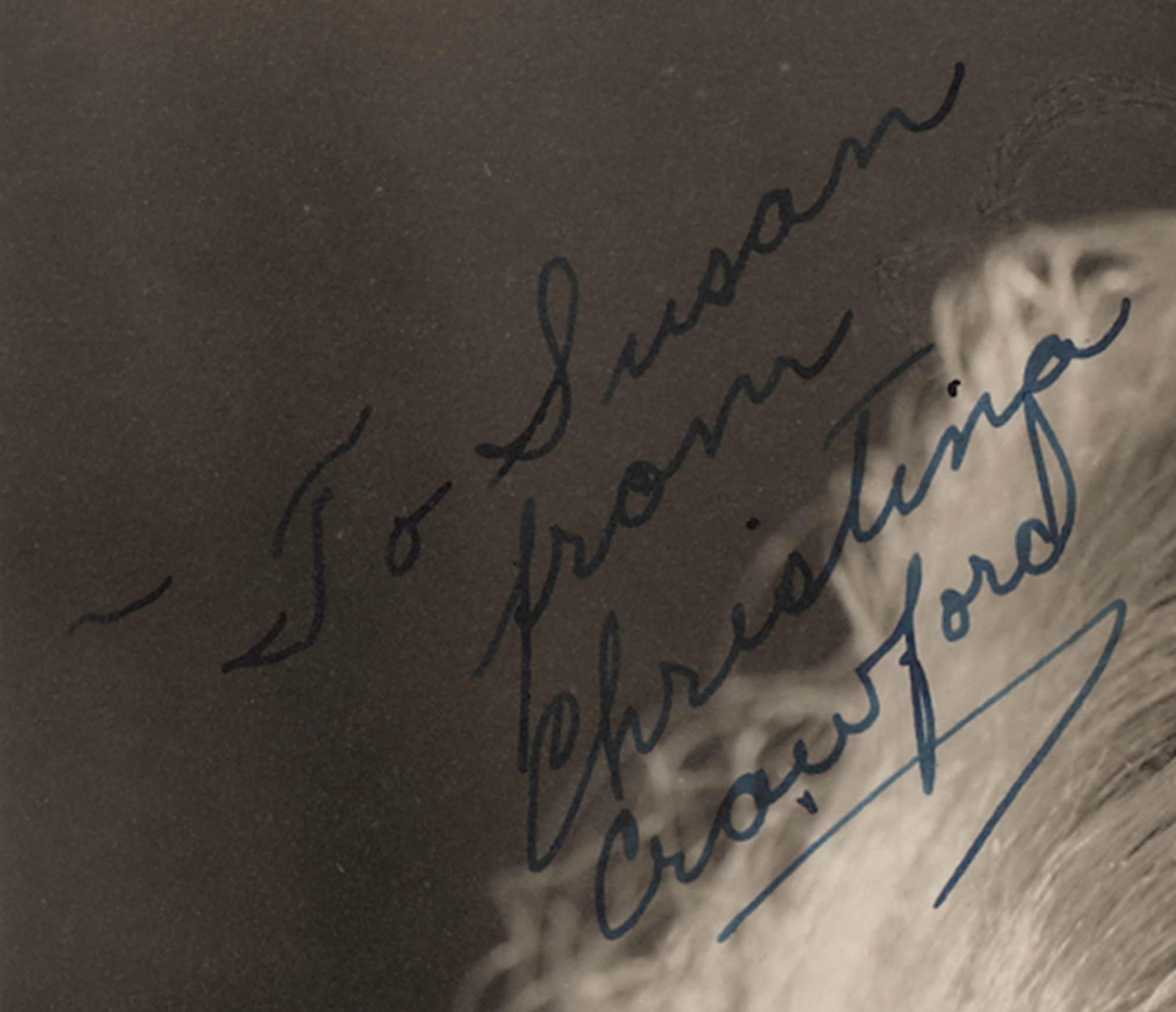 Striking matte-finish 8 x 10 head-shot photo of Joan Crawford, signed and inscribed in fountain pen by her adopted daughter, "To Susan, From, Christina Crawford.” In very fine condition, with moderate signature contrast.
