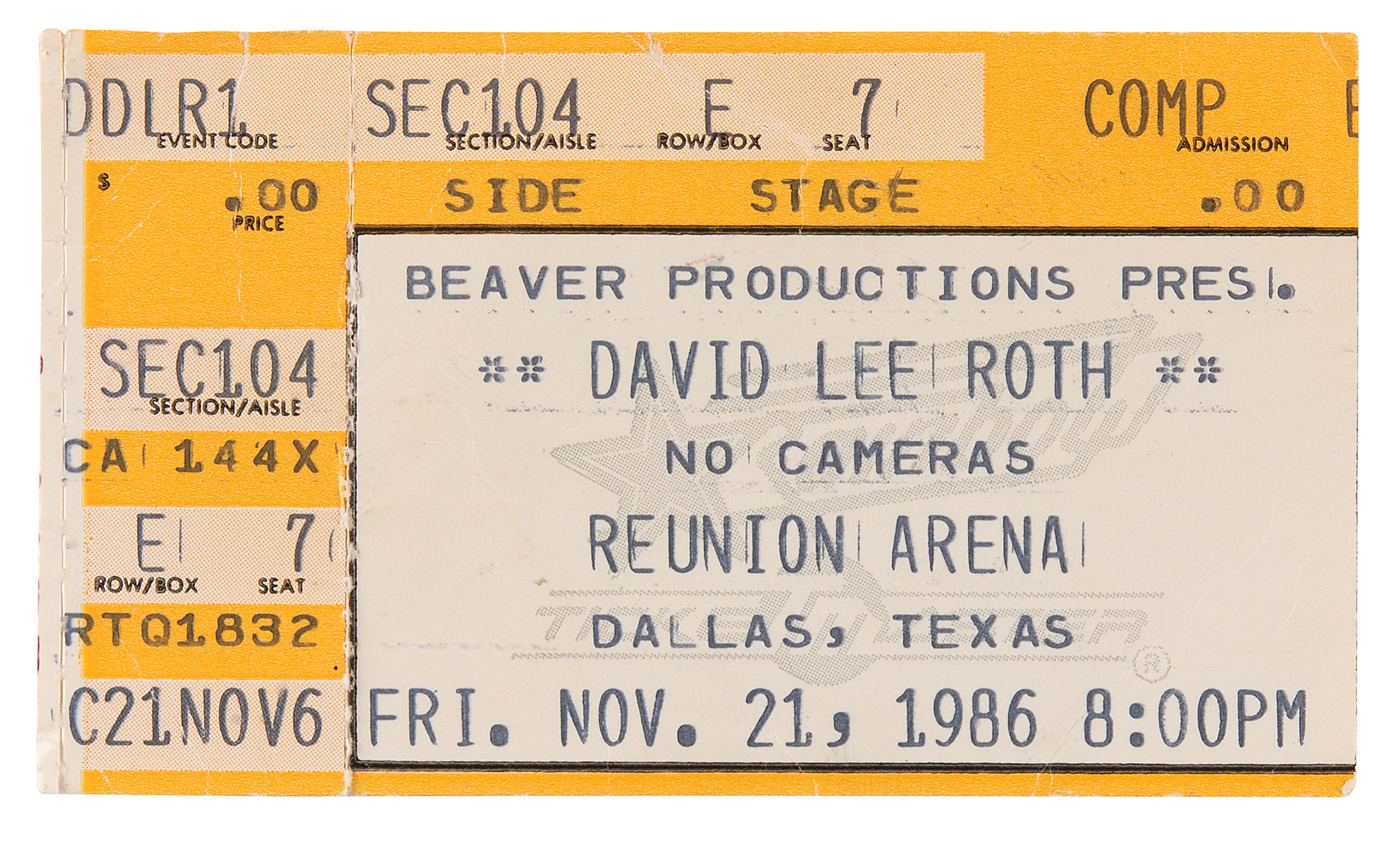 Yankee Rose single album signed on the front cover in black felt tip, "David Lee Roth '86." In fine condition, with an aftershow backstage pass affixed to the front cover. Accompanied by a concert ticket from November 21, 1986. The record is included.