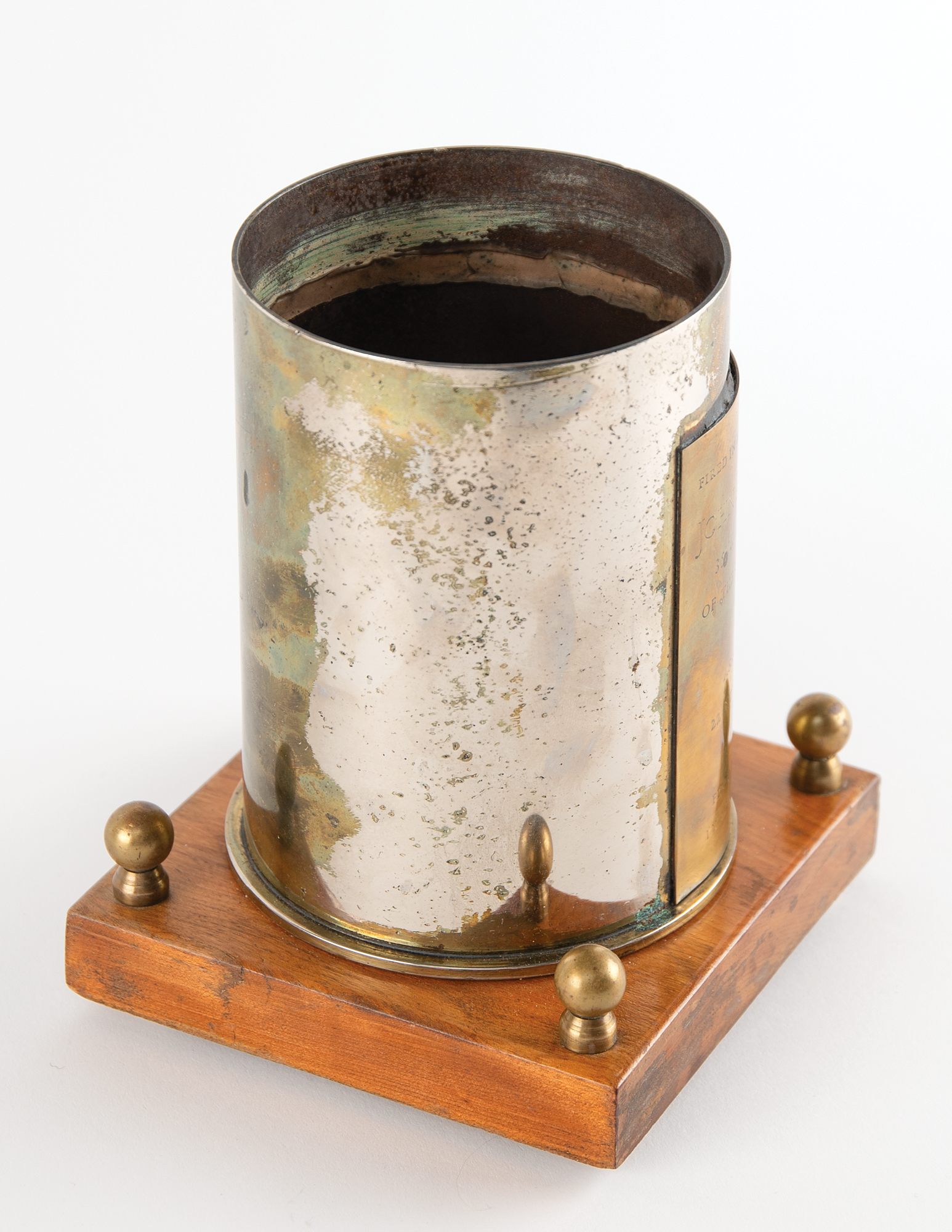 Silver-plated mortar shell casing fired as part of a tribute to the late President John F. Kennedy, measuring 4.25˝ in diameter and 6˝ tall, with engraved plaque, reading: "Fired in honor of the late John F. Kennedy, 35th President of the United States, Assassinated 22 November 1963, Fired by Squad led by Sgt. Albert George." Mounted on a wooden base and in very good to fine condition, with moderate tarnishing.