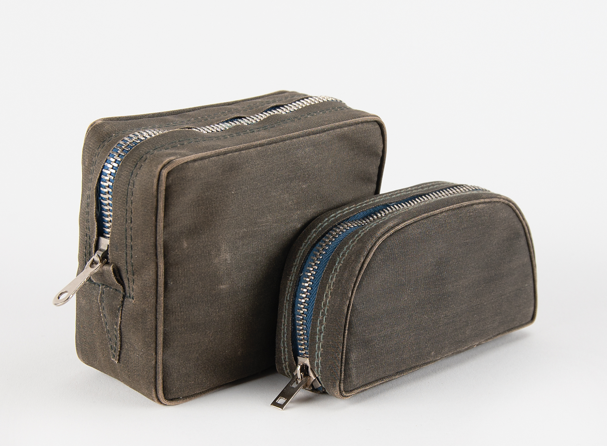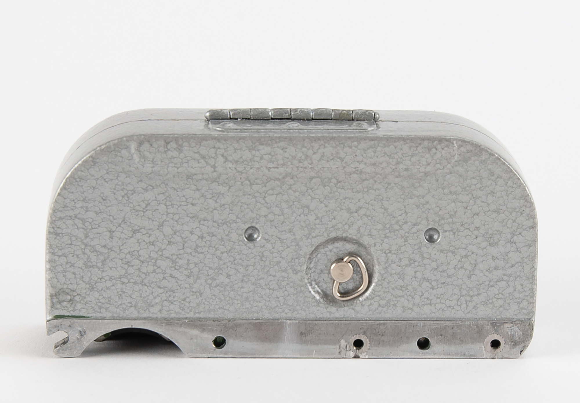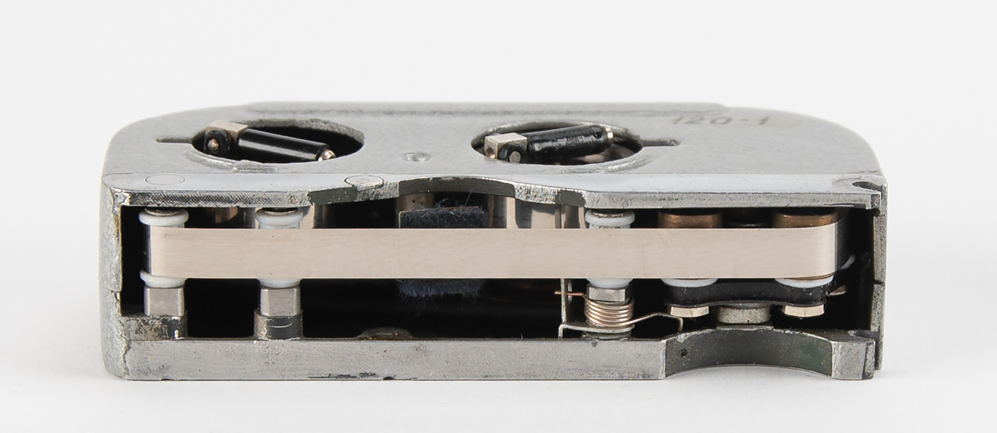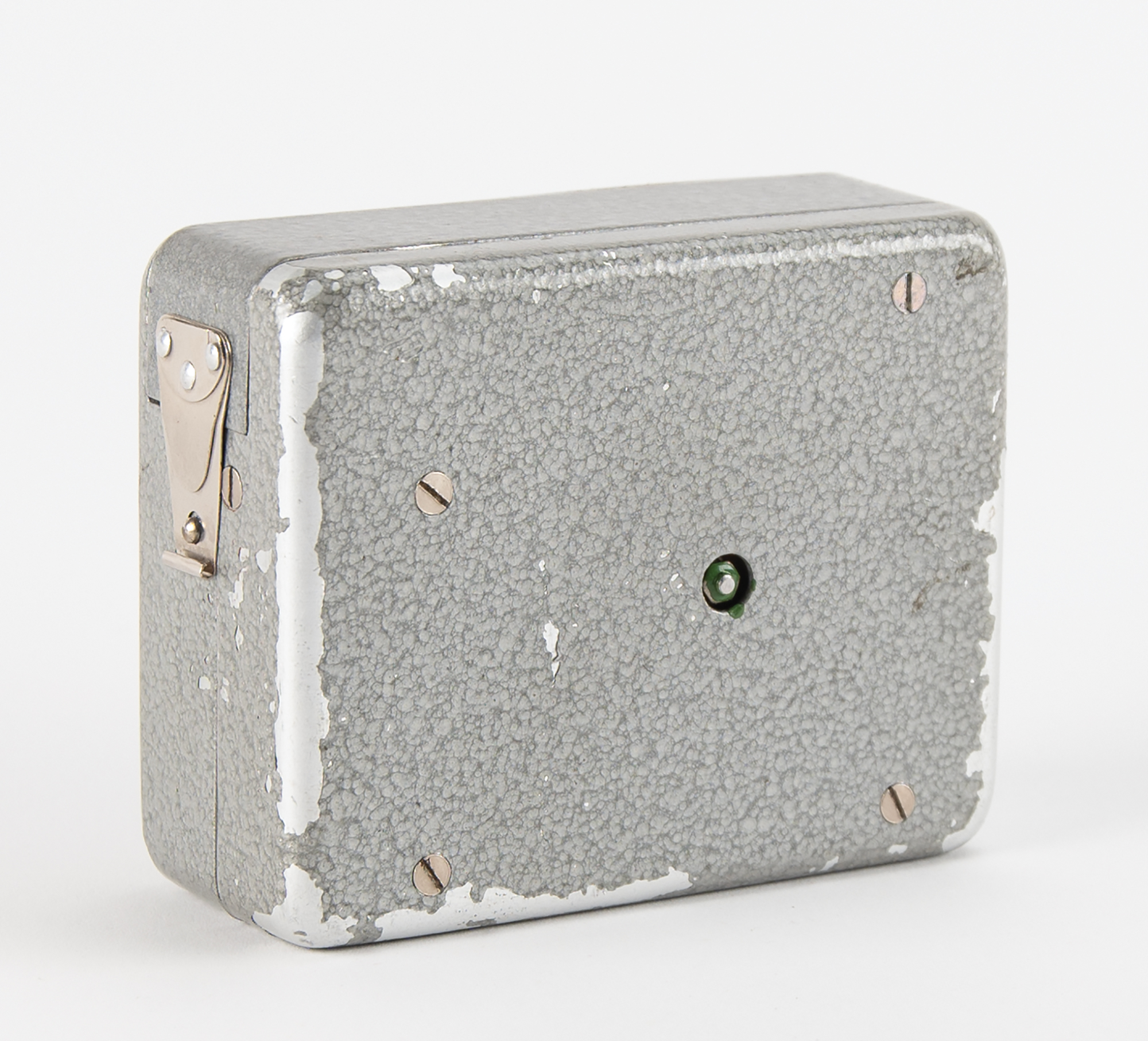 R-353 Proton burst encoder and magnetic tape cassette, introduced in the Soviet Union in 1969 as part of the R-353 spy radio set. The burst encoder measures approximately 4˝ x 3˝ x 1.5˝, and features a central black number dial similar to a rotary phone. Using a stylus stored inside the lid to rotate the dial, a message would be encoded onto magnetic tape. The tape cartridge measures 4˝ x 2˝ x 1˝ and has two small fold-out cranks for winding the tape on its internal spools. Both pieces are painted in the original gray hammerite paint, one of two colors used for the R-353 Proton spy radio set. Both include their canvas transport bags. Housed in the original box with Soviet inspection certificate affixed on the top, along with an accompanying replacement spring set and apper test strip.