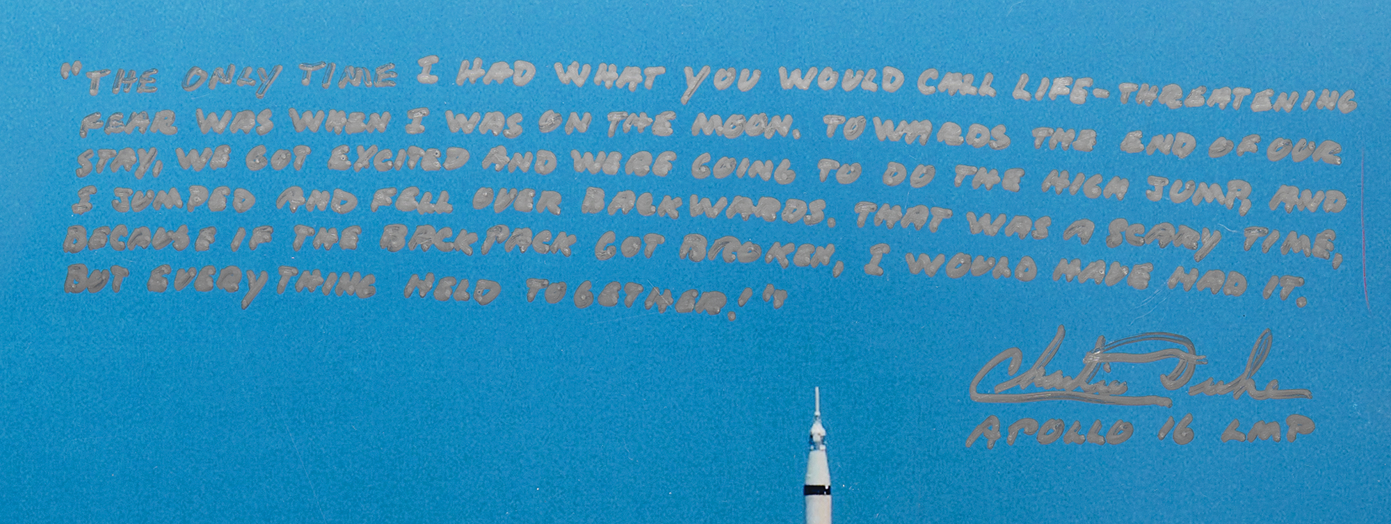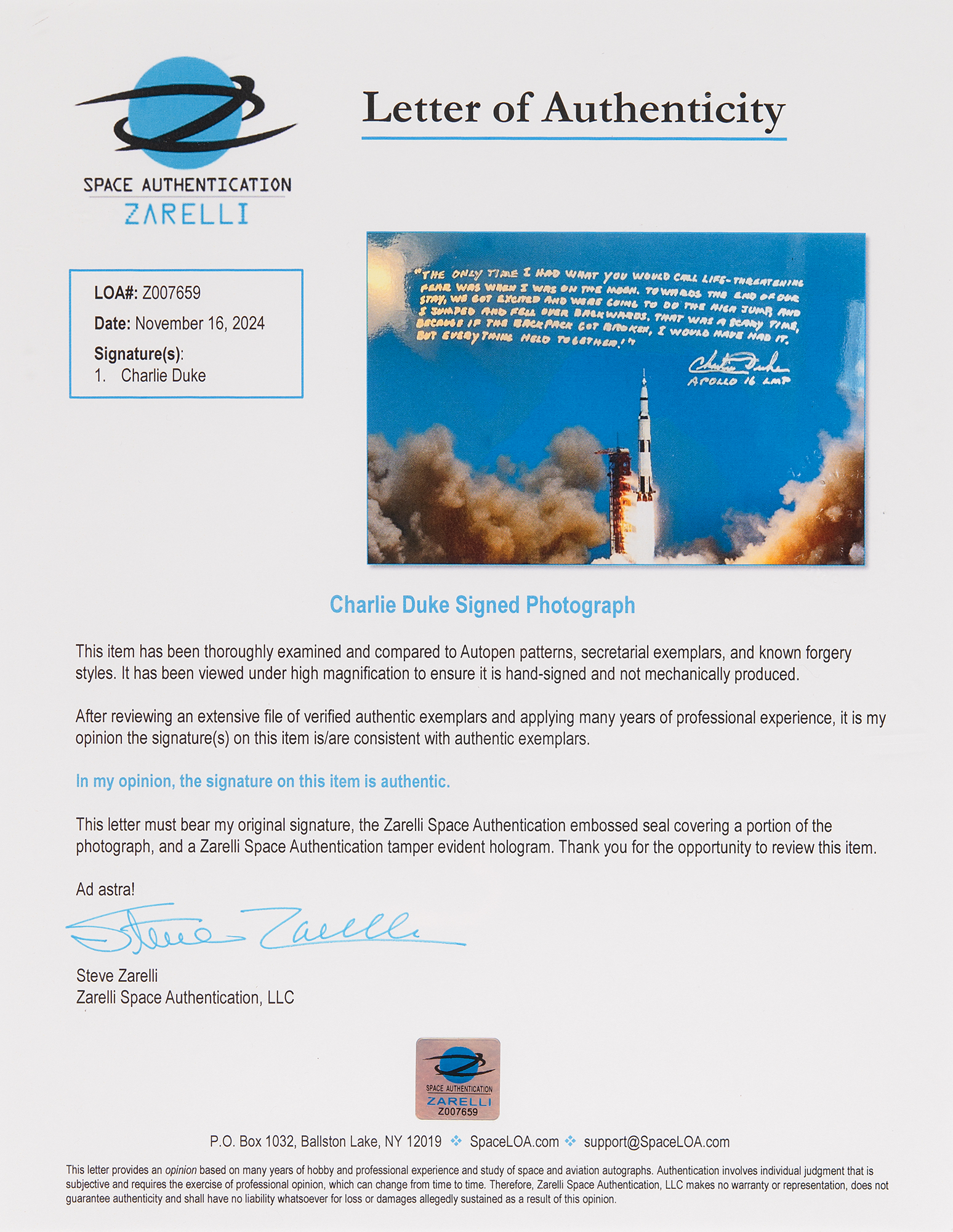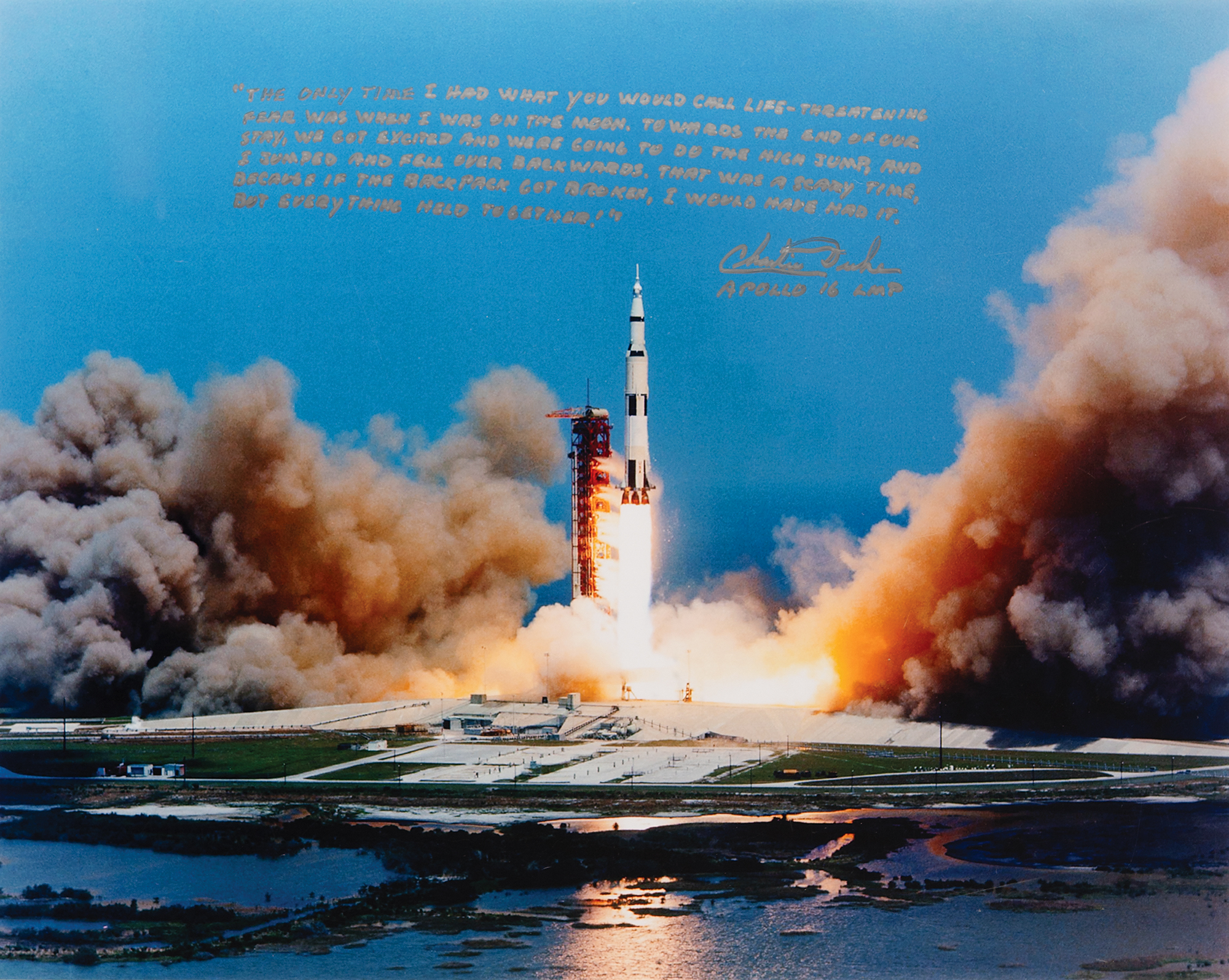 Color glossy 20 x 16 photo of the Apollo 16 launch, signed in silver ink, "'The only time I had what you would call life-threatening fear was when I was on the moon. Towards the end of our stay, we got excited and were going to do the high jump, and I jumped and fell over backwards. That was a scary time, because if the backpack got broken, I would have had it. But everything held together!' Charlie Duke, Apollo 16 LMP." Rolled and in fine condition. Accompanied by a full letter of authenticity from Zarelli Space Authentication.