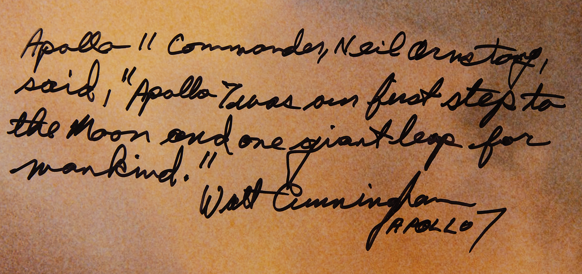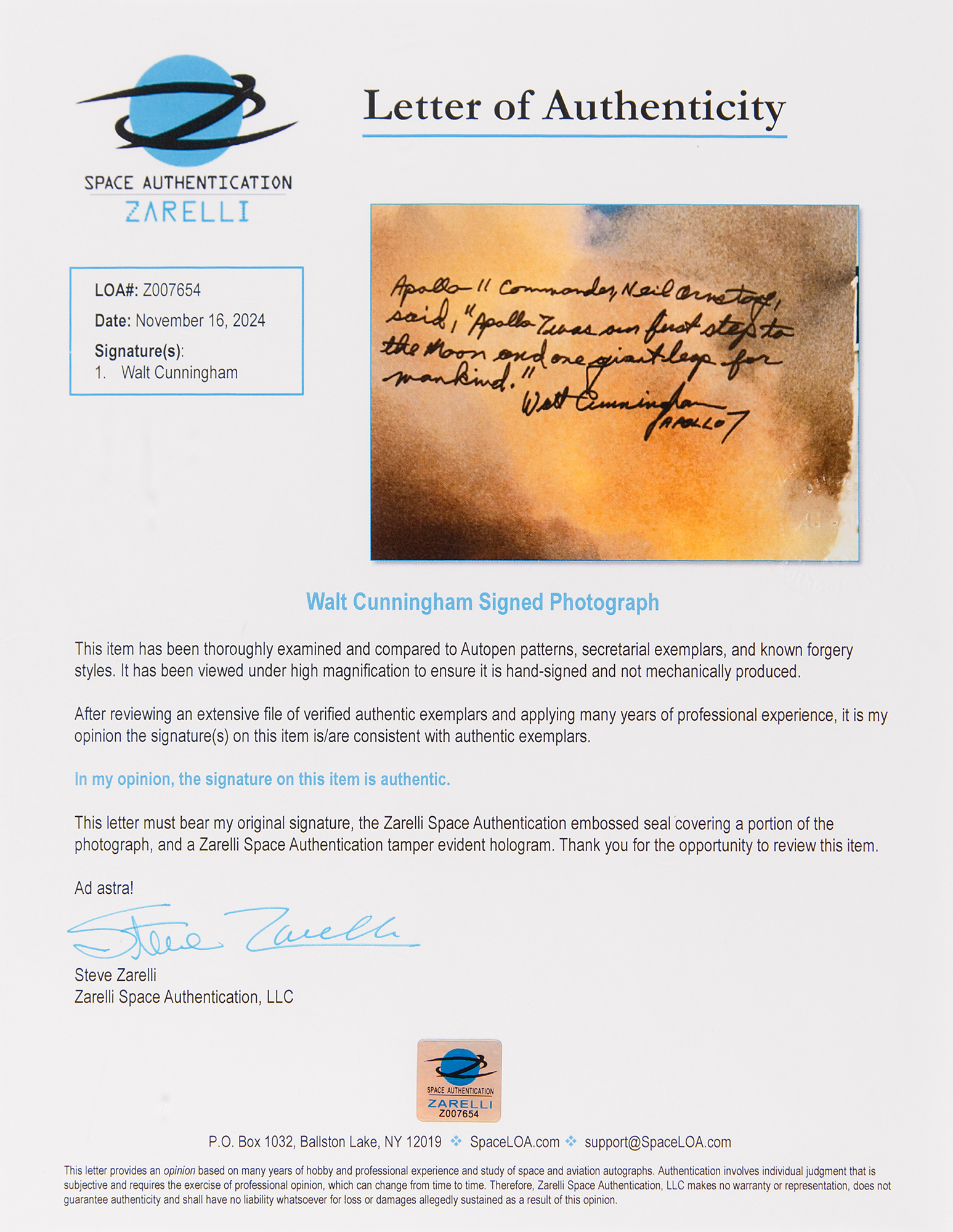 Color glossy 16 x 20 photo of the fiery Apollo 7 liftoff, signed in black felt tip, "Apollo 11 Commander, Neil Armstrong, said, 'Apollo 7 was our first step to the Moon and one giant leap for mankind.' Walt Cunningham, Apollo 7." Rolled and in fine condition. Accompanied by a full letter of authenticity from Zarelli Space Authentication.