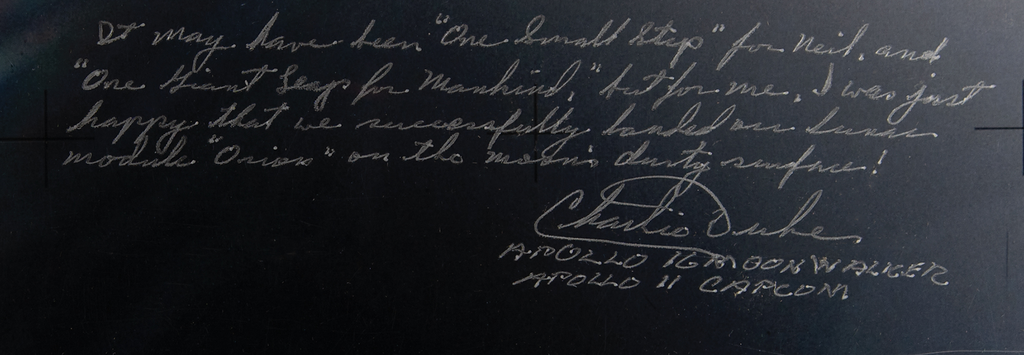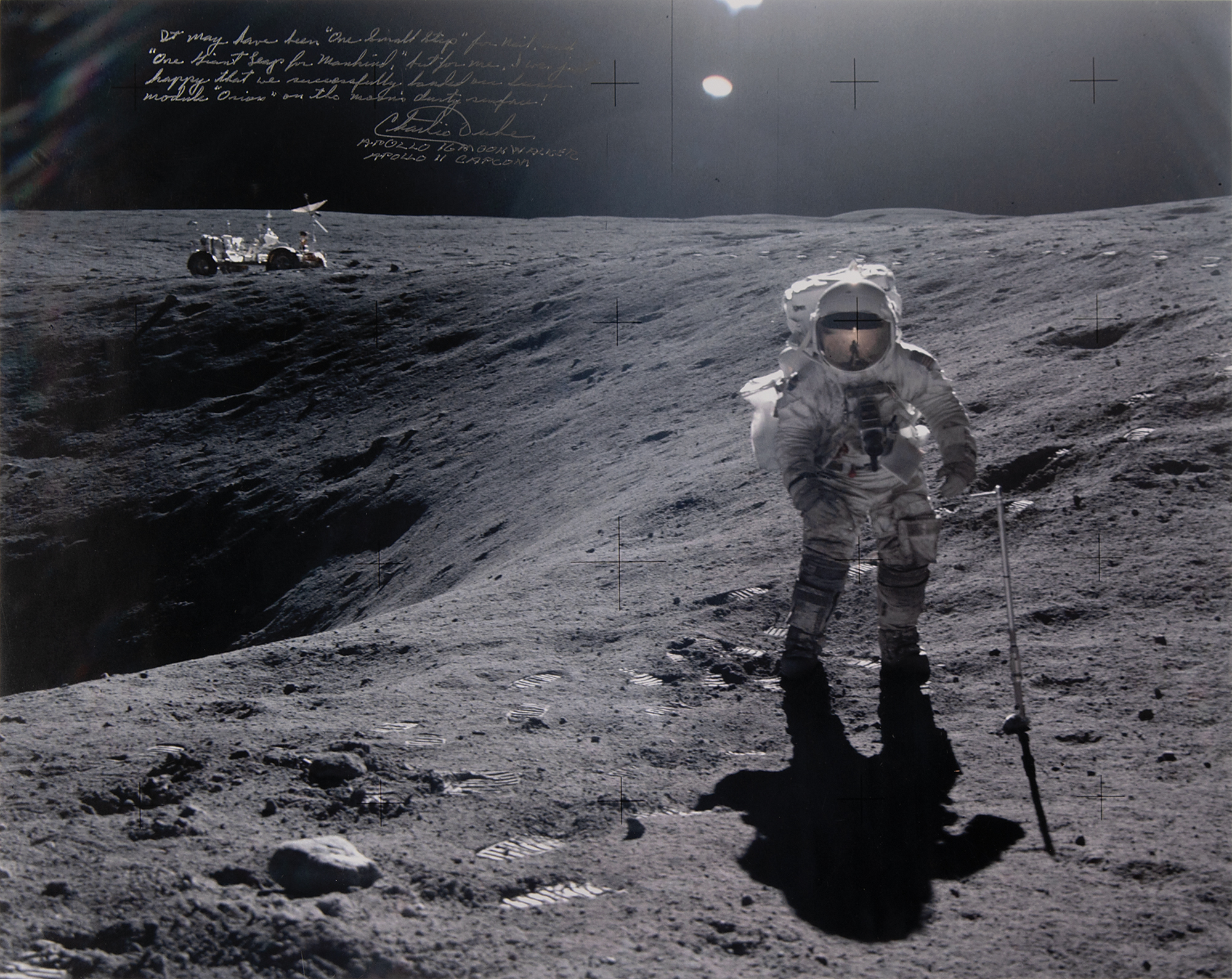 Color satin-finish 20 x 16 photo of Lunar Module Pilot Charlie Duke walking along the rim of the huge Plum Crater during an Apollo 16 EVA, signed in silver ink, "Charlie Duke, Apollo 16 Moonwalker, Apollo 11 Capcom,” who adds above: “It may have been ‘One small step’ from Neil, and ‘One Giant Leap for Mankind,’ but for me, I was just happy that we successfully landed our Lunar Module ‘Orion’ on the moon’s dusty surface.” Rolled and in fine condition.