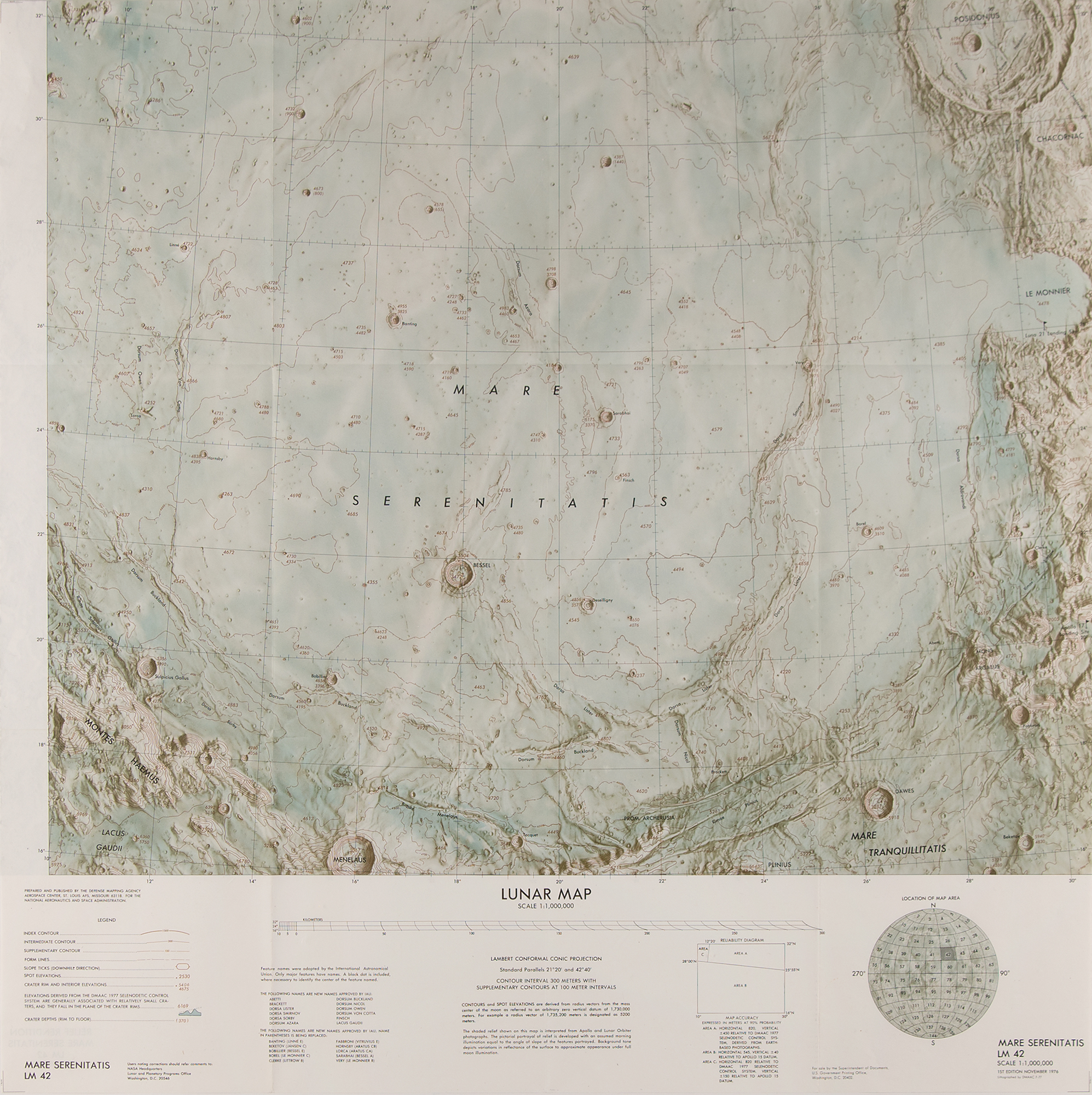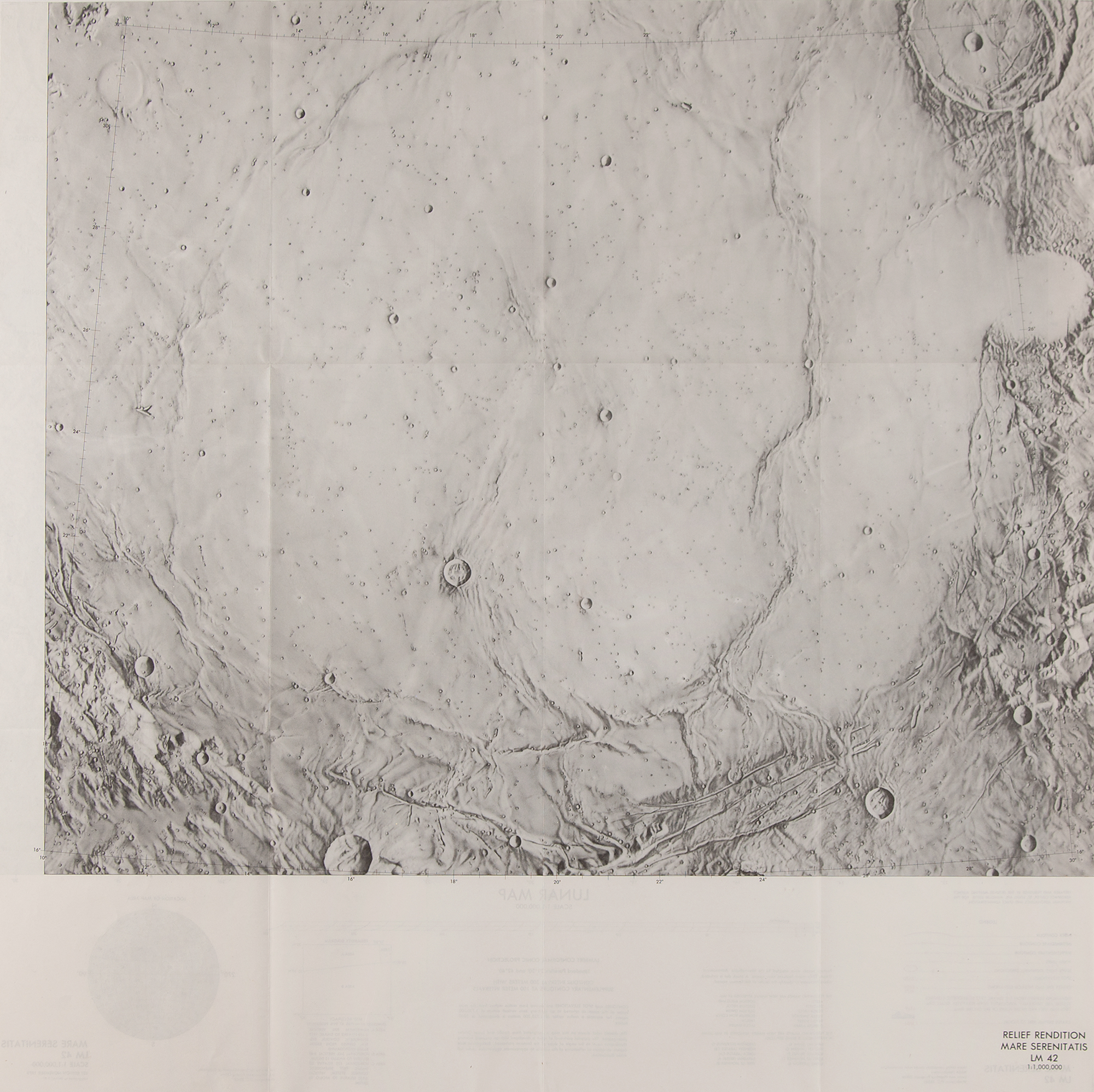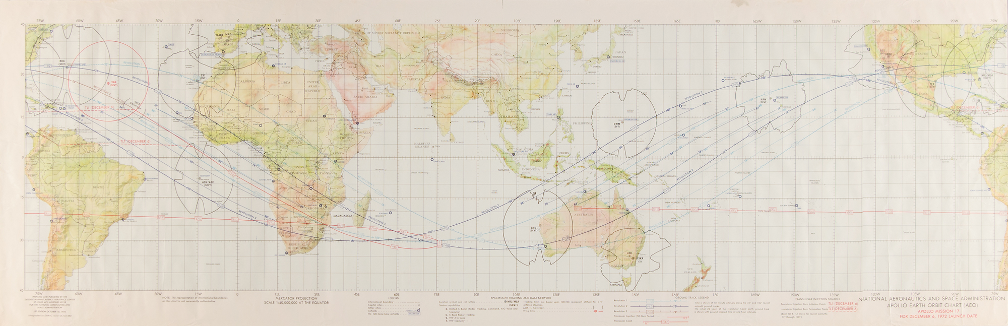 Three first edition charts affiliated with Apollo 17: a color 13.5 x 41.5 map entitled "Apollo Earth Orbit Chart (AEO), Apollo Mission 17 for December 6, 1972 Launch Date," lithographed by DMAAC 10/72; a color 28 x 11 map entitled "Apollo Flight Chart (AFC), Apollo Mission 17," lithographed by DMAAC 11-72; and a color double-sided 25 x 25 lunar map of the "Mare Serenitatis," nearby the Apollo 17 landing site in the Taurus-Littrow valley, lithographed by DMAAC 7-77. Rolled and in fine condition, with a few creases to the Apollo Earth Orbit Chart, some corner creasing to the Apollo Flight Chart.