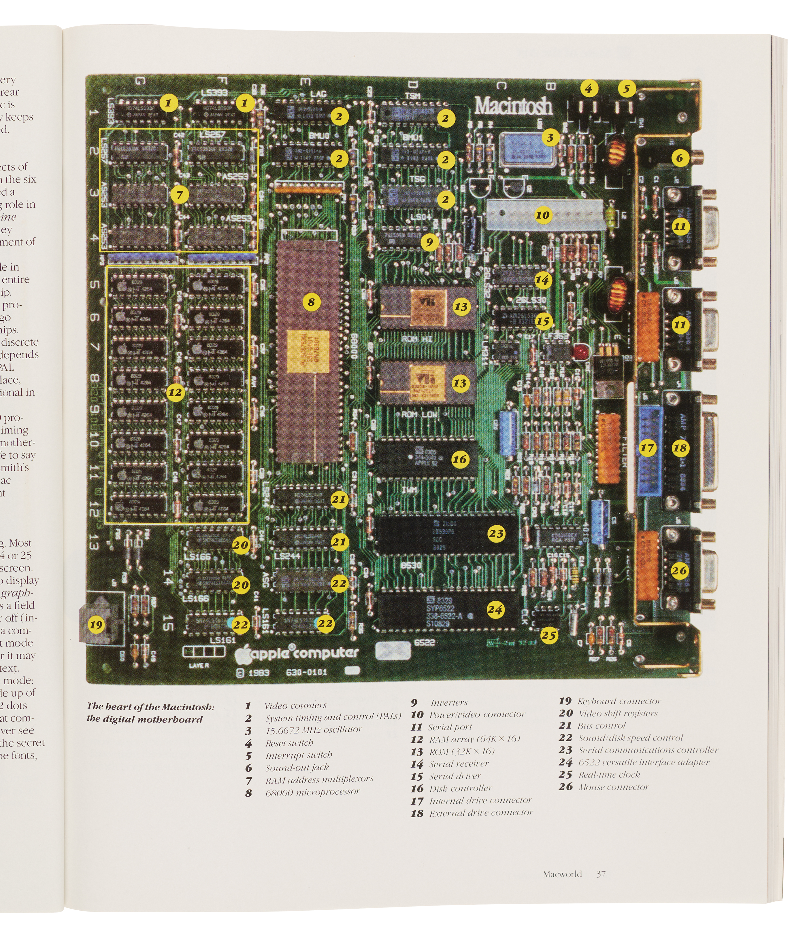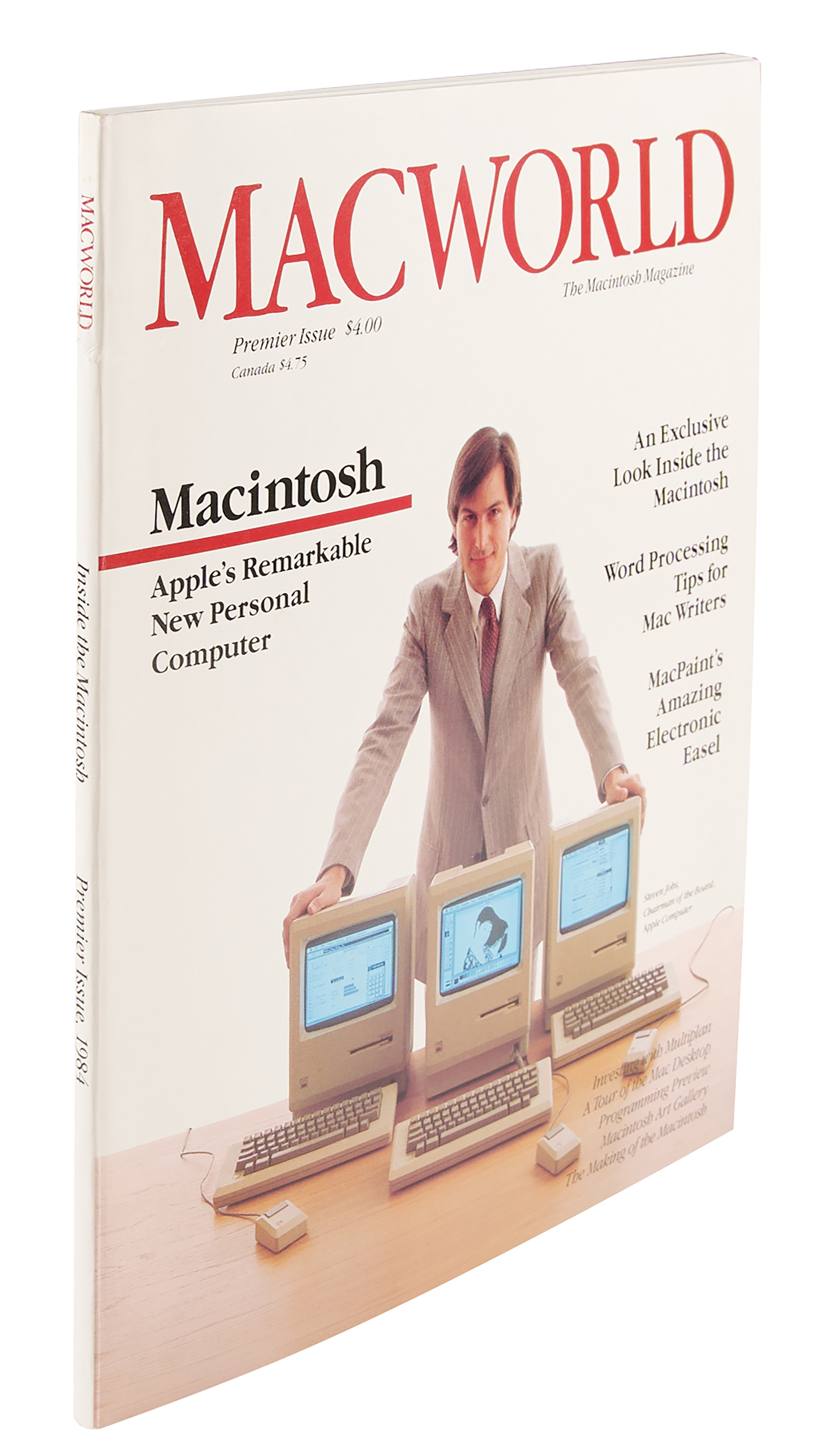 Premiere issue of Macworld: The Macintosh Magazine from February 1984, 144 pages, 9 x 10.75, with the classic front cover picturing Jobs as Apple Computer's chairman of the board, posing with a trio of Macintosh computers upon their introduction to the world. Jobs is pictured two more times in the magazine: in an opening congratulatory Macintosh team group picture and at the end of a ‘Community’ section. In fine to very fine condition, with a couple minor creases to the back cover. Upon its release in early 1984, Macworld magazine became the most popular Macintosh-focused magazine in North America.