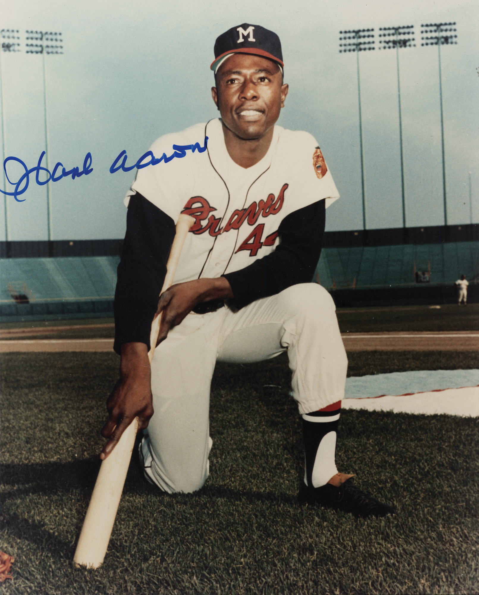 Color glossy 8 x 10 full-length photo of Hank Aaron taking a knee in his Milwaukee Braves uniform, signed in blue felt tip. In very fine condition.