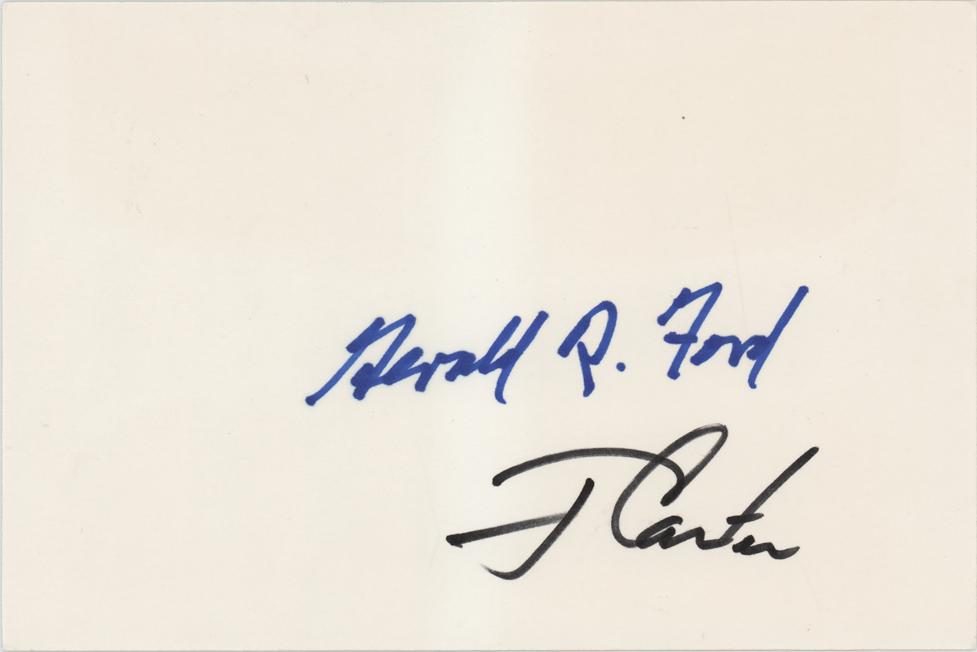 Blue and black felt tip signatures of former American president Jimmy Carter ("J. Carter") and Gerald Ford ("Gerald R. Ford”) on an off-white 6 x 4 sheet. In very fine condition.