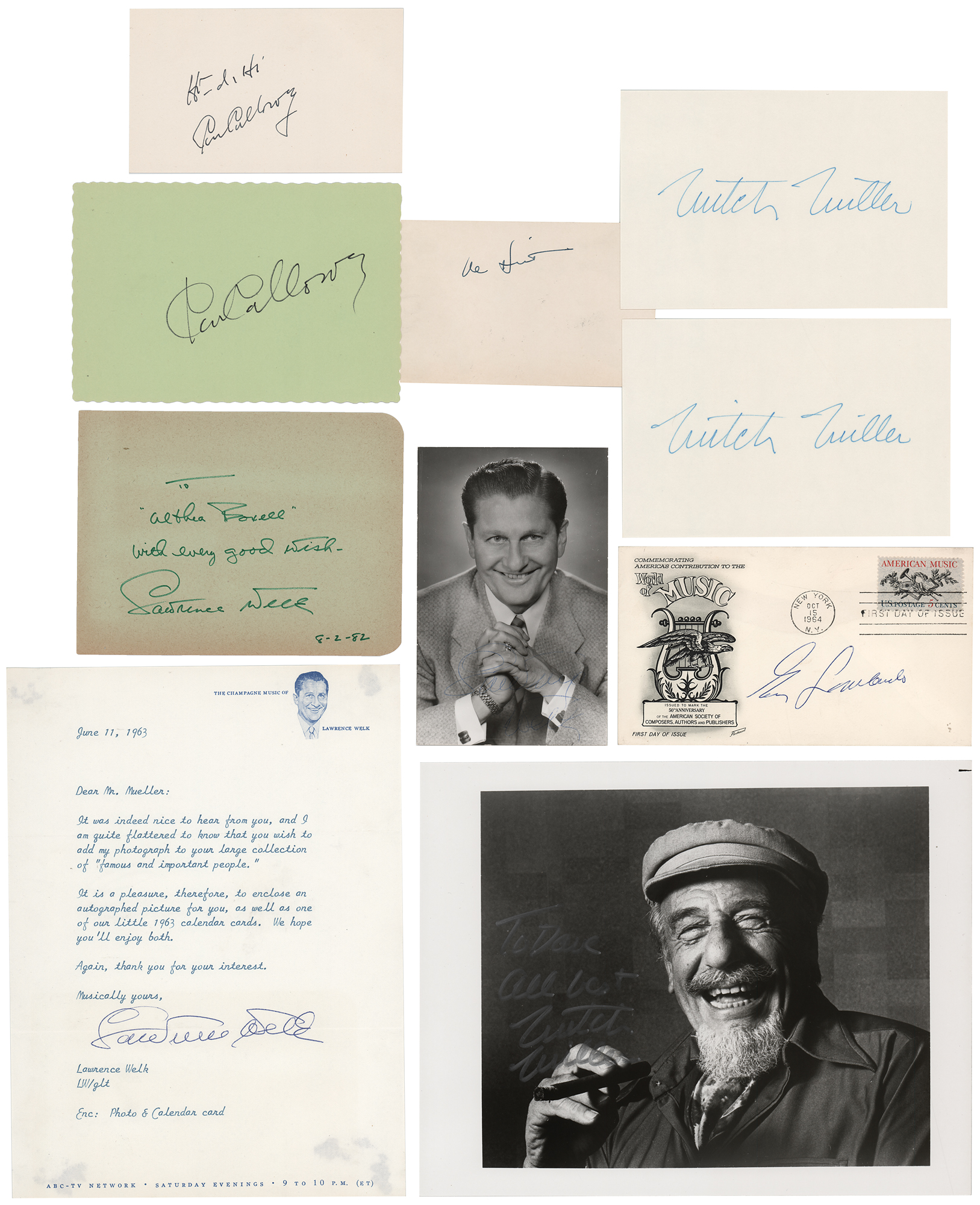 Group lot of 10 items signed by five notable band leaders across various formats, which includes: Cab Calloway (2), Al Hirt, Guy Lombardo, Mitch Miller (3), and Lawrence Welk (3). In overall fine condition.
