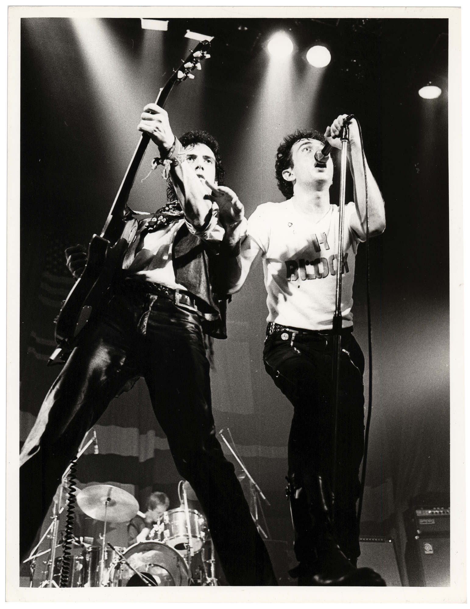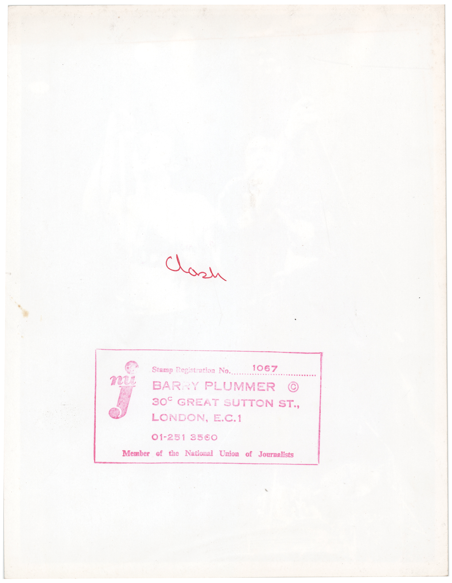 Vintage glossy 7.75 x 10 concert photograph of the Clash by Barry Plummer, which shows Mick Jones and Joe Strummer performing on stage at the Roxy Club in Harlesdon, London, England, on October 26, 1978, which was part of the group’s Sort It Out Tour. The reverse bears a photography credit stamp attributed to Barry Plummer. In fine condition. Accompanied by a certificate of authenticity from Tracks.