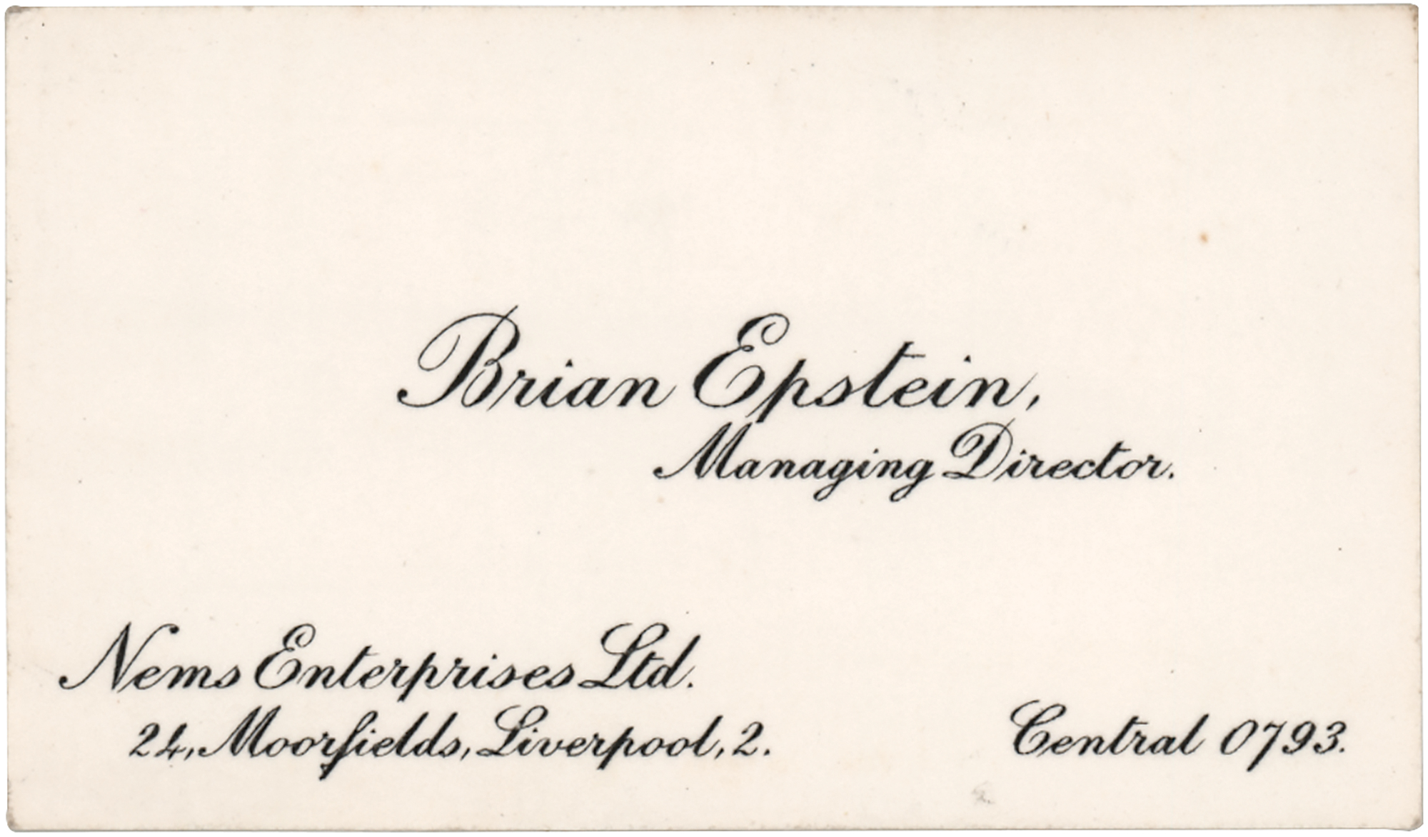 Scarce original personal NEMS Enterprises Ltd. business card, 3 x 1.75, listing Brian Epstein as the "Managing Director." In fine condition. Accompanied by a certificate of authenticity from Tracks.
