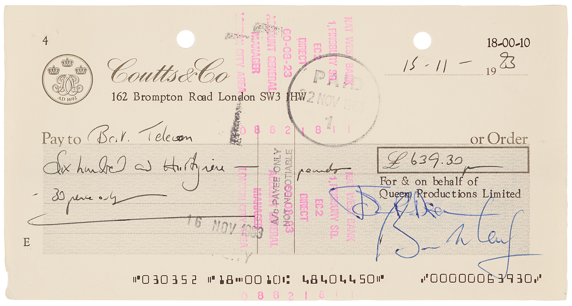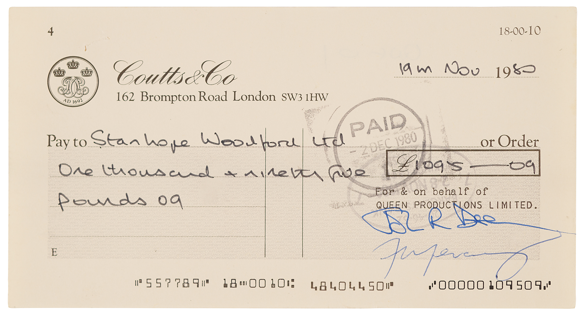 Set of three 7.5 x 4 Coutts & Co. 'Queen Productions Ltd.' and ‘Raincloud Productions Ltd.’ business checks from 1980, 1981, and 1983, each filled out in another hand and signed in ballpoint or ink by two members of Queen, with John Deacon signing all three as “John R. Deacon.” The earliest check, November 19, 1980, payable to British property developer “Stanhope Woodford Ltd” for £1095.09, is co-signed by Freddie Mercury; the second, July 2, 1981, also payable to the aforesaid property developer for £1121, is co-signed by Roger Taylor; and the third, November 15, 1983, payable to British Telecom for £639.30, is co-signed by Brian May. In overall fine condition. Accompanied by a certificate of authenticity from Tracks.