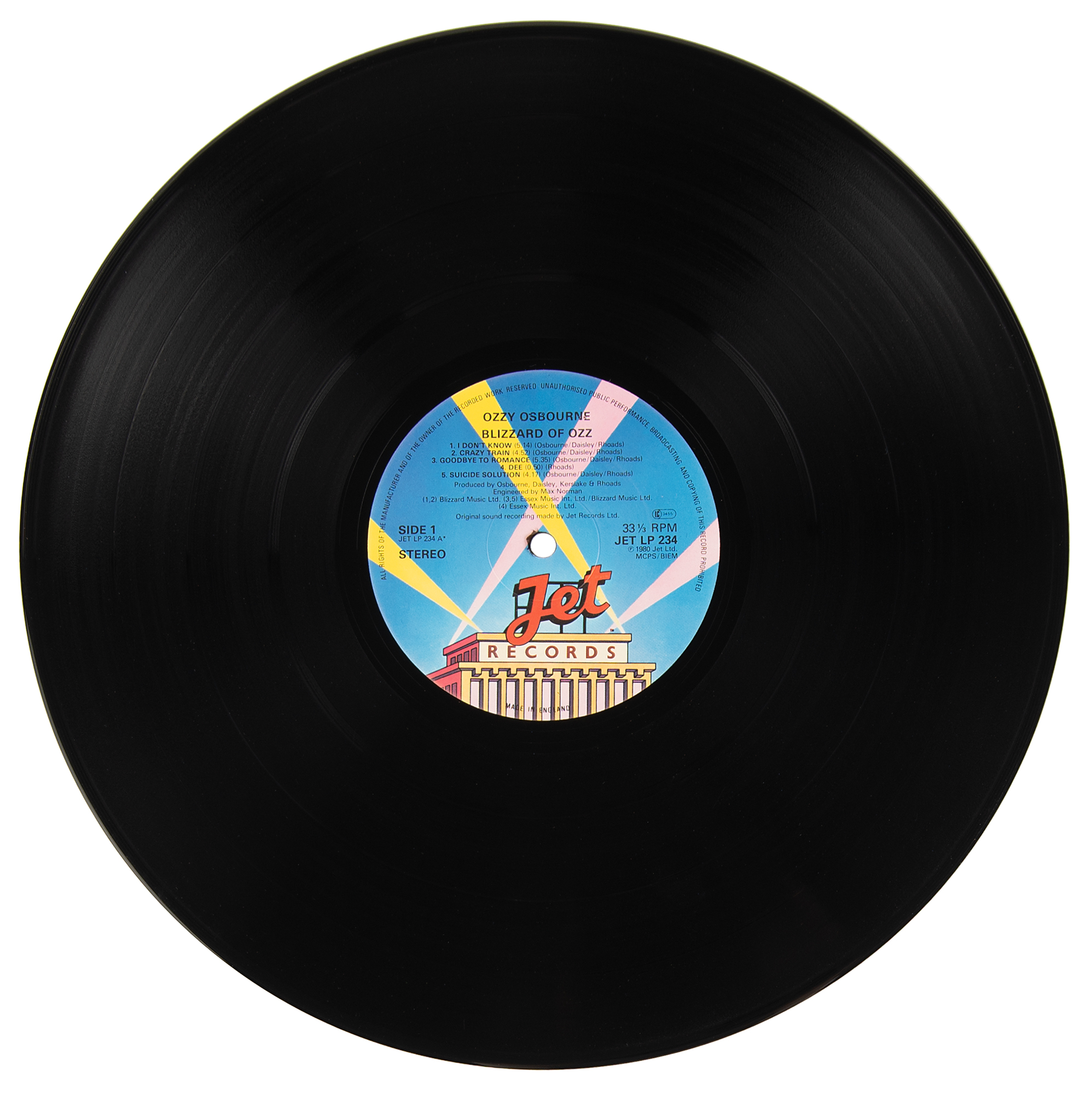 Sought-after Blizzard of Ozz album by Ozzy Osbourne, signed on the front cover in blue or black ballpoint by Osbourne, Randy Rhoads, Bob Daisley, and Lee Kerslake. In fine condition, with light edge wear, and reduced ink flow to the end of Ozzy's signature. The record is included. Accompanied by a certificate of authenticity from Tracks.