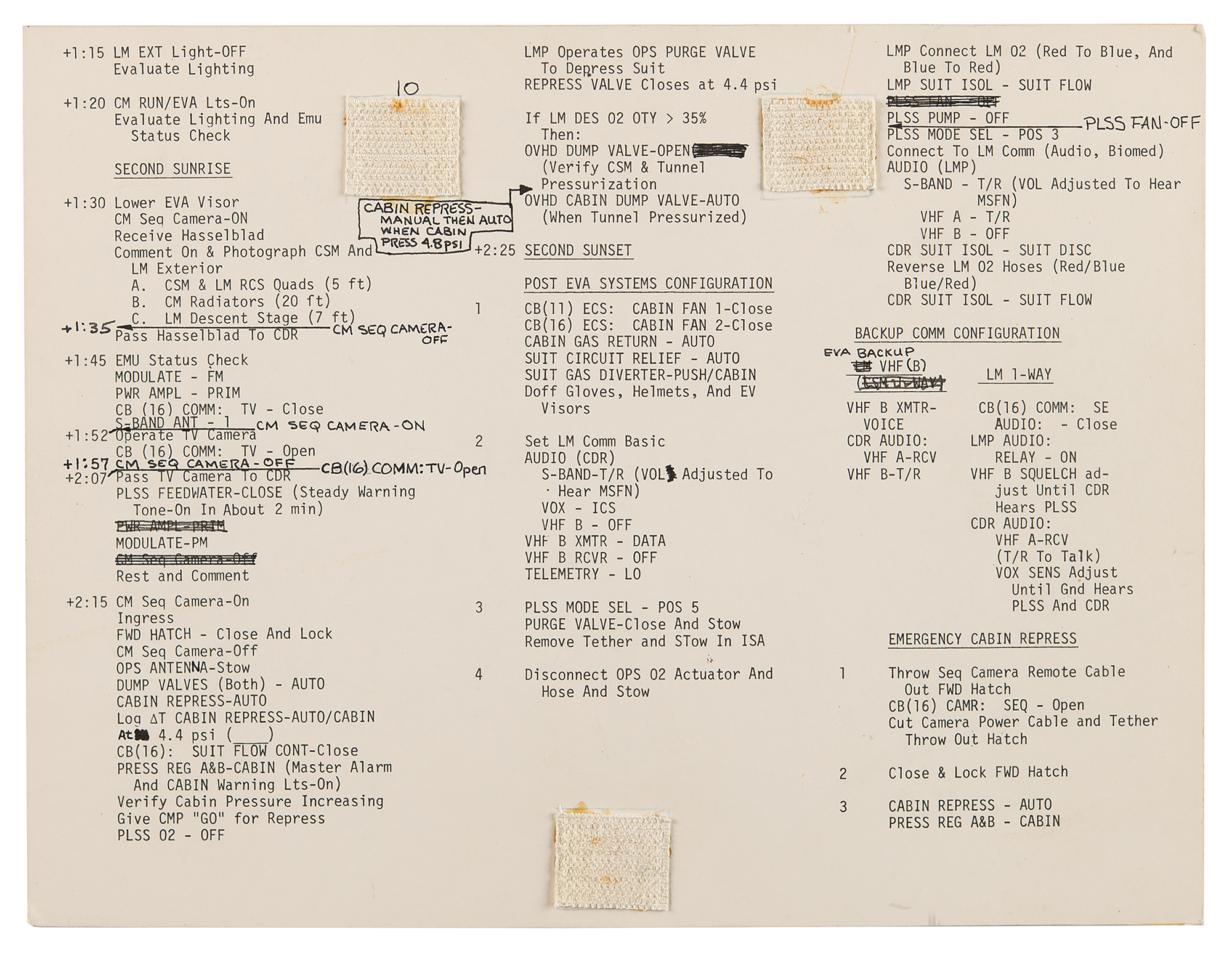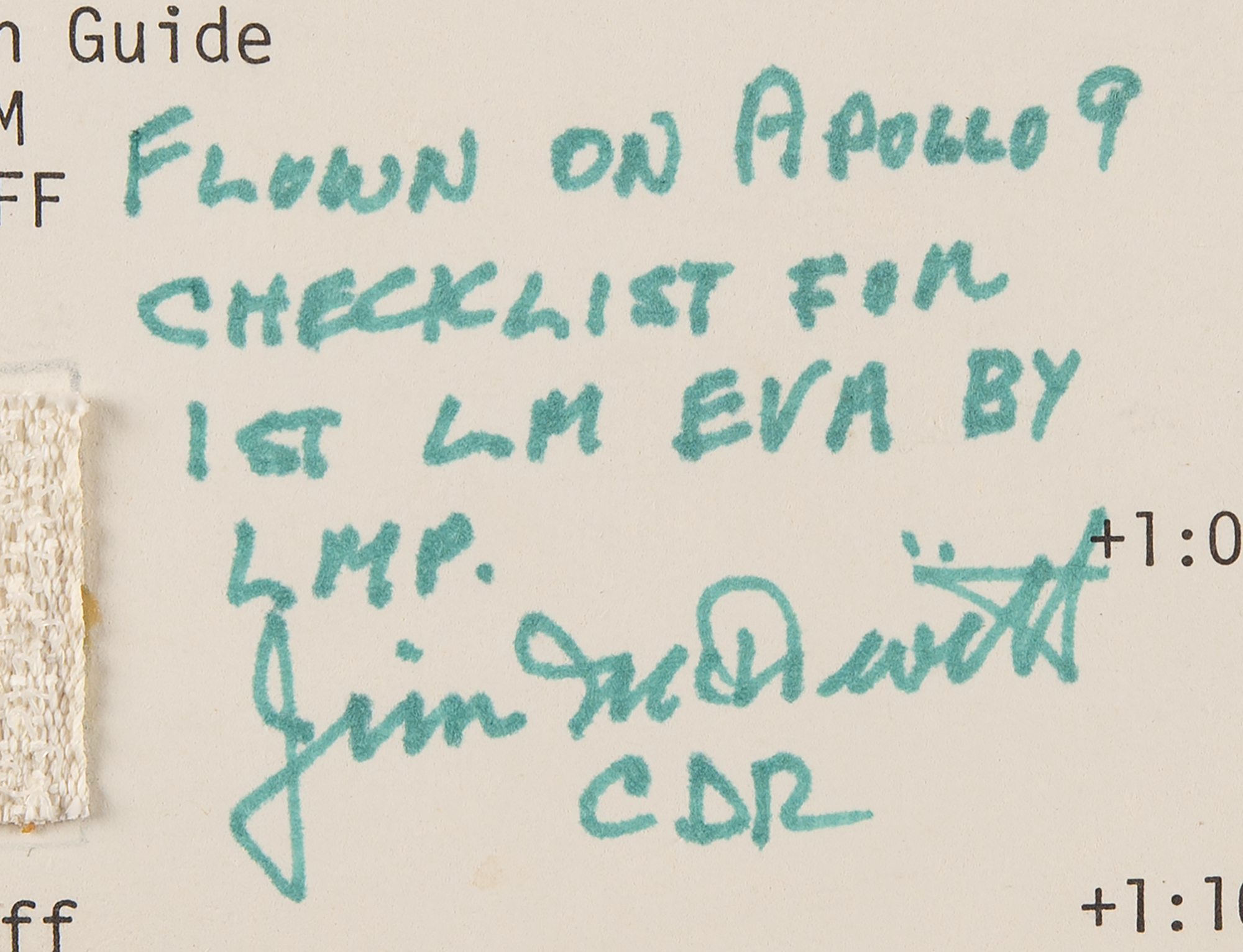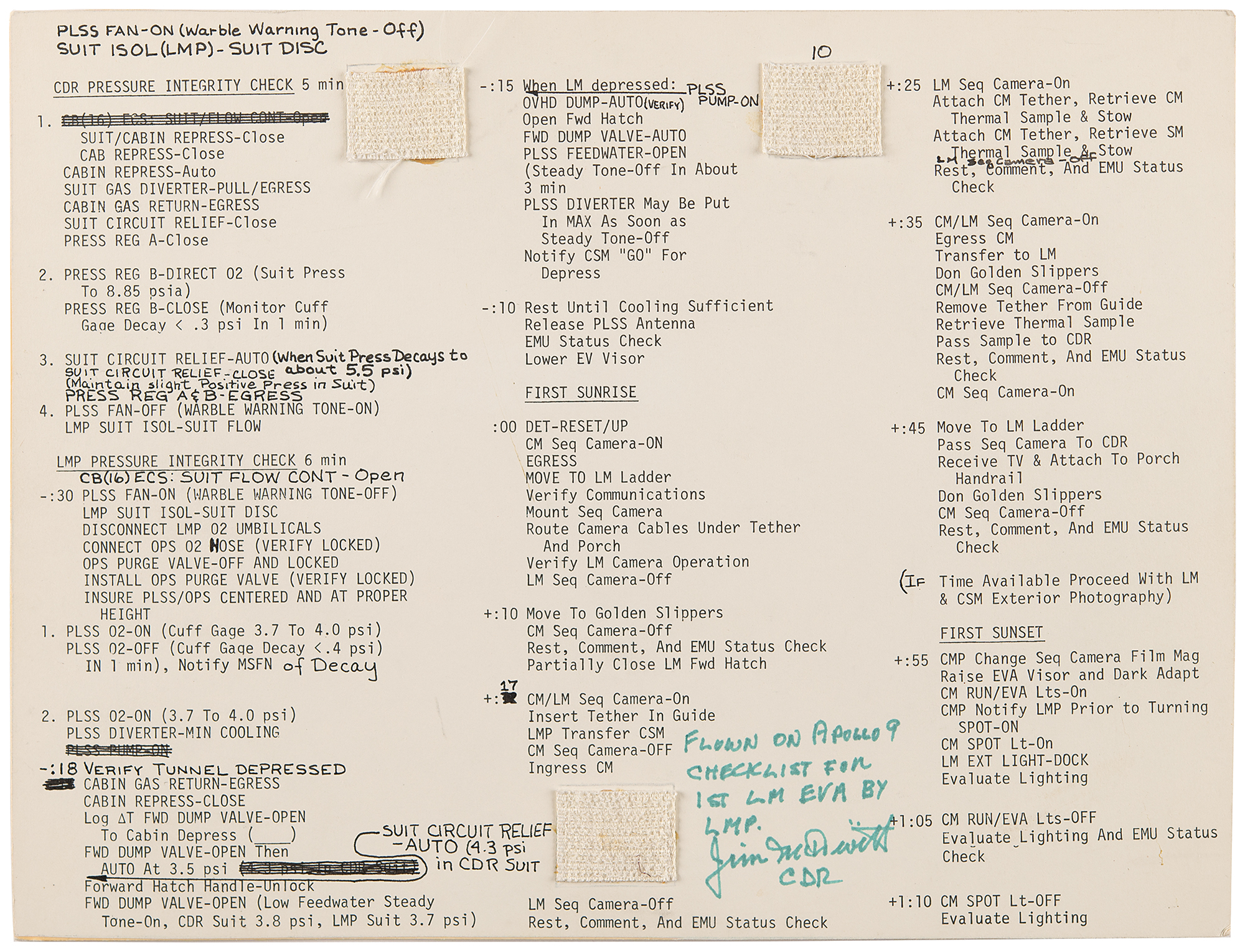Historic flown double-sided cue card carried on Apollo 9, 10.5 x 8, signed and flight-certified in green felt tip, "Flown on Apollo 9, Checklist for 1st LM EVA by LMP. Jim McDivitt, CDR." The card walks through various steps for a "CDR Pressure Integrity Check" and "LMP Pressure Integrity Check"; photography procedures for "First Sunrise," "First Sunset," "Second Sunrise," and "Second Sunset"; "Post EVA Systems Configuration"; "Backup Comm Configuration"; and "Emergency Cabin Repress." Both sides bear affixed Velcro swatches and various notations and modifications made in black ink (e.g. "PLSS Fan - On (Warble Warning Tone - Off)," "Suit Circuit Relief - Auto (4.3 psi in CDR Suit)," and "EVA Backup"). In fine condition.