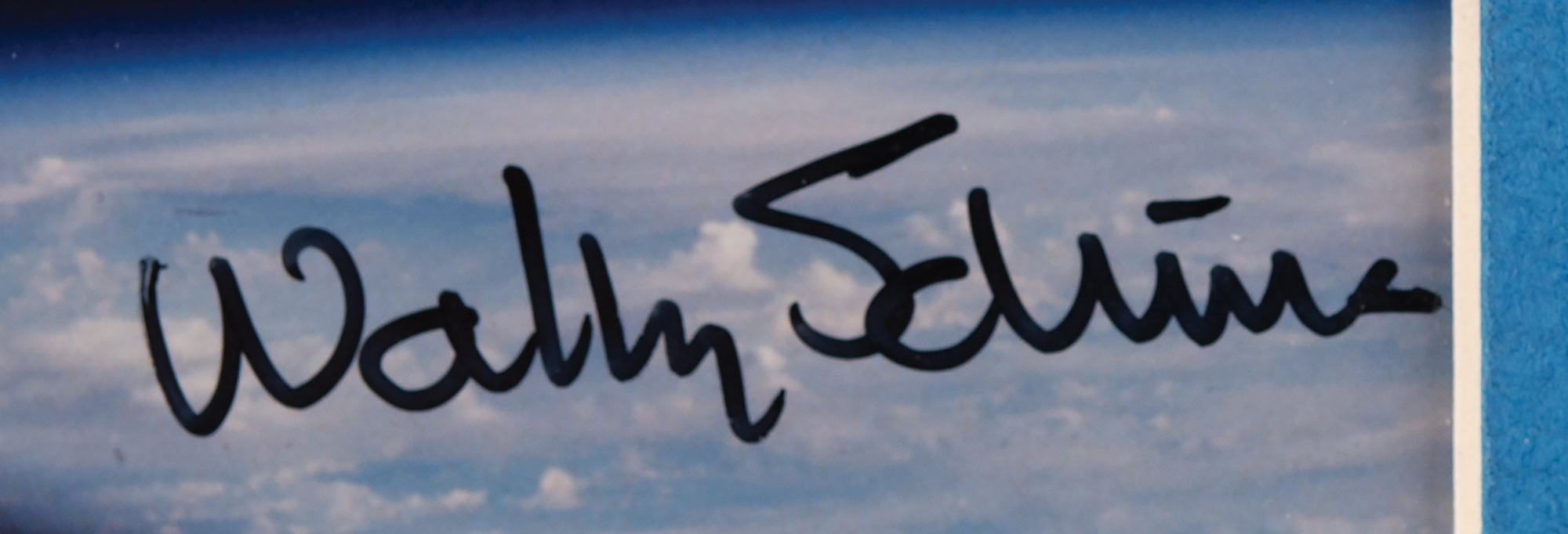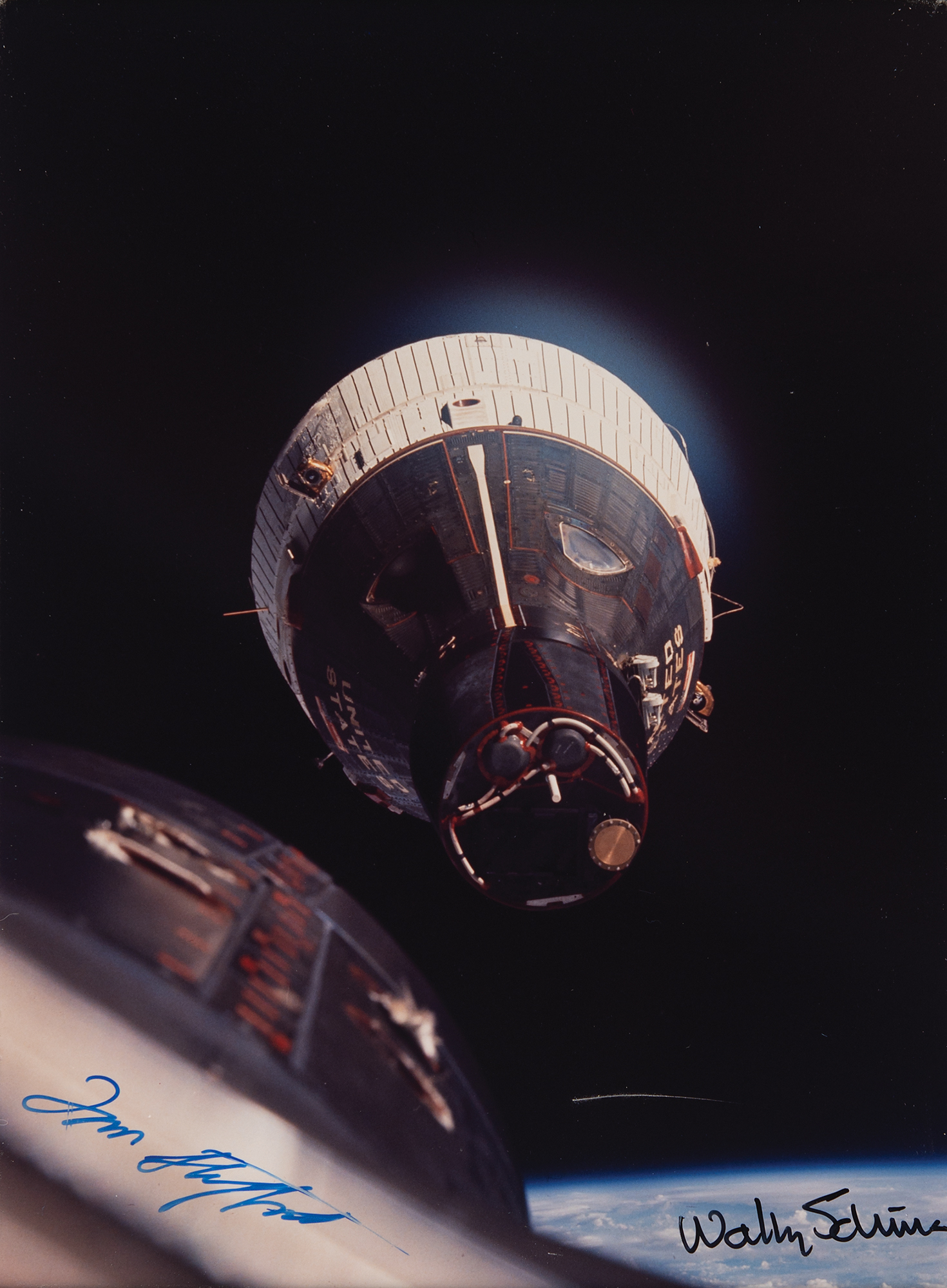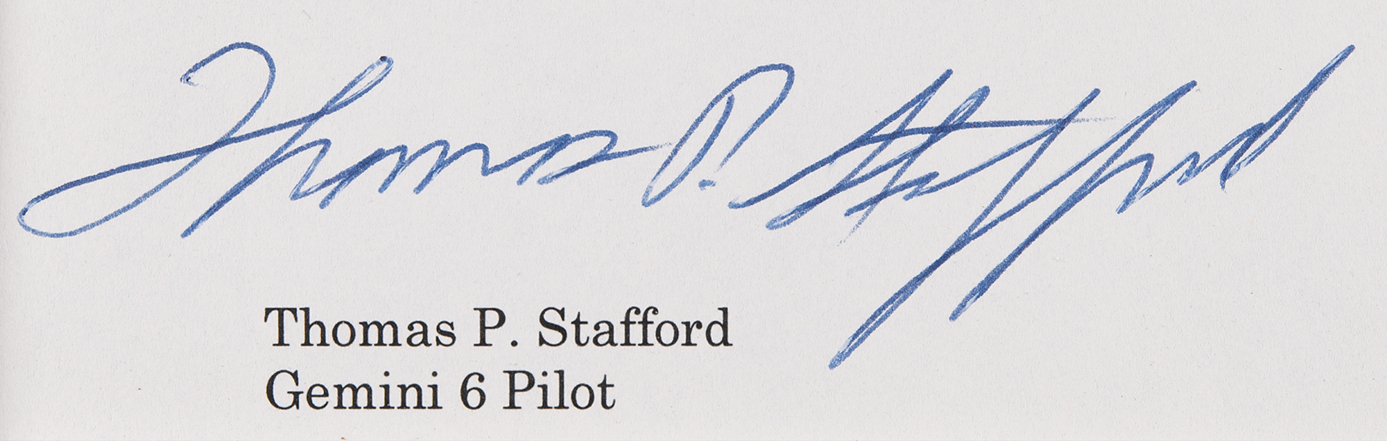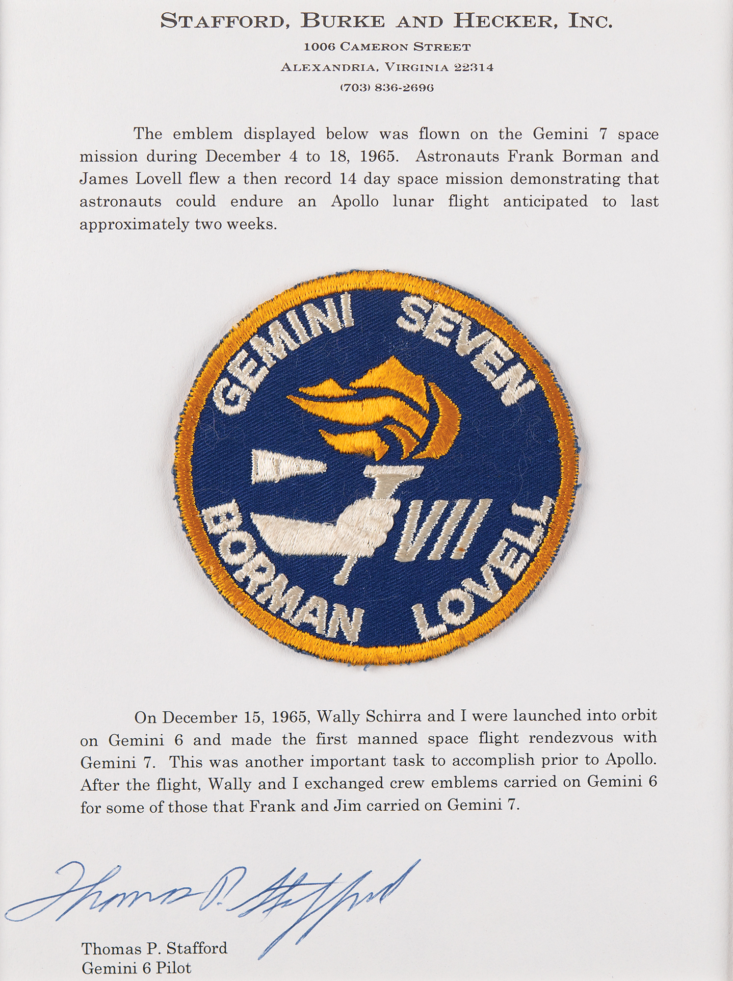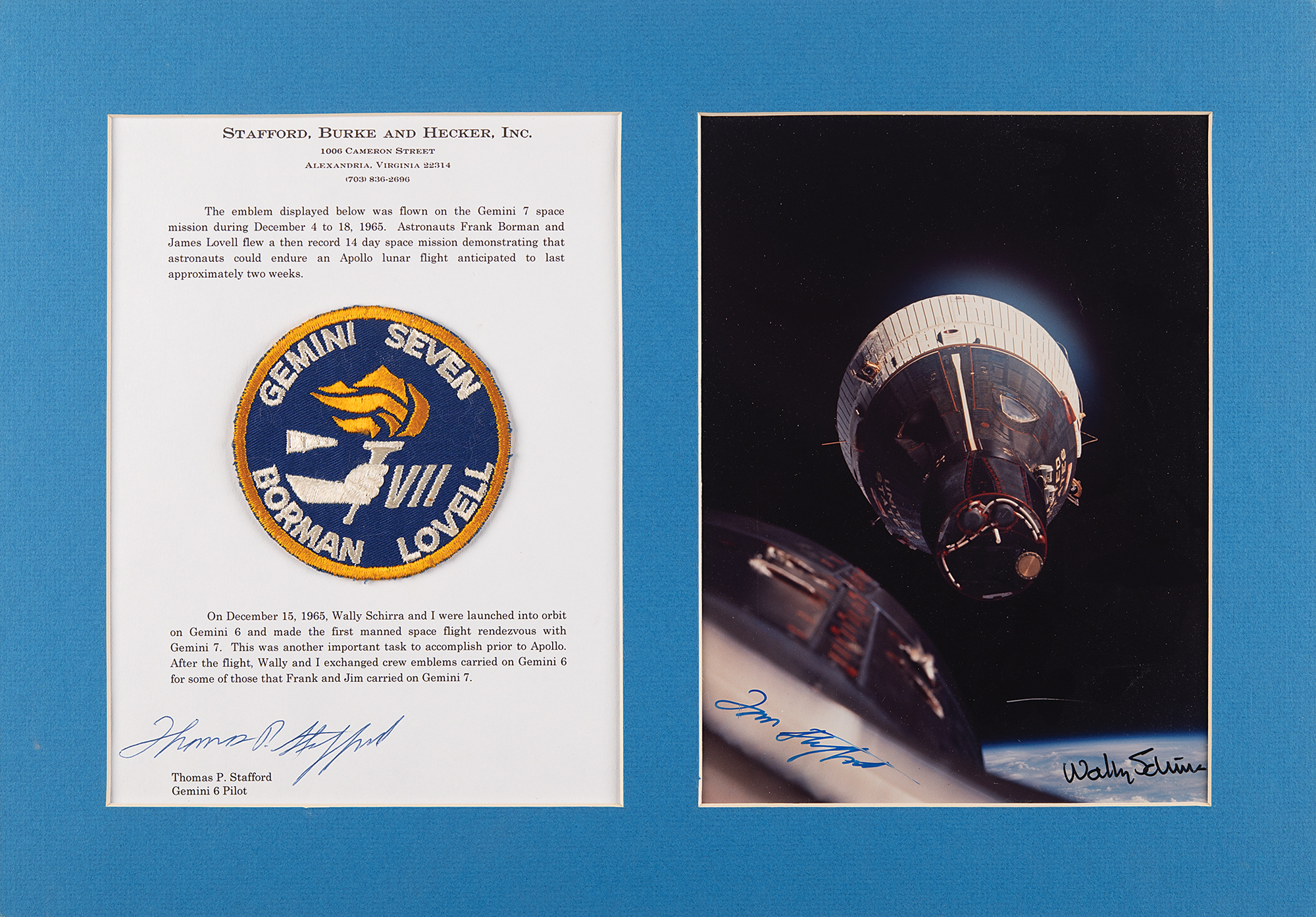 Flown embroidered Gemini 7 crew souvenir insignia patch carried on the mission, measuring 3.75˝ in diameter, affixed to a letter of provenance on Stafford, Burke and Hecker letterhead, signed in blue ballpoint, "Thomas P. Stafford." In part: "The emblem displayed below was flown on the Gemini 7 space mission during December 4 to 18, 1965. Astronauts Frank Borman and James Lovell flew a then record 14 day space mission demonstrating that astronauts could endure an Apollo lunar flight anticipated to last approximately two weeks. On December 15, 1965, Wally Schirra and I were launched into orbit on Gemini 6 and made the first manned space flight rendezvous with Gemini 7. This was another important task to accomplish prior to Apollo. After the flight, Wally and I exchanged crew emblems carried on Gemini 6 for some of those that Frank and Jim carried on Gemini 7." Displayed with a color photo of the Gemini 7 rendezvous, signed in felt tip, "Tom Stafford" and "Wally Schirra," matted to an overall size of 18 x 12.5. In fine condition, with a small surface scratch to the signed photograph.