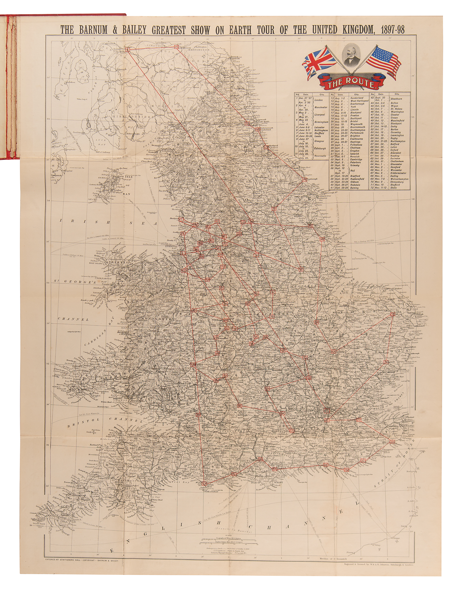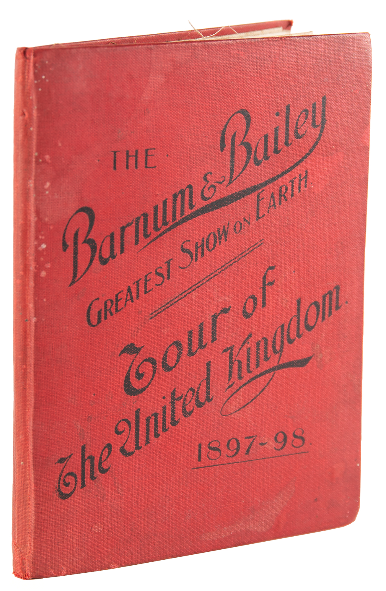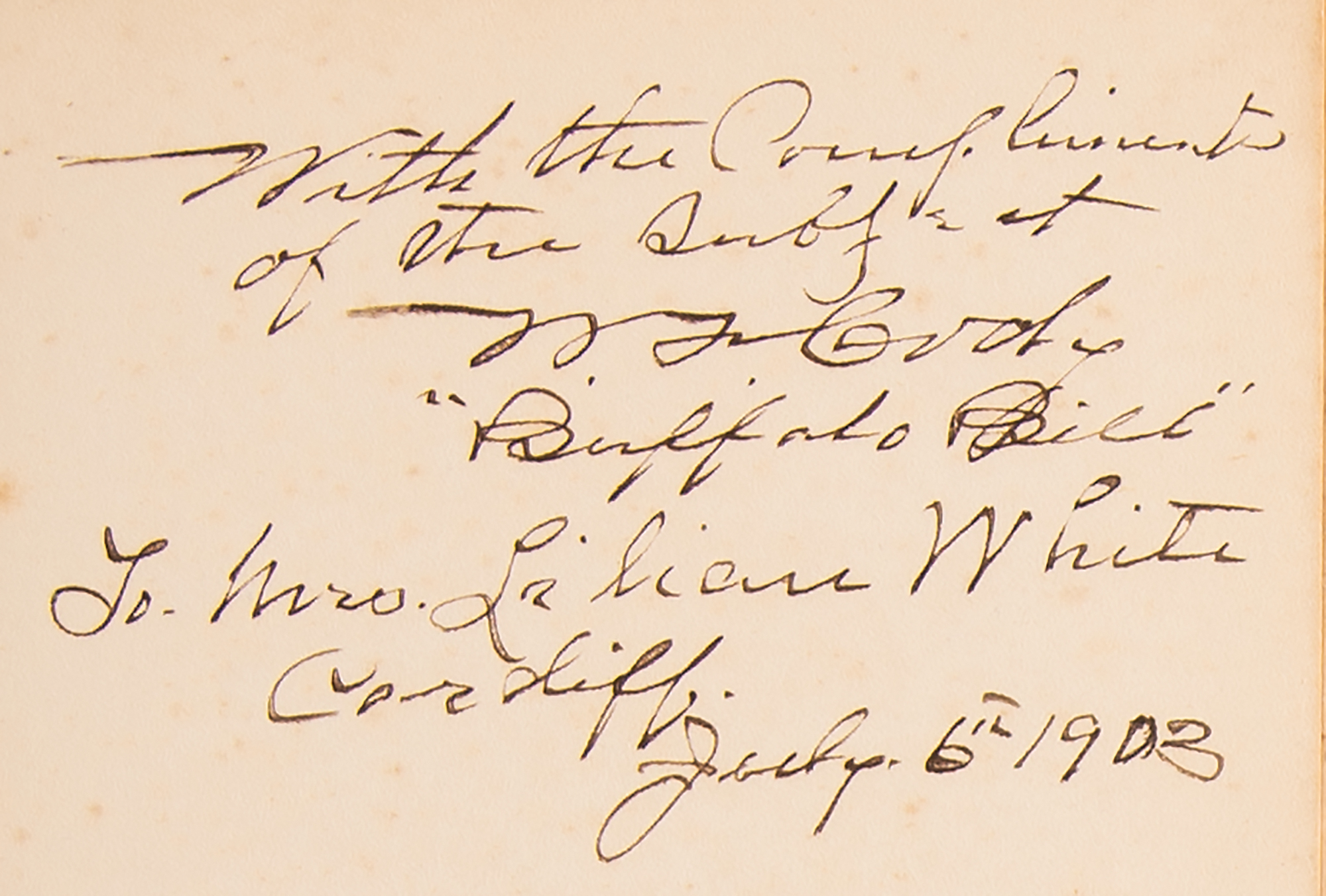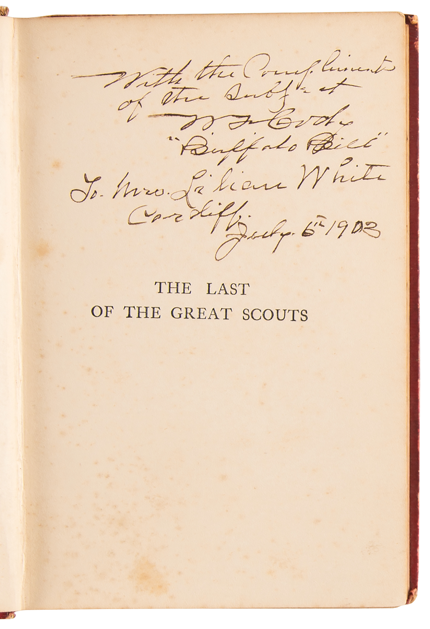 Signed book: The Last of the Great Scouts: The Life Story of Col. William F. Cody. Later printing. London: The Partington Advertising Company, 1903. Hardcover, 5.25 x 7.75, 296 pages. Signed and inscribed on the half-title page in fountain pen, "With the Compliments of the subject, W. F. Cody, 'Buffalo Bill,' To Mrs. Lilian White, Cardiff, July 6th, 1903." Autographic condition: very good to fine, with foxing to the signed page affecting only appearance. Book condition: G+/None, with scattered scratches to boards, sunning and chipping to spine, and some dampstaining to rear endpapers. Consignor notes that the recipient was a performer with the Barnum & Bailey Circus; accompanied by a folding map of "The Barnum & Bailey Greatest Show on Earth Tour of the United Kingdom 1897–98," bound in red hardcover boards.