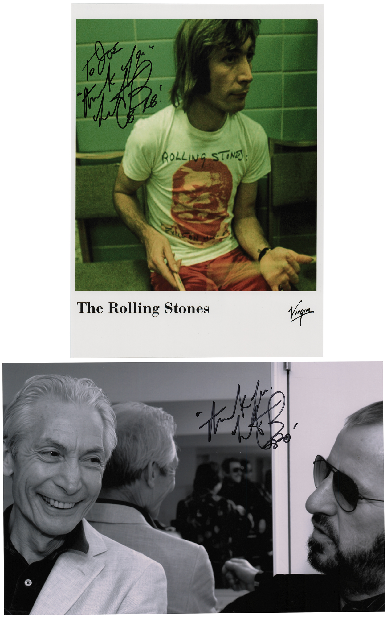 Two glossy photos signed by Rolling Stones drummer Charlie Watts: one 12 x 8 photo of Watts with Beatles drummer Ringo Starr, signed in black felt tip; and a color 8 x 11.25 photo of Watts wearing a Rolling Stones shirt and using his drum sticks backstage, signed and inscribed in black felt tip to "Joe." In fine condition.