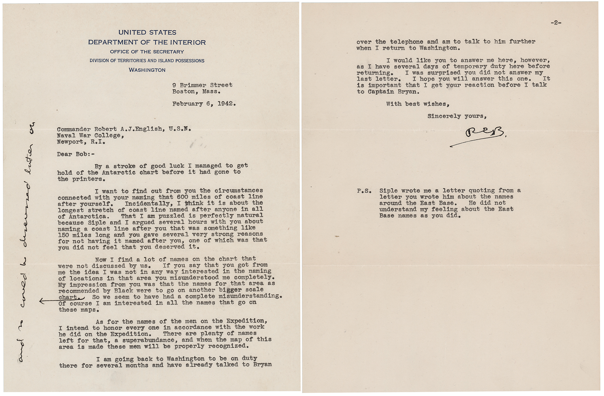 TLS signed “R.E.B.,” two pages, 8 x 10.5, United States Department of the Interior letterhead, February 6, 1942. Letter to Commander Robert A.J. English, in full: "By a stroke of good luck I managed to get hold of the Antarctic chart before it had gone to the printers. I want to find out from you the circumstances connected with your naming that 600 miles of coast line after yourself. Incidentally, I think it is about the longest stretch of coast line named after anyone in all of Antarctica. That I am puzzled is perfectly natural because Siple and I argued several hours with you about naming a coast line after you that was something like 150 miles long and you gave several very strong reasons for not having it named after you, one of which was that you did not feel that you deserved it. Now I find a lot of names on the chart that were not discussed by us. If you say that you got from me the idea I was not in any way interested in the naming of locations in that area you misunderstood me completely. My impression from you was that the names for that area as recommended by Black were to go on another bigger scale chart. So we seem to have had a complete misunderstanding. Of course I am interested in all the names that go on these maps. As for the names of the men on the Expedition, I intend to honor every one in accordance with the work he did on the Expedition. There are plenty of names left for that, a superabundance, and when the map of this area is made these men will be properly recognized. I am going back to Washington to be on duty there for several months and have already talked to Bryan over the telephone and am to talk to him further when I return to Washington. I would like you to answer me here, however, as I have several days of temporary duty here before returning. I was surprised you did not answer my last letter. I hope you will answer this one. It is important that I get your reaction before I talk to Captain Bryan… P.S. Siple wrote me a letter quoting from a letter you wrote him about the names around the East Base. He did not understand my feeling about the East Base names as you did." In fine condition.