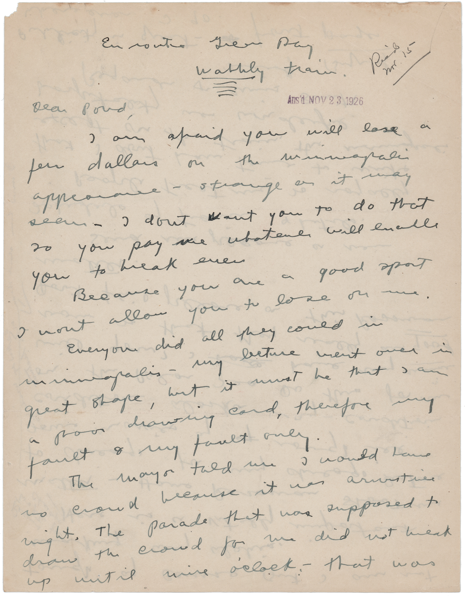 Explorer and pilot (1888–1957) who claimed to be the first to reach the North and South Poles by air. ALS signed "Byrd," one page both sides, 8.5 x 11, no date but circa November 1926. Handwritten letter to lecture manager James B. Pond, Jr., in part: "I am afraid you will lose a few dollars on the Minneapolis appearance—strange as it may seem—I don't want you to do that so you pay me whatever will enable you to break even. Because you are a good sport I won't allow you to lose on me. Everyone did all they could in Minneapolis—my lecture went over in great shape, but it must be that I am a poor drawing card, therefore my fault & my fault only.