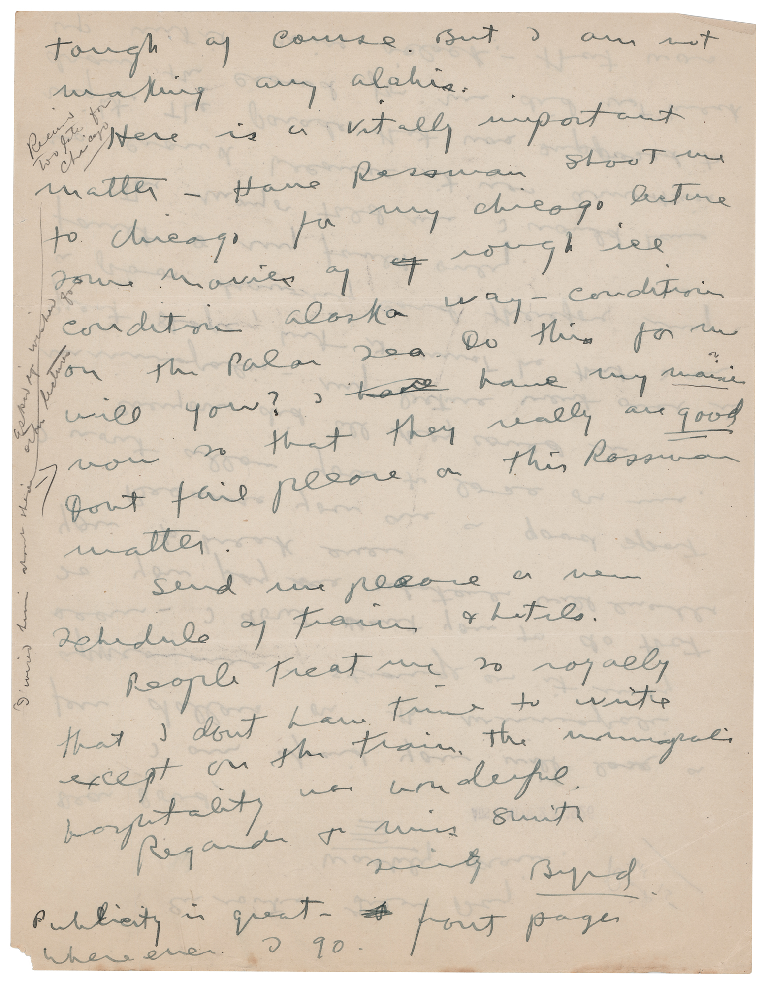 The mayor told me I would have no crowd…The parade that was supposed to draw the crowd for me did not break up untill nine o'clock—that was tough of course, but I am not making any alabis. Here is a vitally important matter—have Rassman shoot me to Chicago, for my Chicago lecture tour movies of rough ice conditions Alaska way—conditions on the Polar Sea. Do this for me will you?…Send me please a new schedule of trains & hotels…Publicity is great—front pages wherever I go." In fine condition, with trivial loss to the upper left corner.
