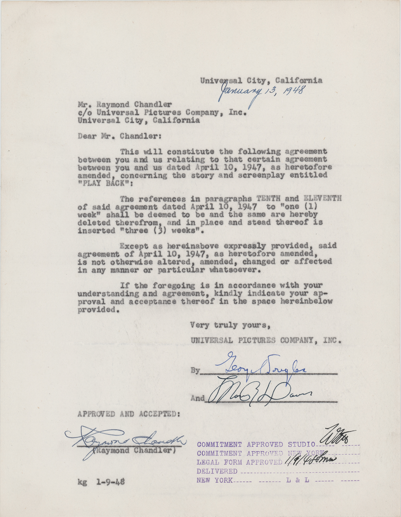 DS, one page, 8.5 x 11, January 13, 1948. An agreement between the Universal Pictures Company and Chandler, in full: "This will constitute the following agreement between you and us relating to that certain agreement between you and us dated April 10, 1947, as heretofore amended, concerning the story and screenplay entitled 'PLAY BACK': The references in in paragraphs TENTH and ELEVENTH of said agreement dated April 10, 1947 to 'one (1) week' shall be deemed to be and the same are hereby deleted therefrom, and in place and stead thereof is inserted 'three (3) weeks.' Except as hereinabove expressly provided, said agreement of April 10, 1947, as heretofore amended is not otherwise altered, amended, changed or affected in any manner or particular whatsoever. If the foregoing is in accordance with your understanding and agreement, kindly indicate your approval and acceptance thereof in the space hereinbelow provided." Signed at the conclusion in blue ballpoint by Raymond Chandler, and countersigned by two Universal Pictures representatives. In fine condition.