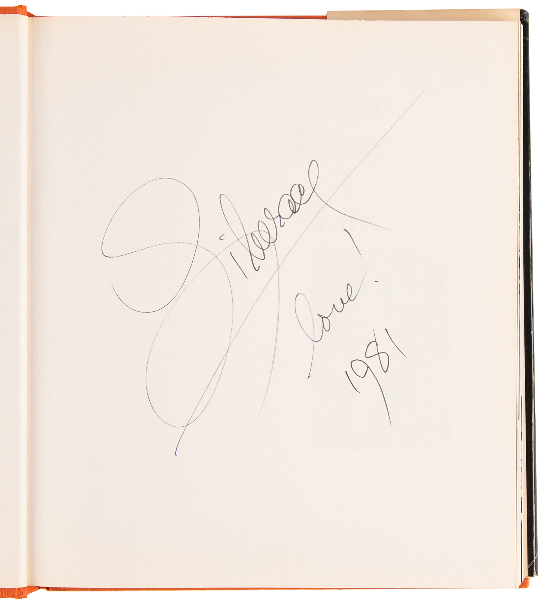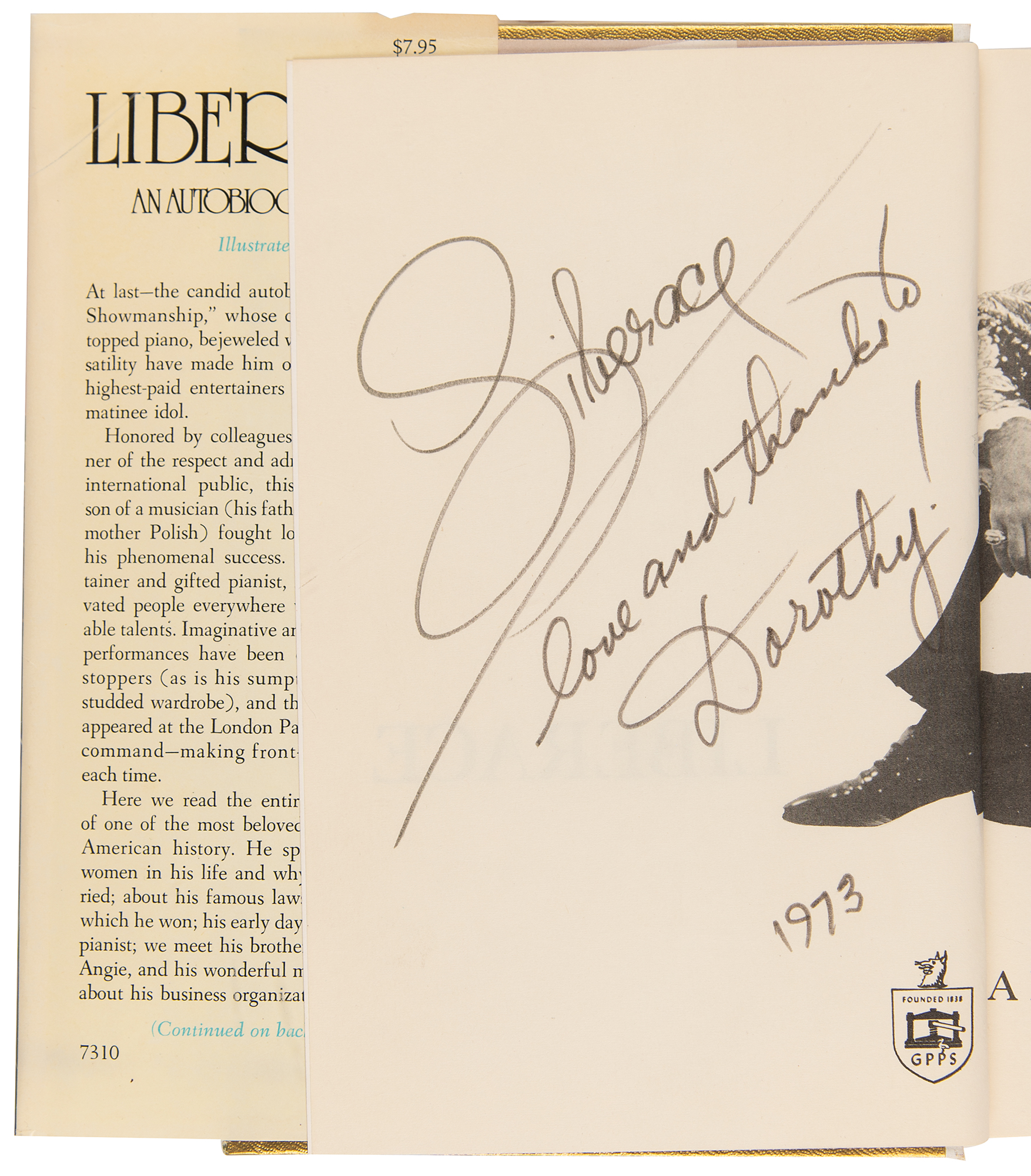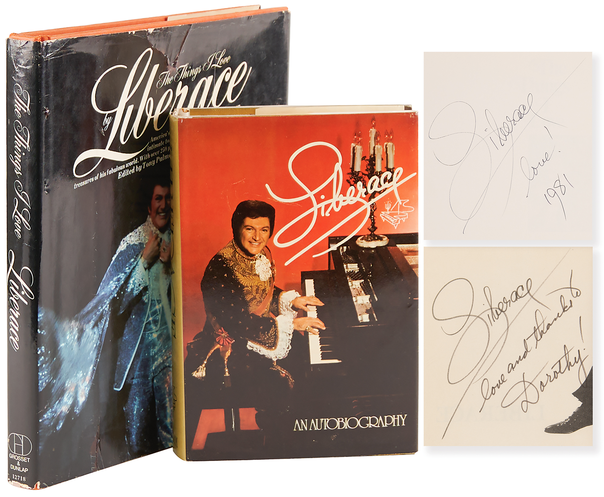 Two signed books: a first edition of Liberace: An Autobiography, hardcover with dust jacket, published by G.P. Putnam's Sons in 1973, signed and inscribed opposite the title page in black felt tip, "Liberace, Love and thanks to Dorothy! 1973"; and a second printing of The Things I Love, hardcover with dust jacket, published by Grosset & Dunlap in 1977, signed on the first free end page in black felt tip, "Liberace, love! 1981." In overall fine condition, with tears to the larger book's dust jacket, as well as a presentation inscription in another hand on the front pastedown.