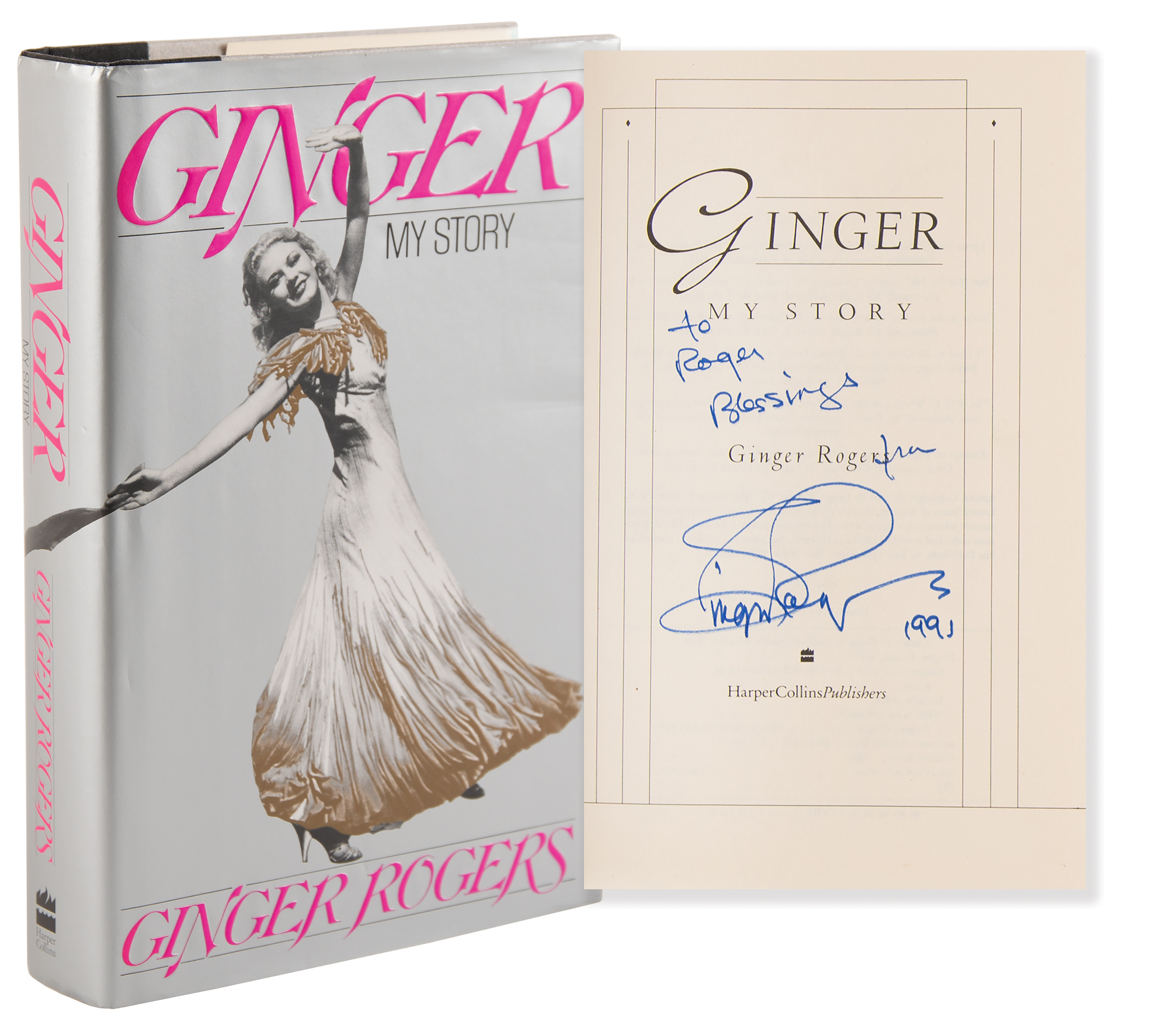 Signed book: Ginger: My Story. Later printing. NY: HarperCollins, 1991. Hardcover with dust jacket, 6.5 x 9.5, 450 pages. Signed and inscribed on the title page in blue felt tip, "To Roger, Blessings, Ginger Rogers, 1991." In fine condition.