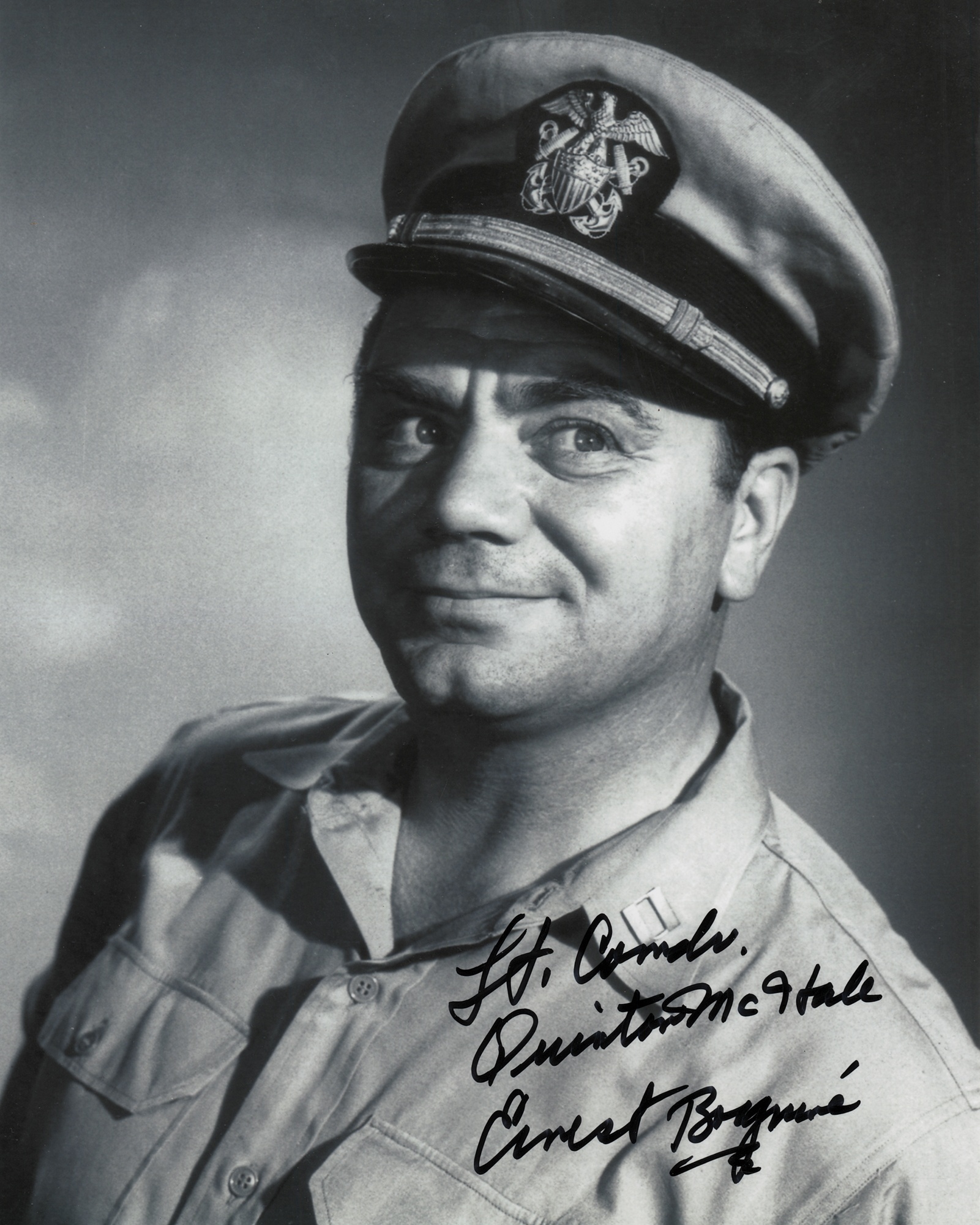 Glossy 8 x 10 head-shot photo of Borgnine in his starring role in McHale's Navy, signed in black felt tip, "Lieutenant Commander Quinton McHale, Ernest Borgnine." In very fine condition.