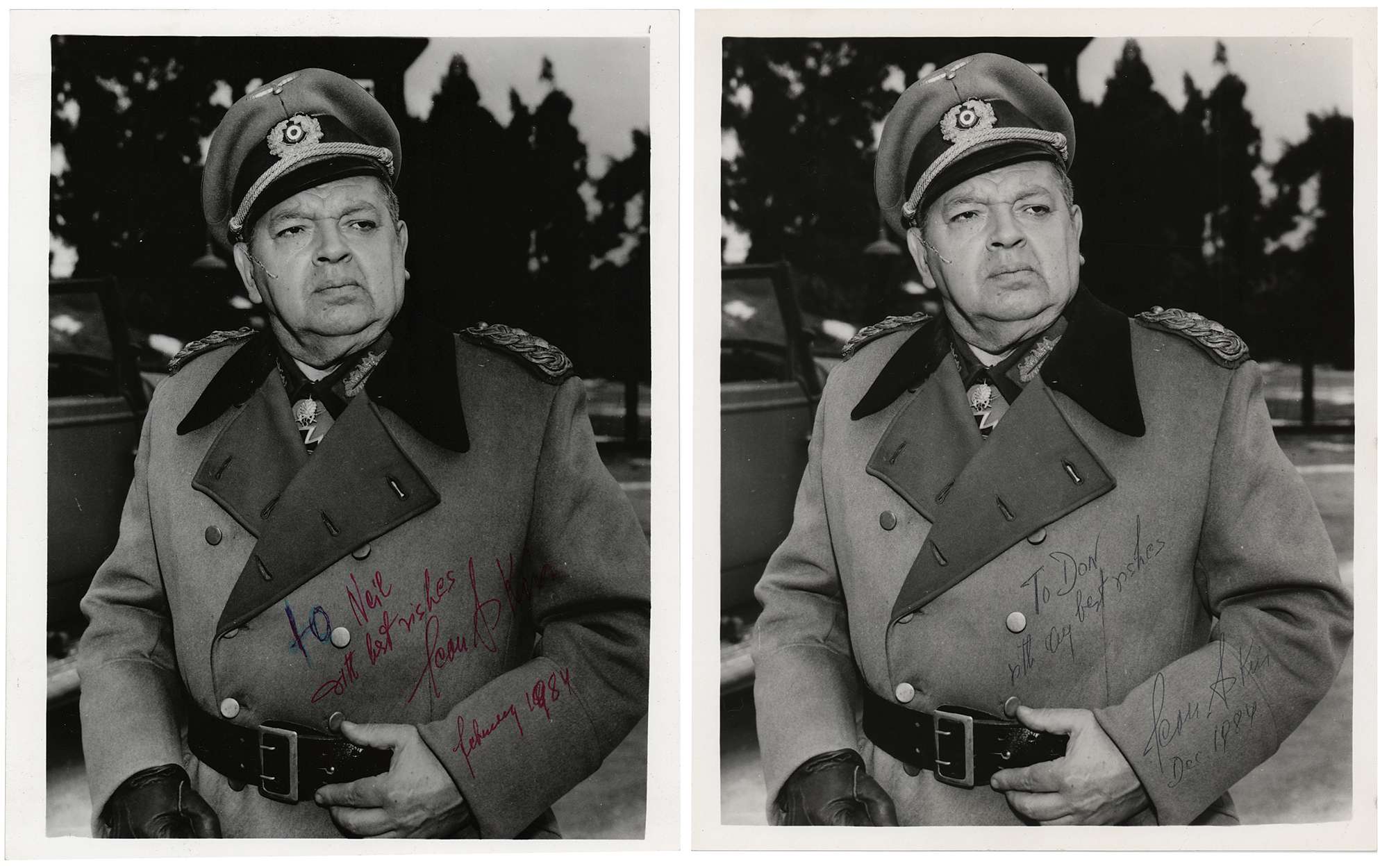 Two glossy 8 x 10 photos of Leon Askin as General Albert Burkhalter in Hogan's Heroes, each signed and inscribed in ballpoint by the actor. In very good to fine condition, with scattered light surface impressions, and pen trouble to the start of one inscription.