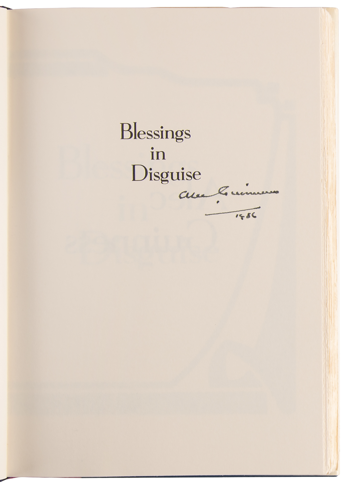 Signed book: Blessings in Disguise. First American edition. NY: Alfred A. Knopf, 1985. Hardcover with dust jacket, 6.5 x 9.5, 238 pages. Signed on the half-title page in fountain pen, "Alec Guinness, 1986." In fine condition.