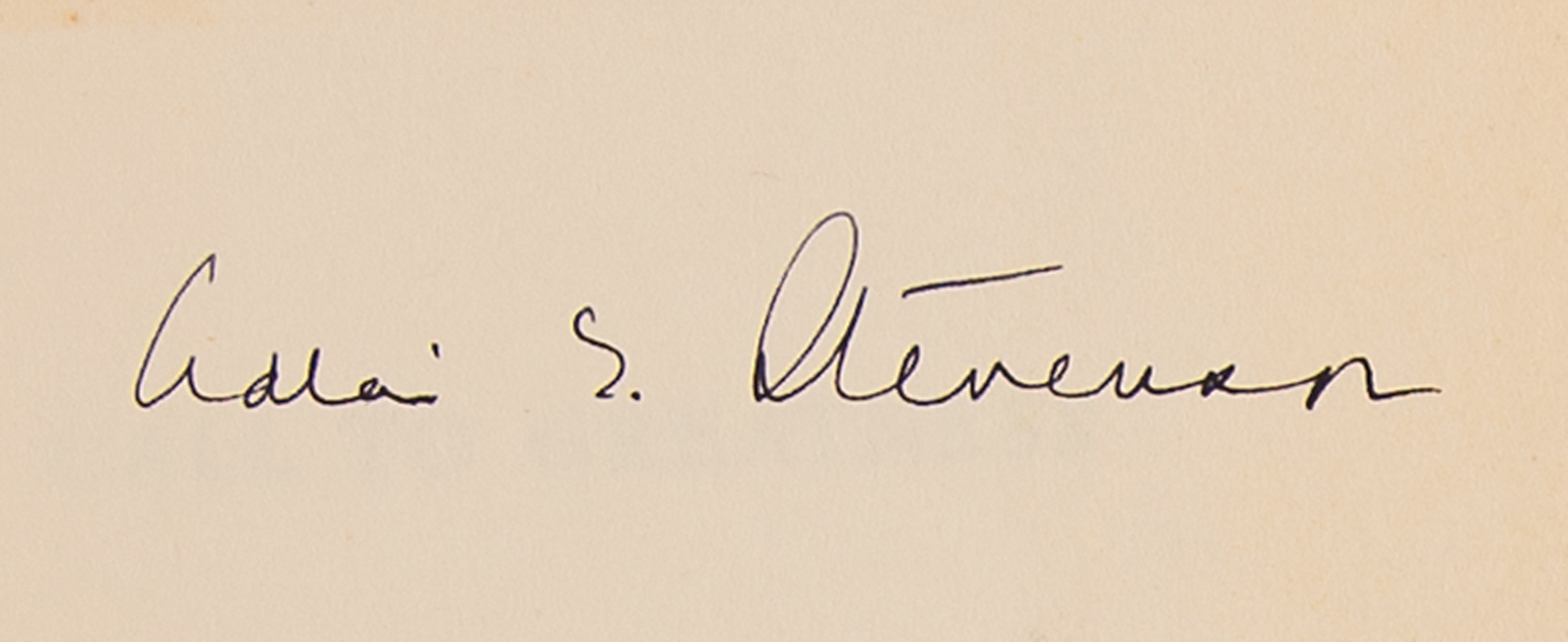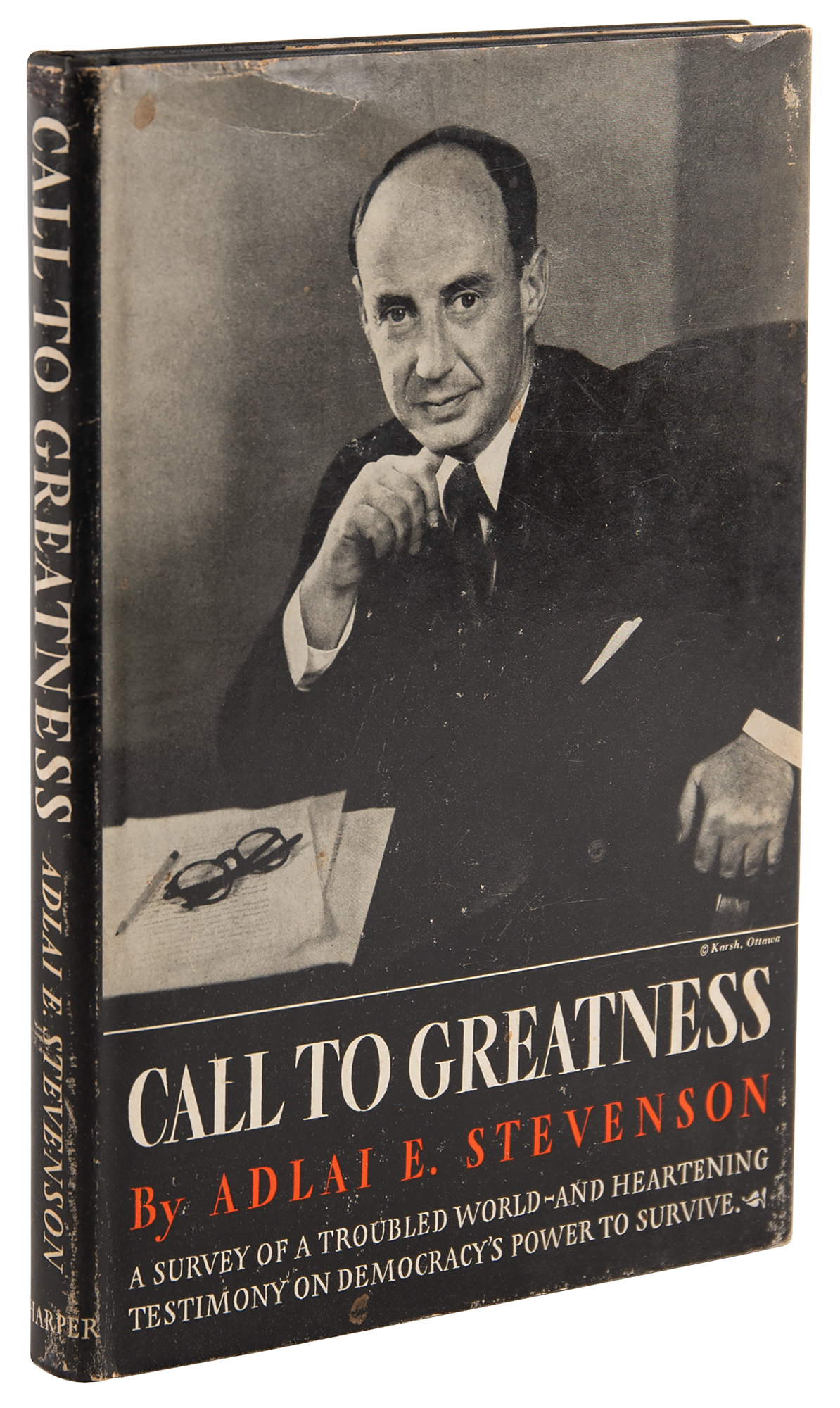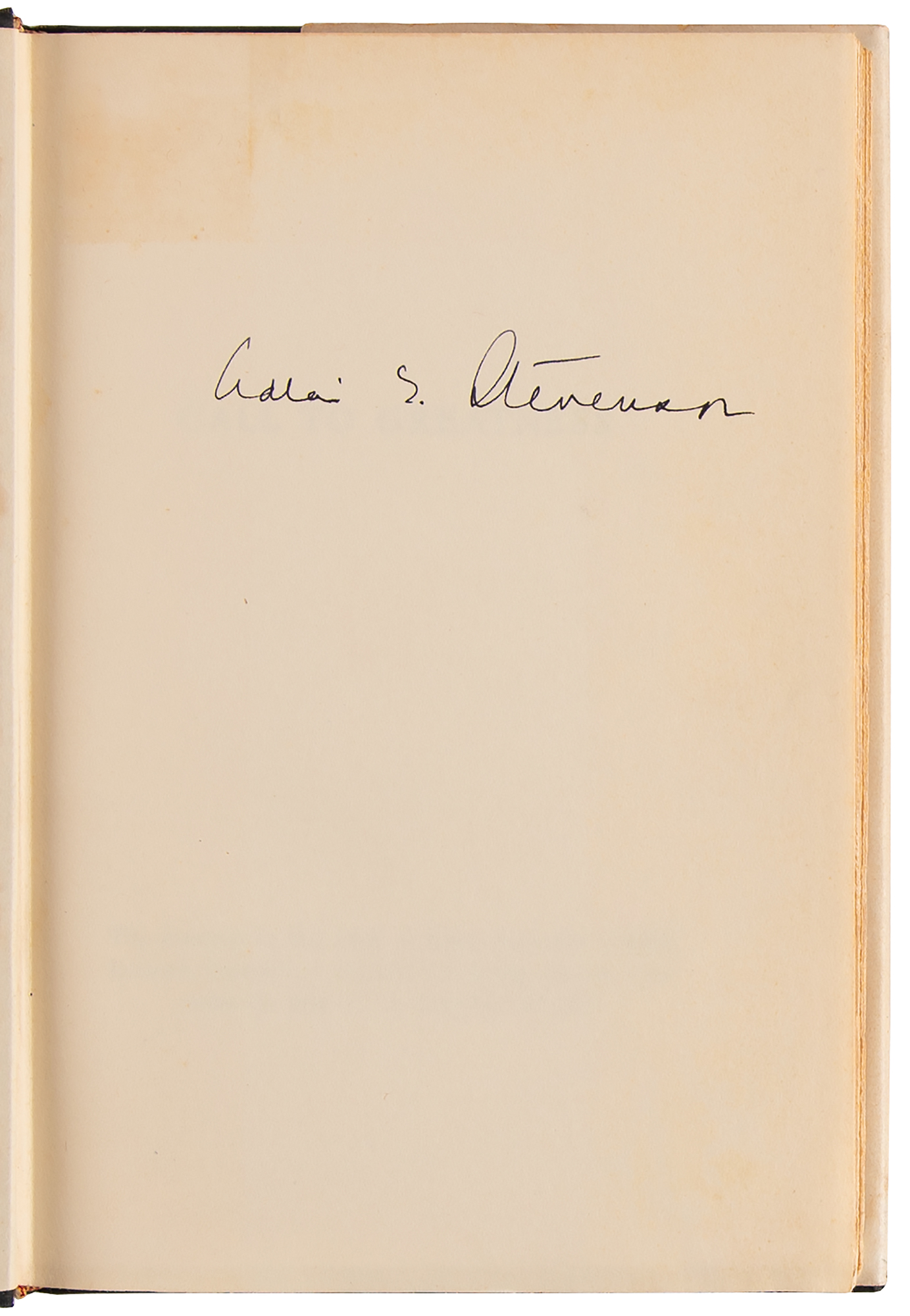 Signed book: Call to Greatness. First edition. NY: Harper & Brothers, 1954. Hardcover with dust jacket, 5.75 x 8.25, 110 pages. Signed on the first free end page in fountain pen, "Adlai E. Stevenson." In very good to fine condition, with a small area of toning to the signed page, and staining along the inner hinges.