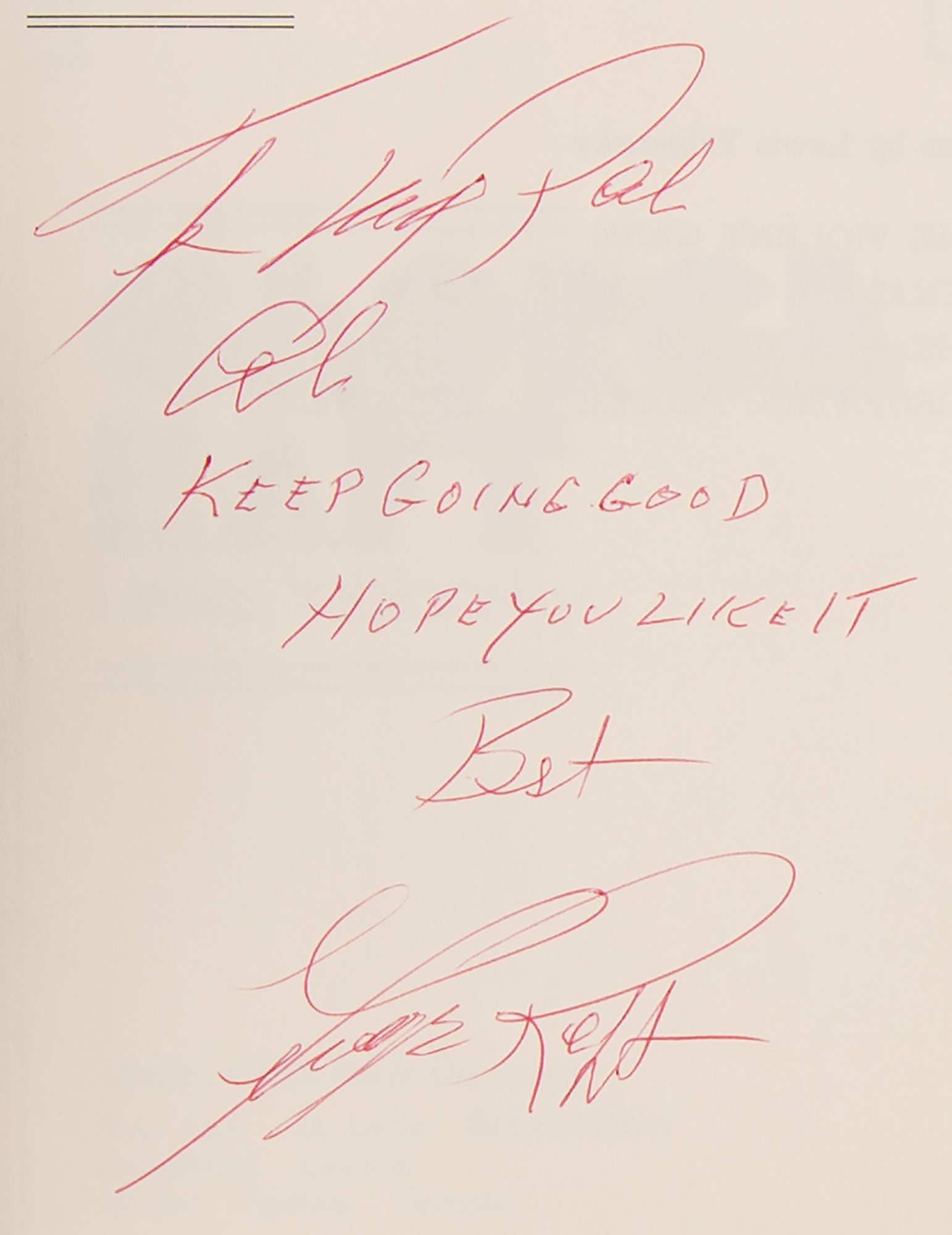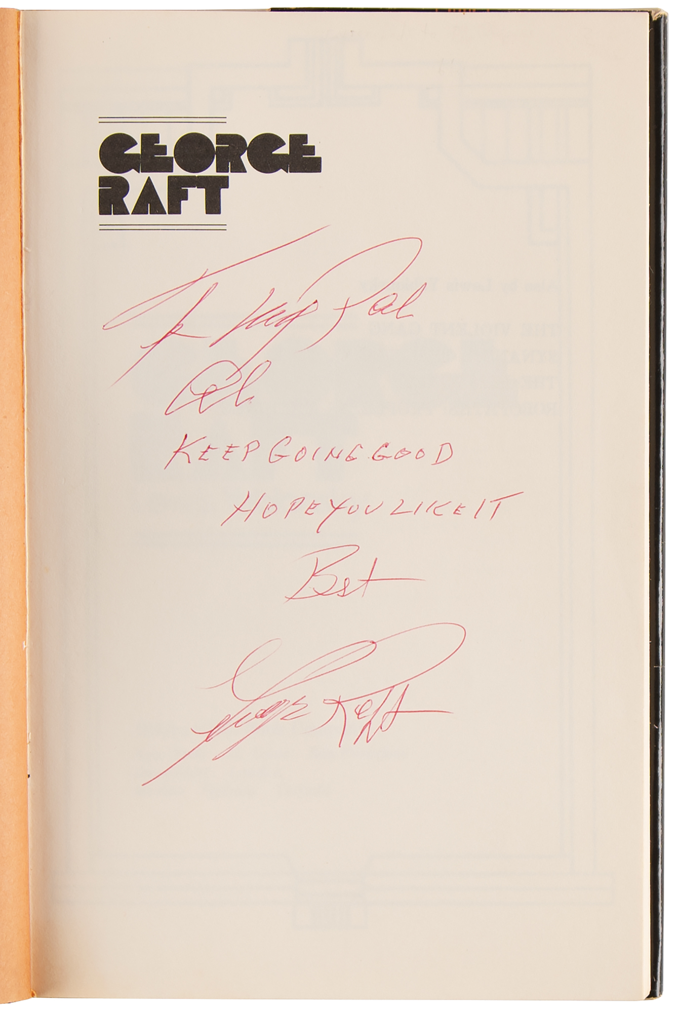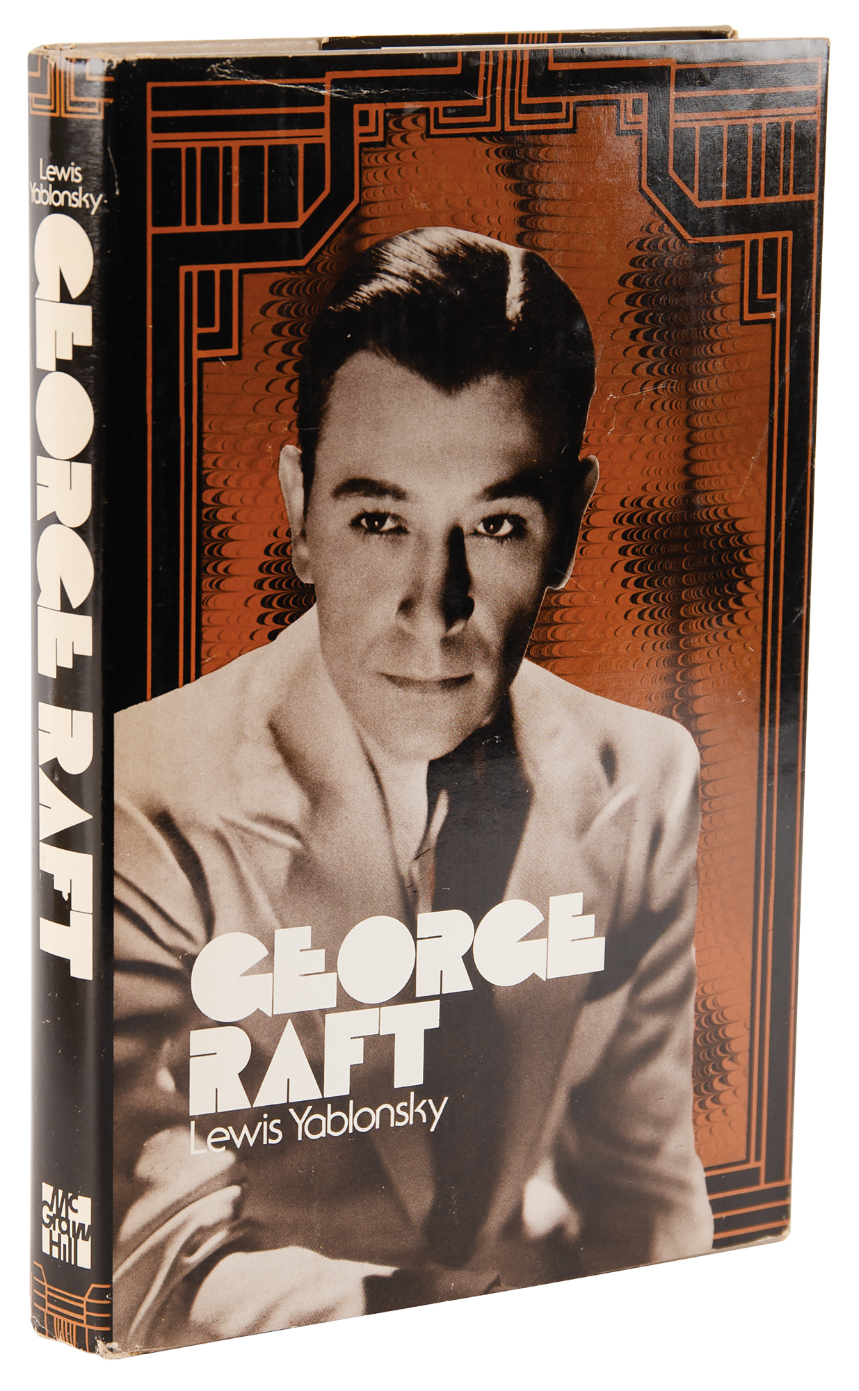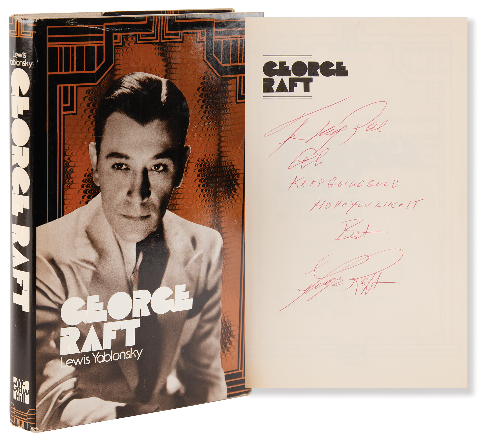 Signed book: George Raft. First edition. NY: McGraw-Hill, 1974. Hardcover with dust jacket, 6 x 9.25, 289 pages. Signed and inscribed on the half-title page in red ballpoint, "To my pal Al, Keep going good, hope you like it. Best, George Raft." In fine condition, with several pages creased at the corners.