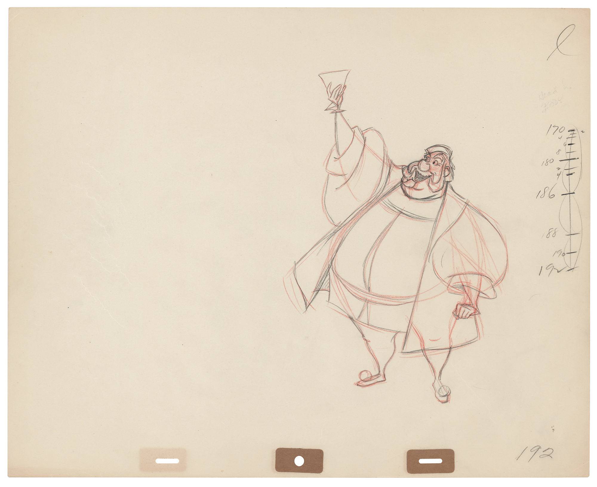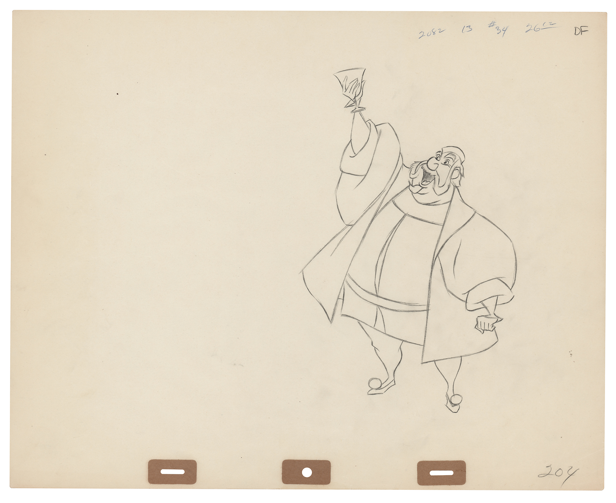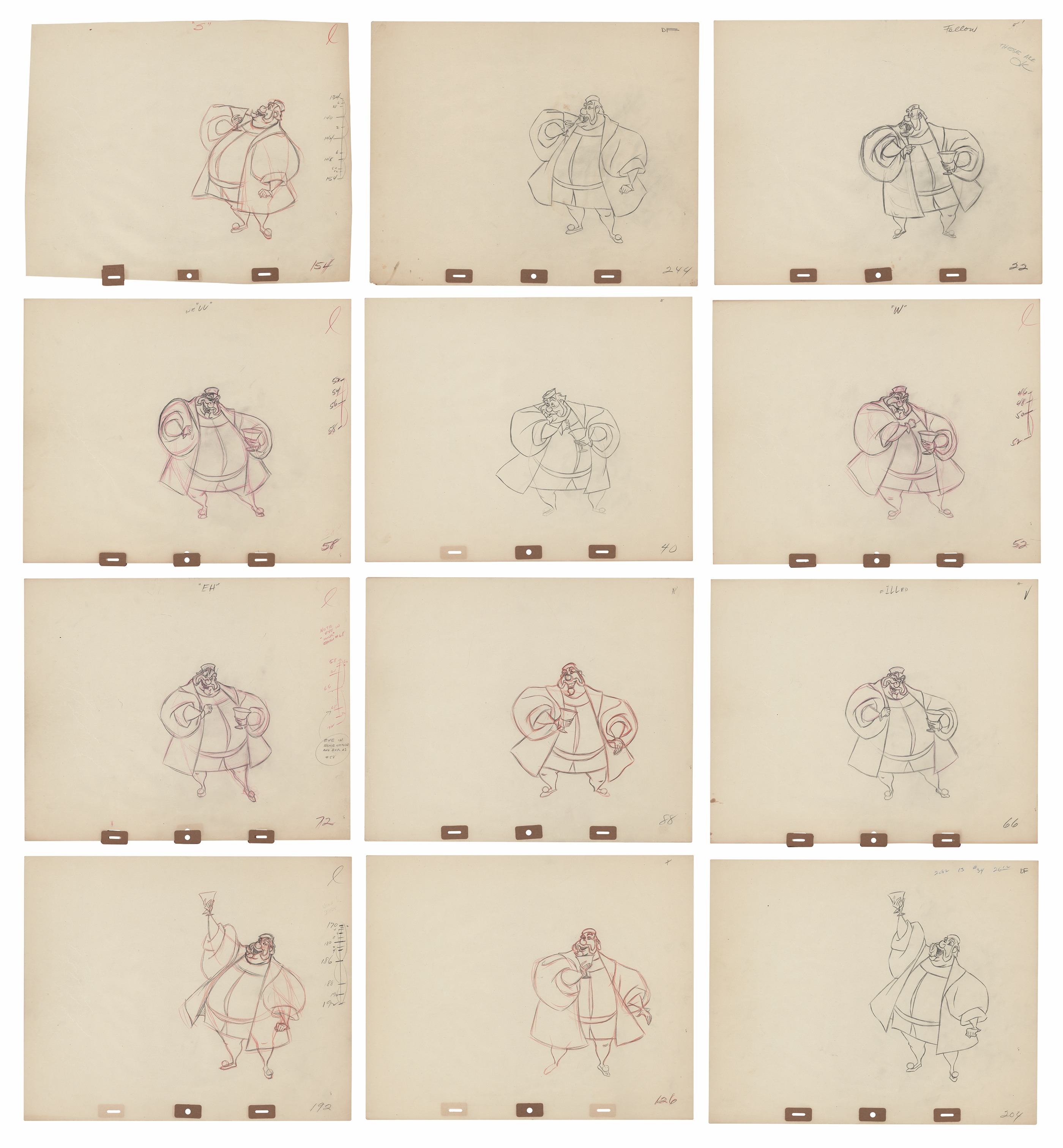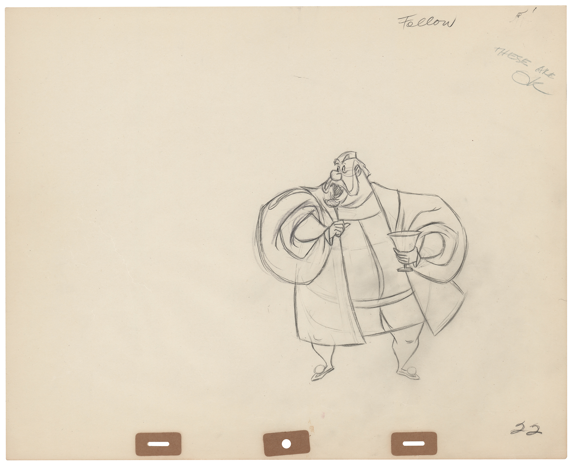 (Walt Disney Studios, 1959) Superb group of twelve original production drawings featuring King Hubert from Sleeping Beauty, showing the king raising his goblet while giving a wink; one drawing is annotated in the margin: "Eye in same attitude and exp. as #58." Accomplished in graphite and colored pencil on untrimmed 15.5 x 12.5 animation paper, marked in the lower corners with numbers ranging from "22" to "244," including number "58." Images measure from 5.5 x 6 to 6 x 9. In overall fine condition.